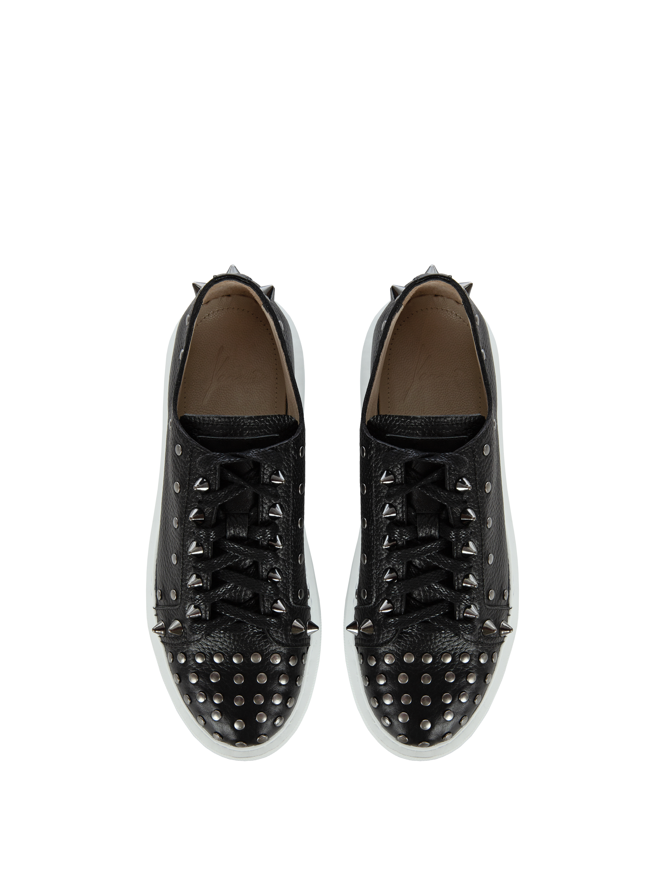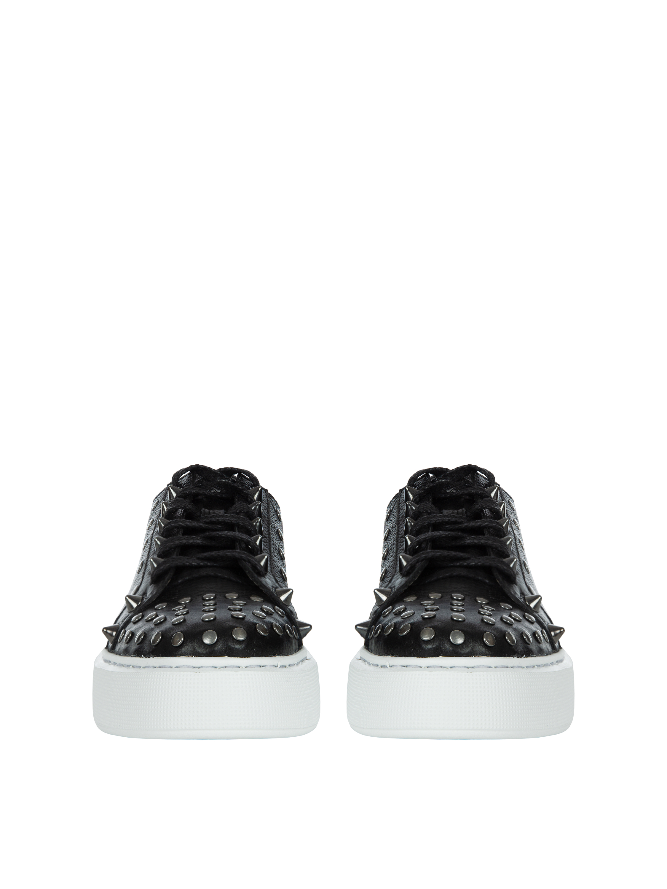Low black lace-up sneakers are made of genuine textured leather. The model with a contrasting wide sole is decorated with spikes and studs.