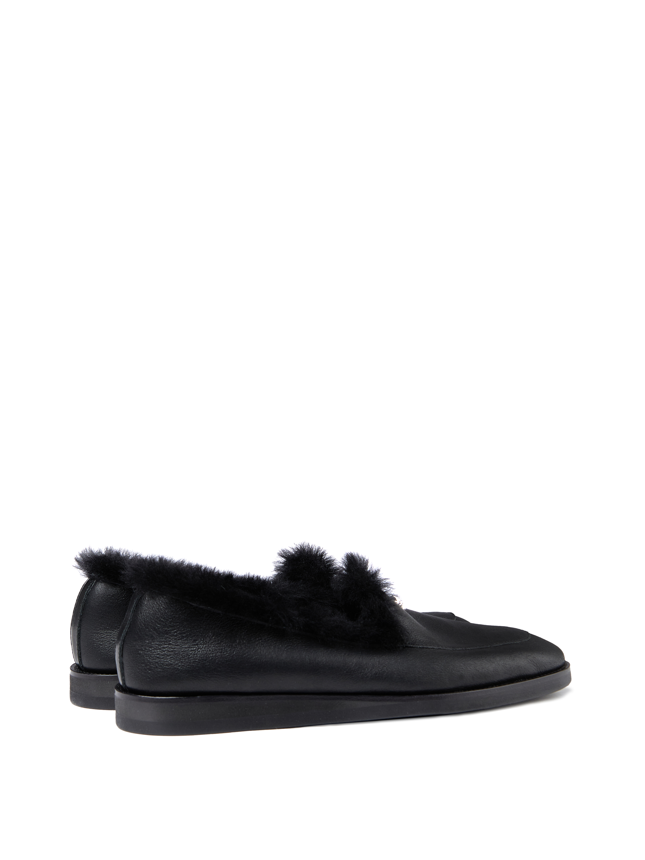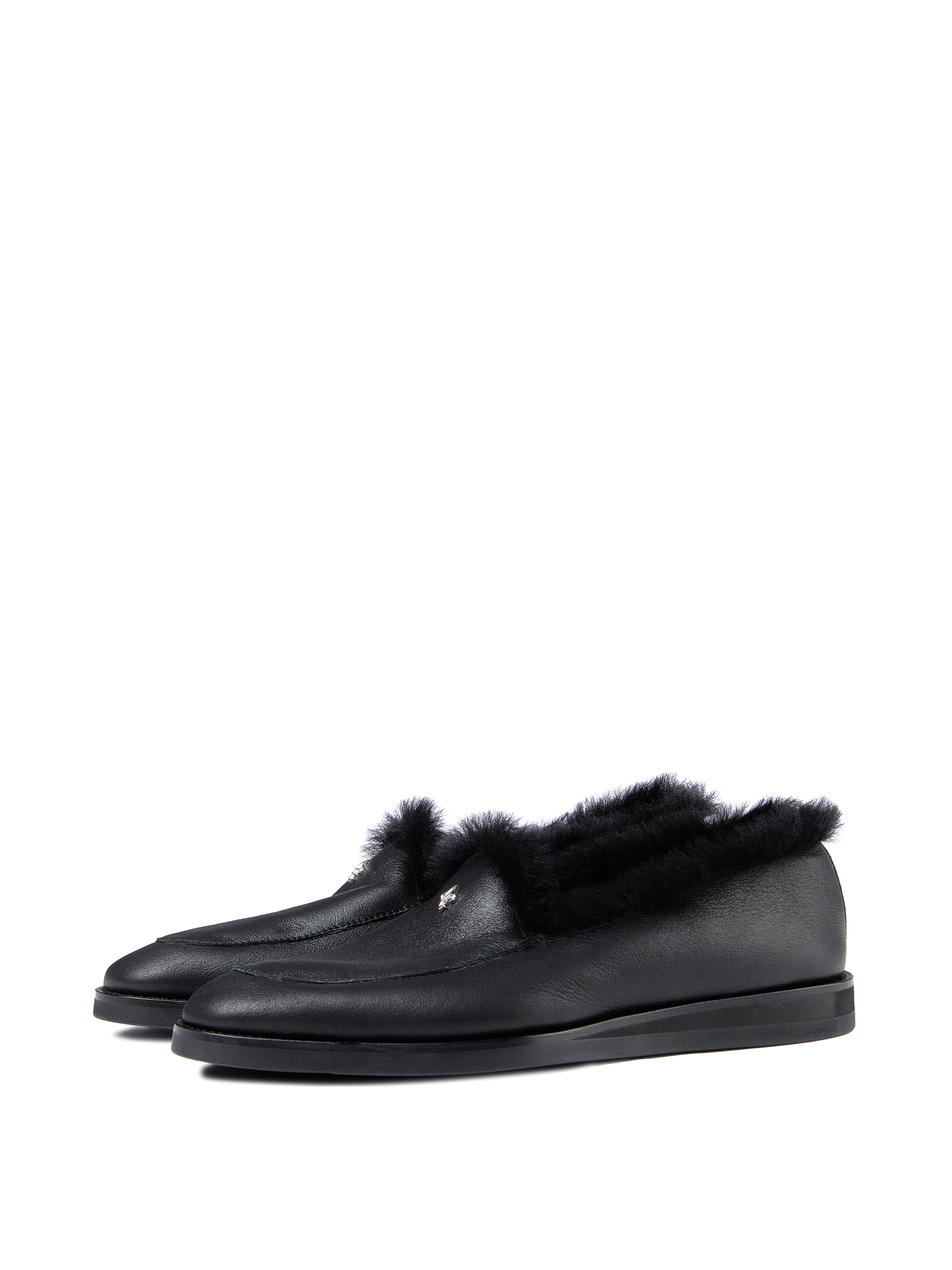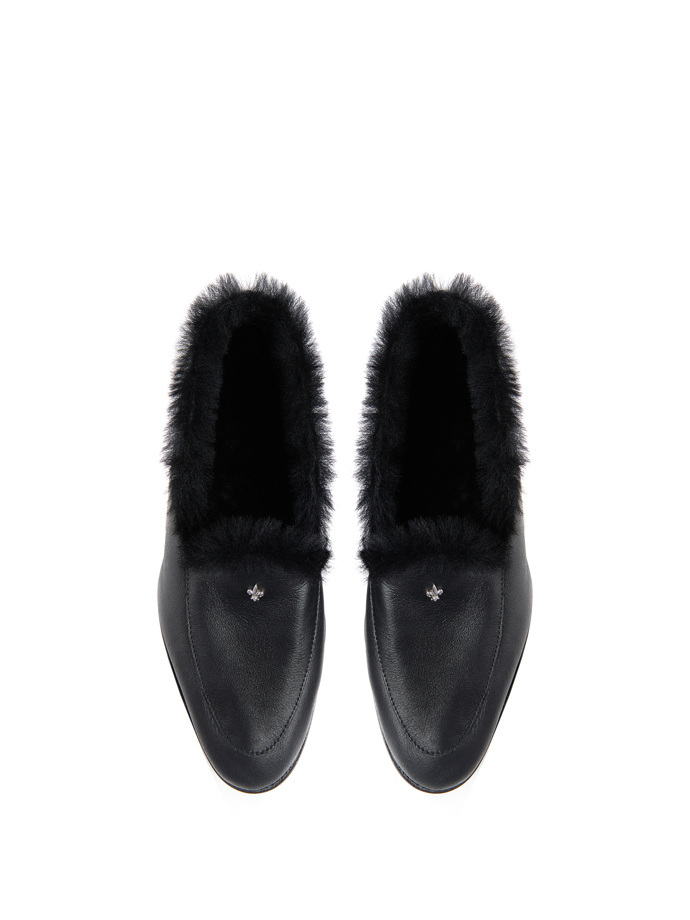 The loafers are made of black leather with matching natural sheepskin. The model is decorated with a metal heraldic lily.