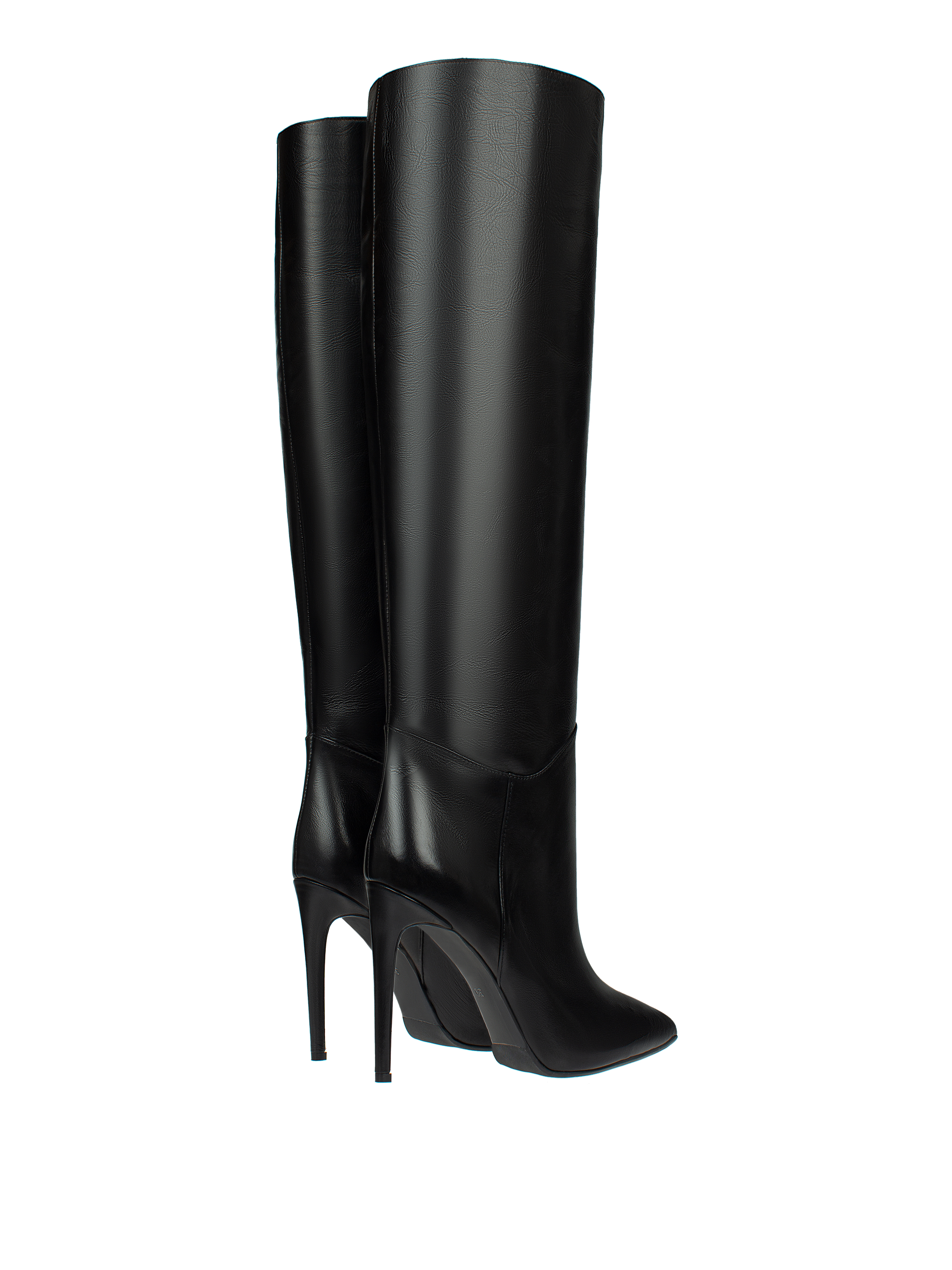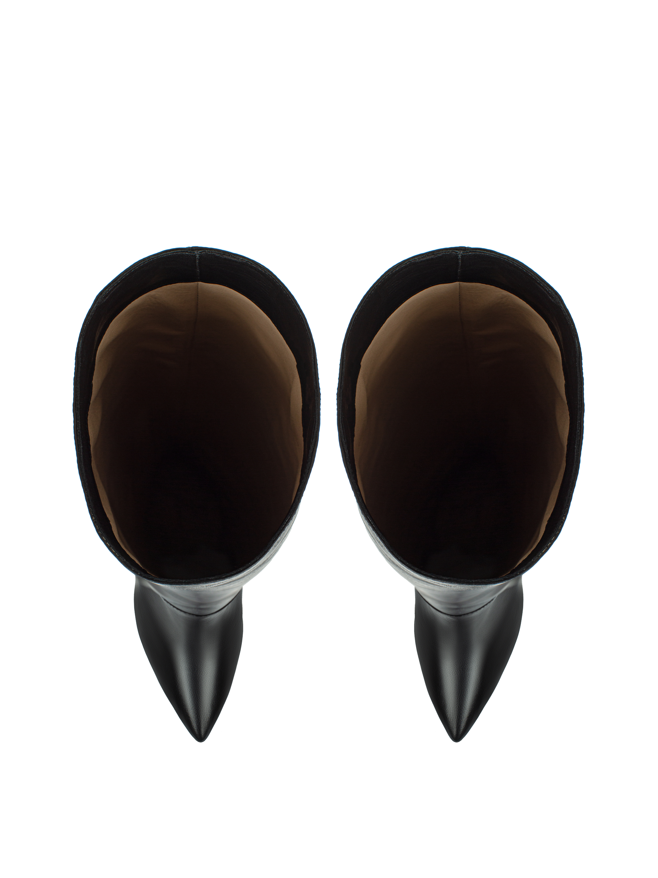 Black high-stiletto boots with a pointed toe will help create a memorable look. Thanks to the wide shaft, the boots without zippers are easy to put on and take off. The model is made of soft grained leather with a matte sheen.