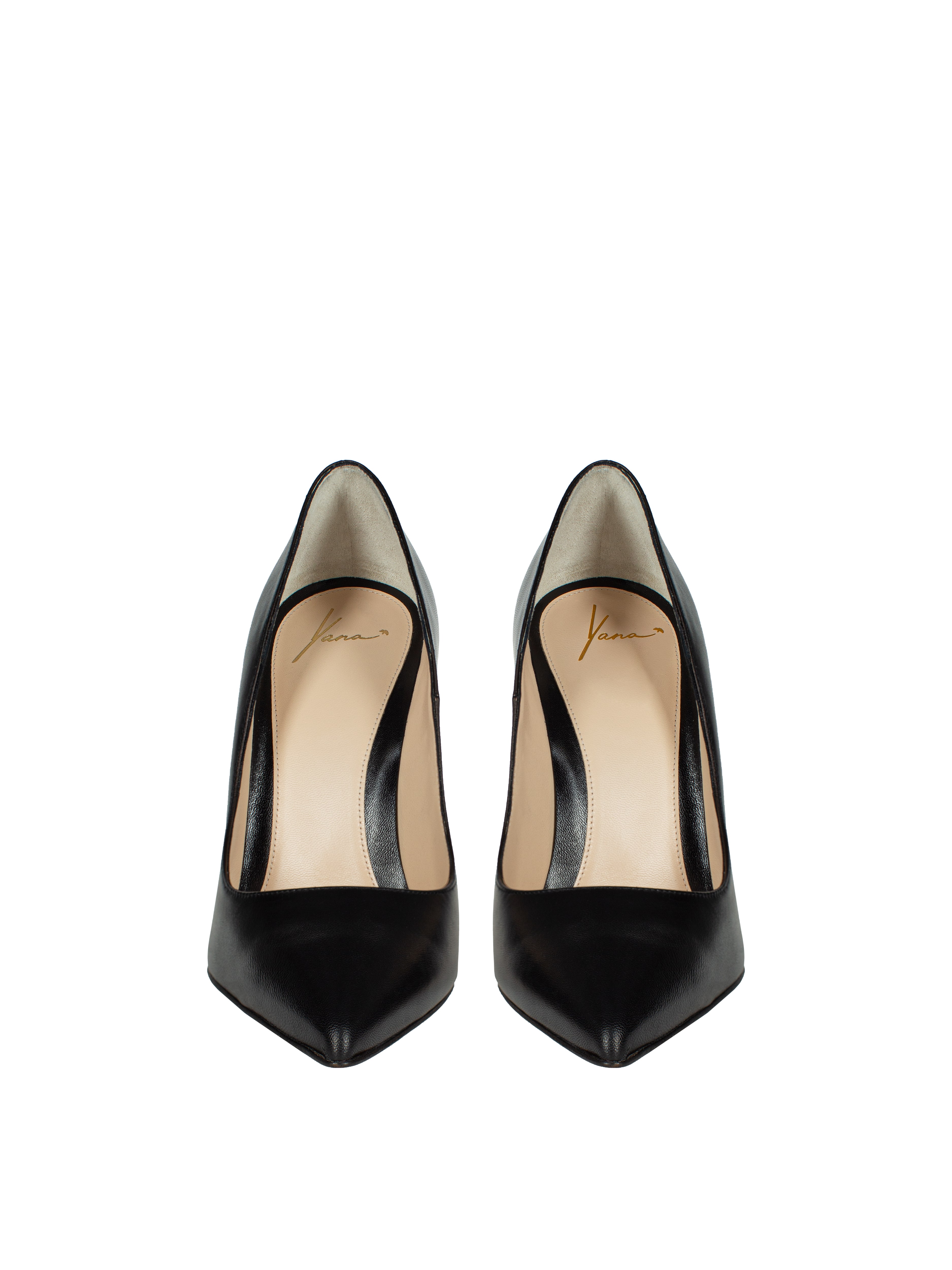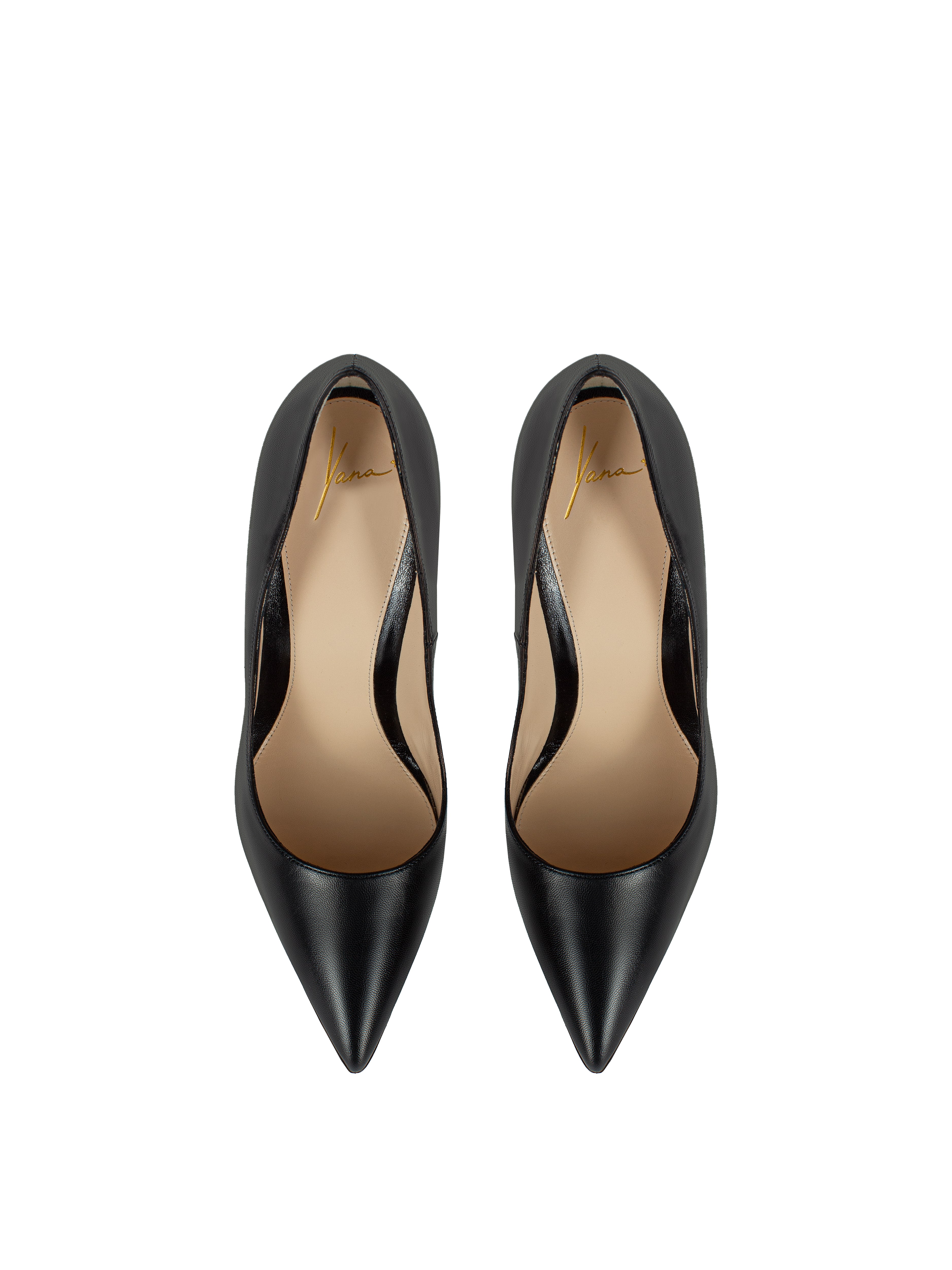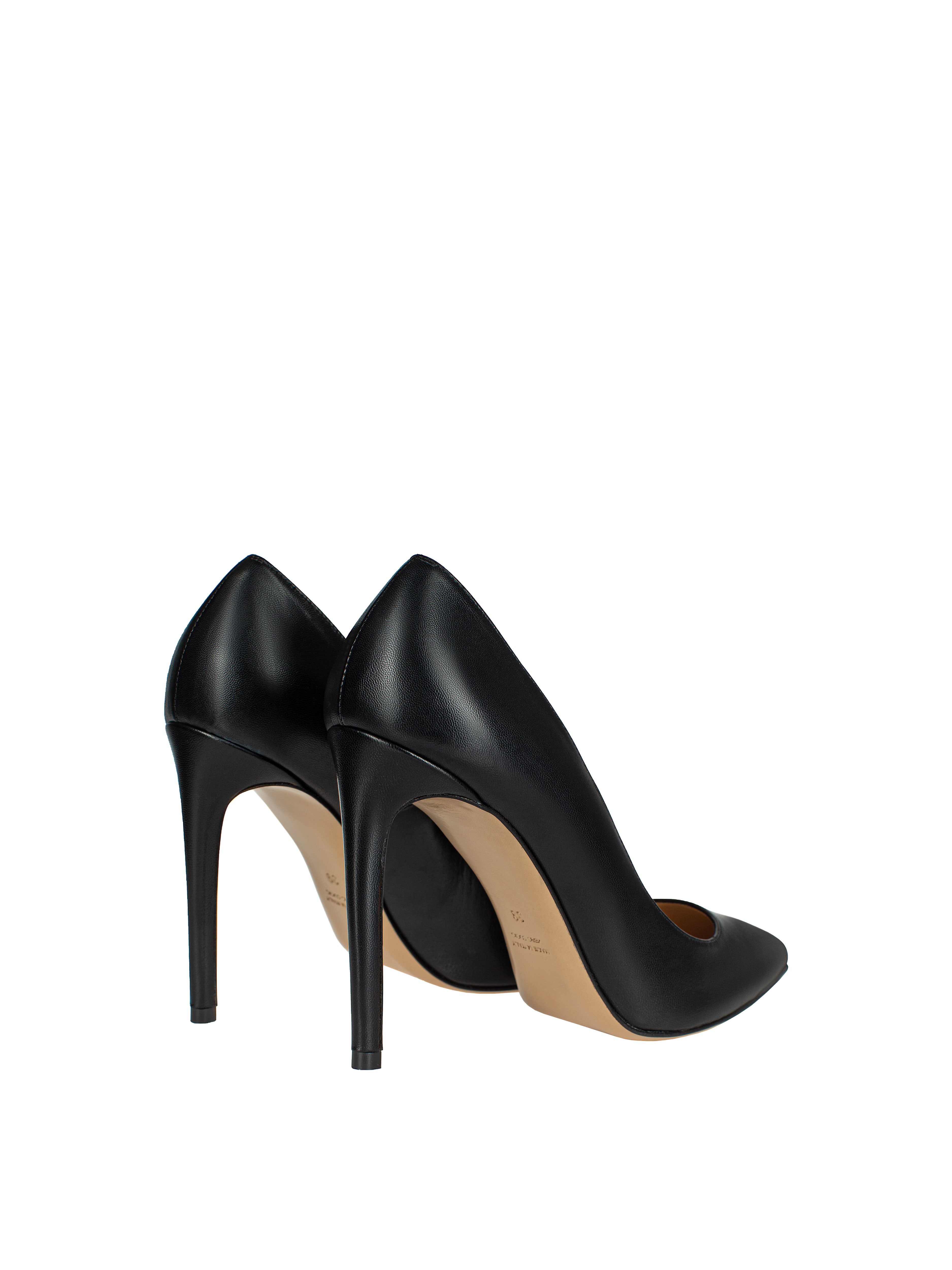 Classic black pumps are made of genuine goatskin. This versatile model with a thin stiletto heel and pointed toe will fit perfectly into any look.