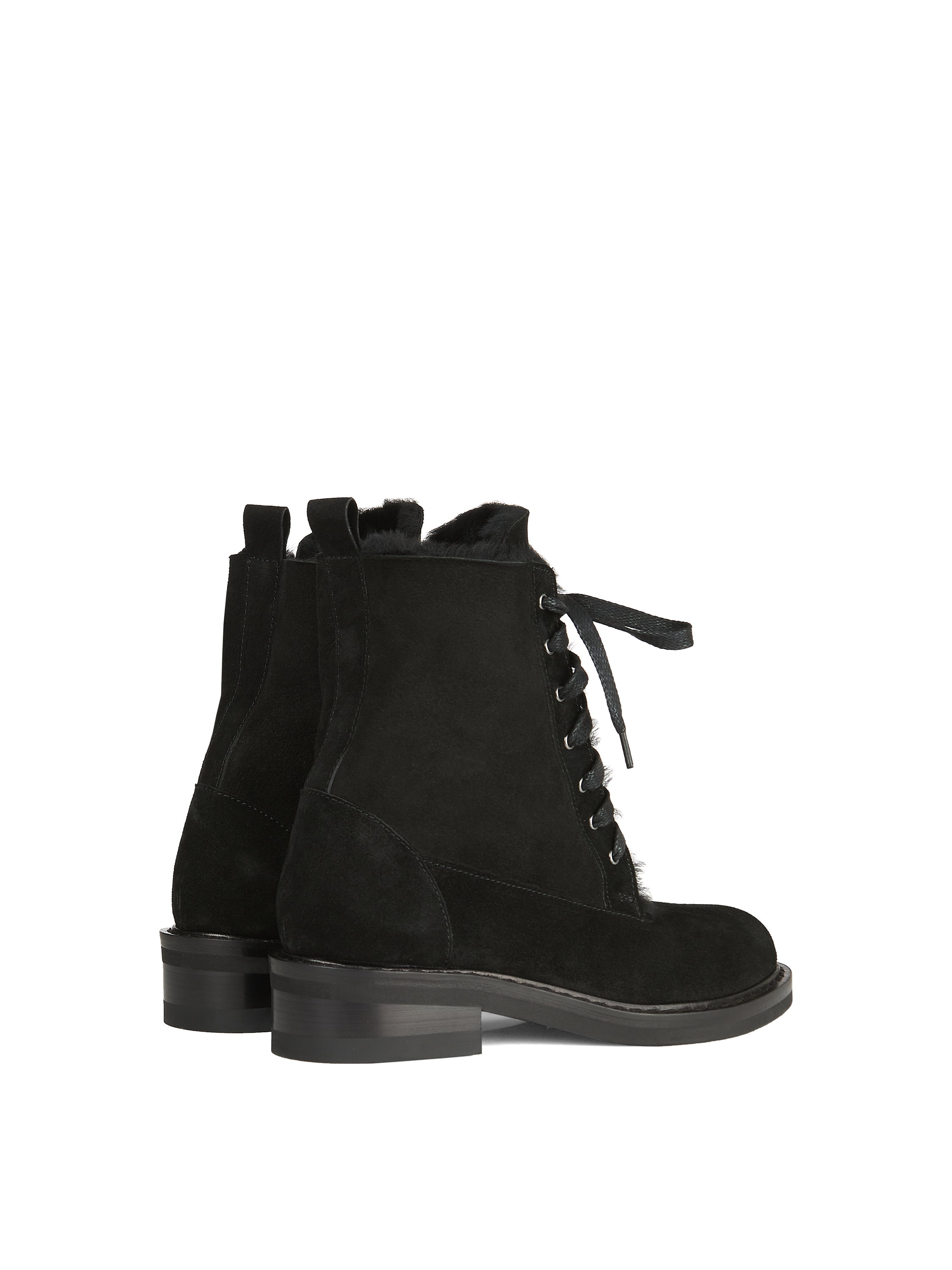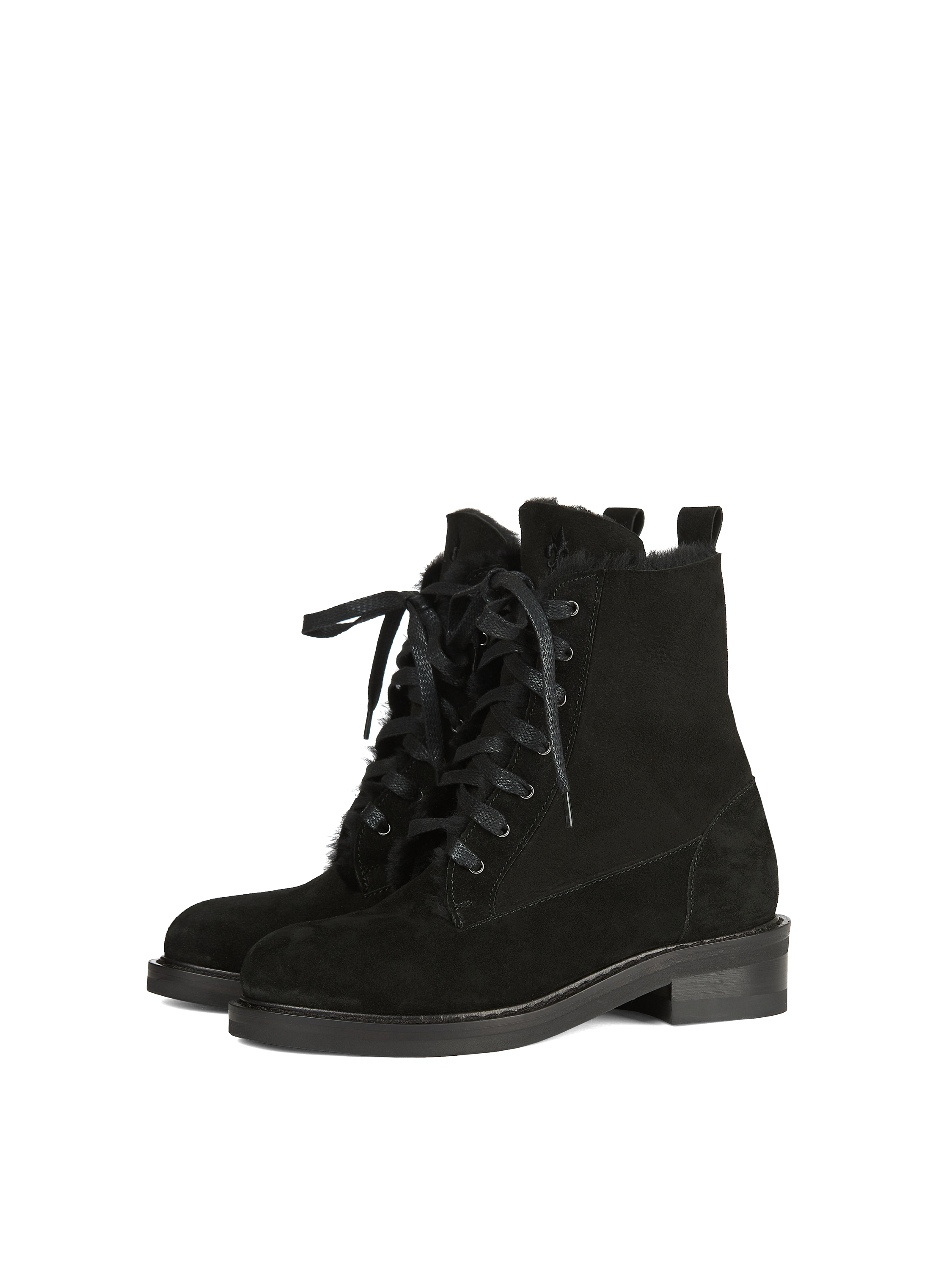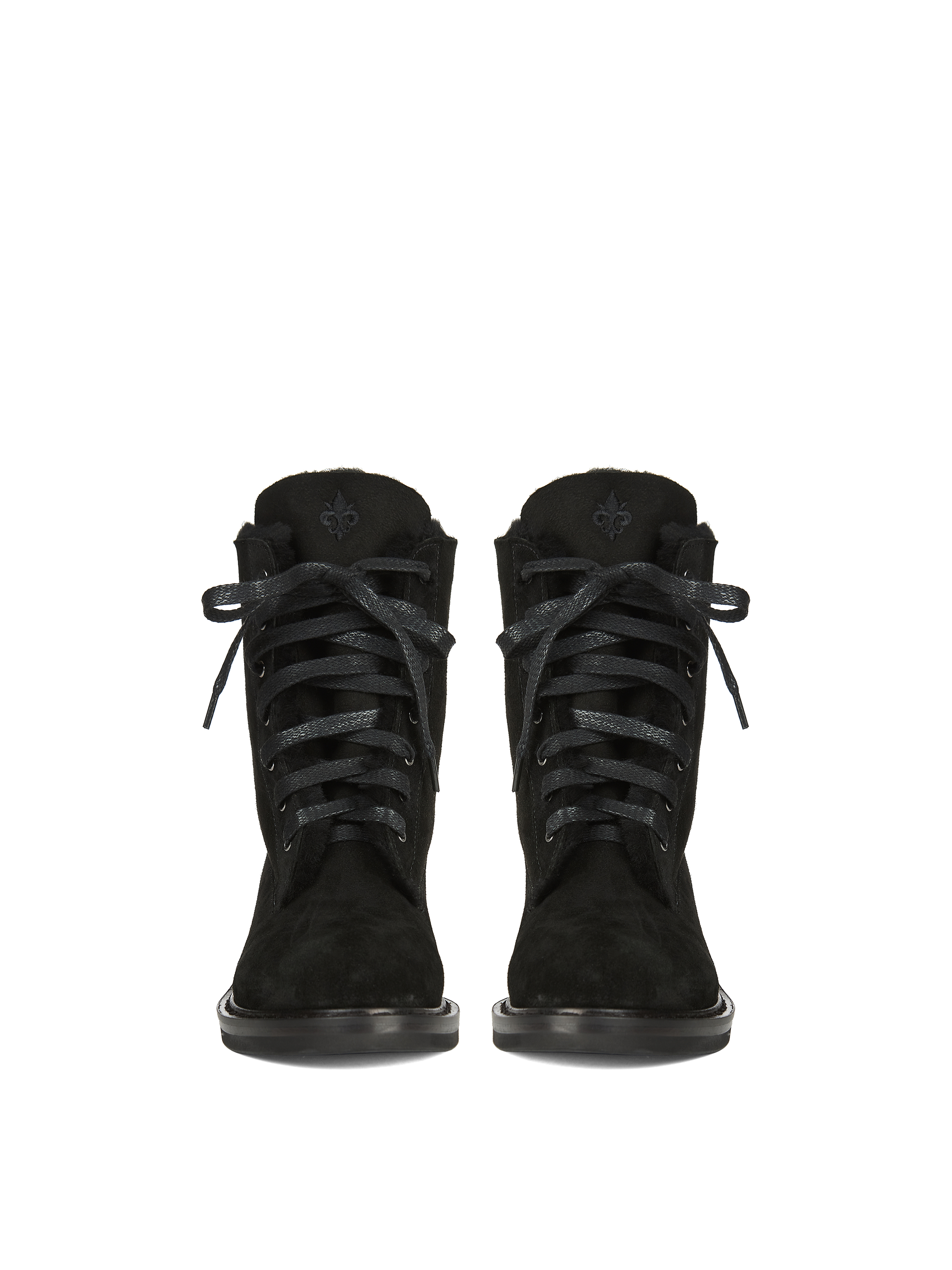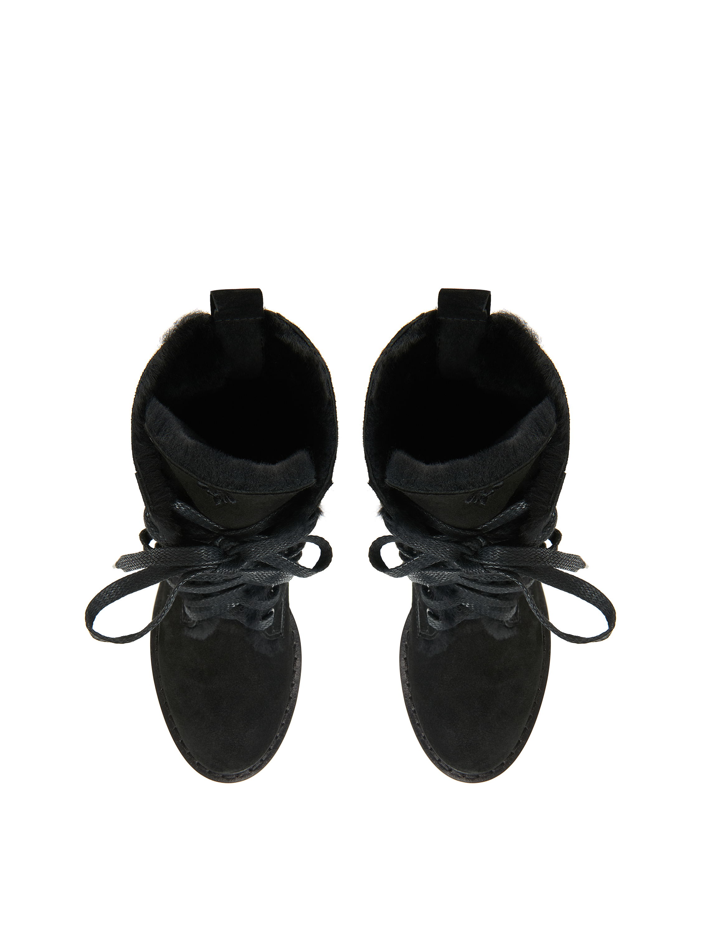 The high black boots with a round toe are made of genuine suede. The model is insulated with matching fur that maintains an optimal body temperature. The thick sole is made of pressed leather and protected by a rubber tread.