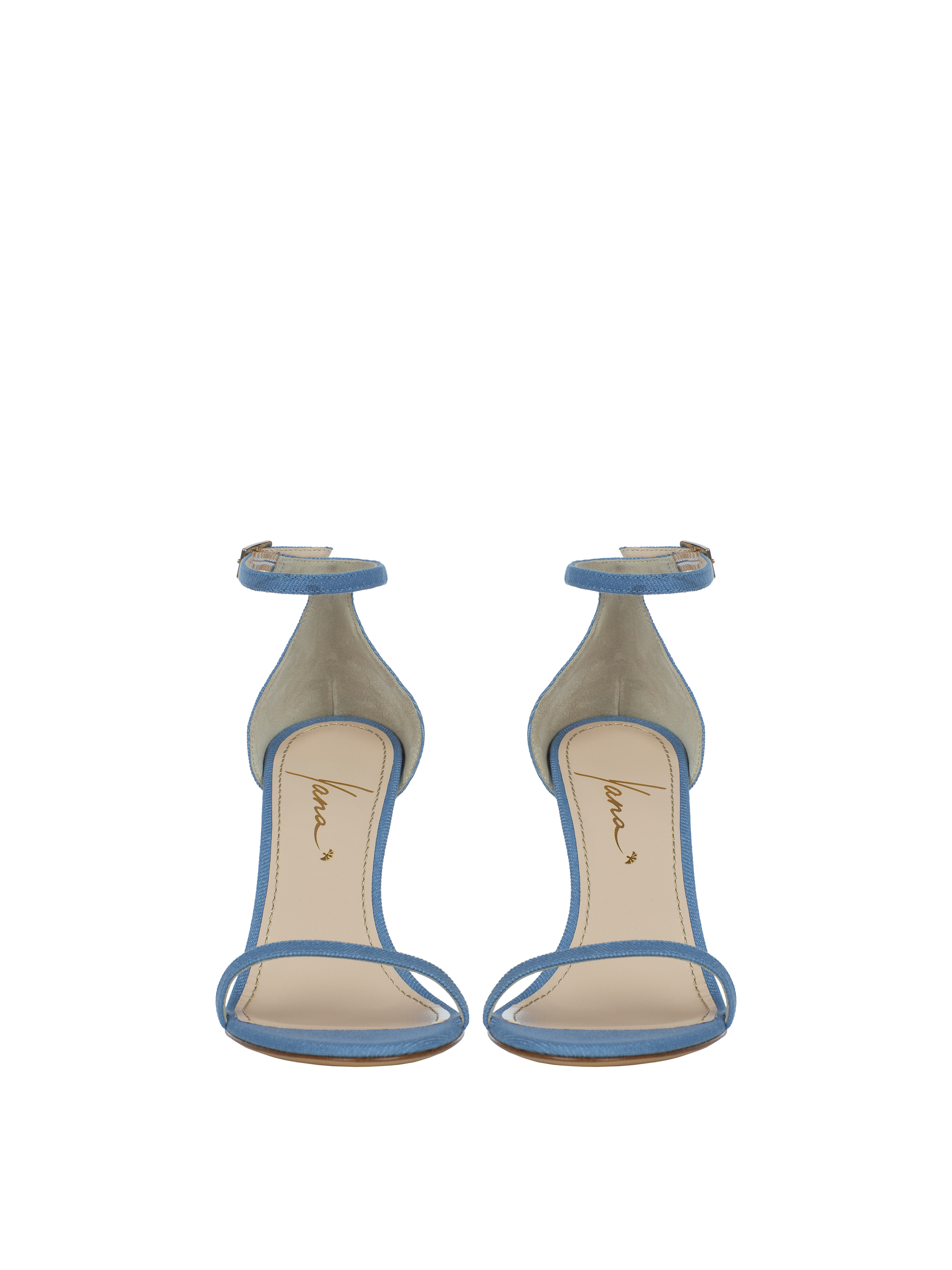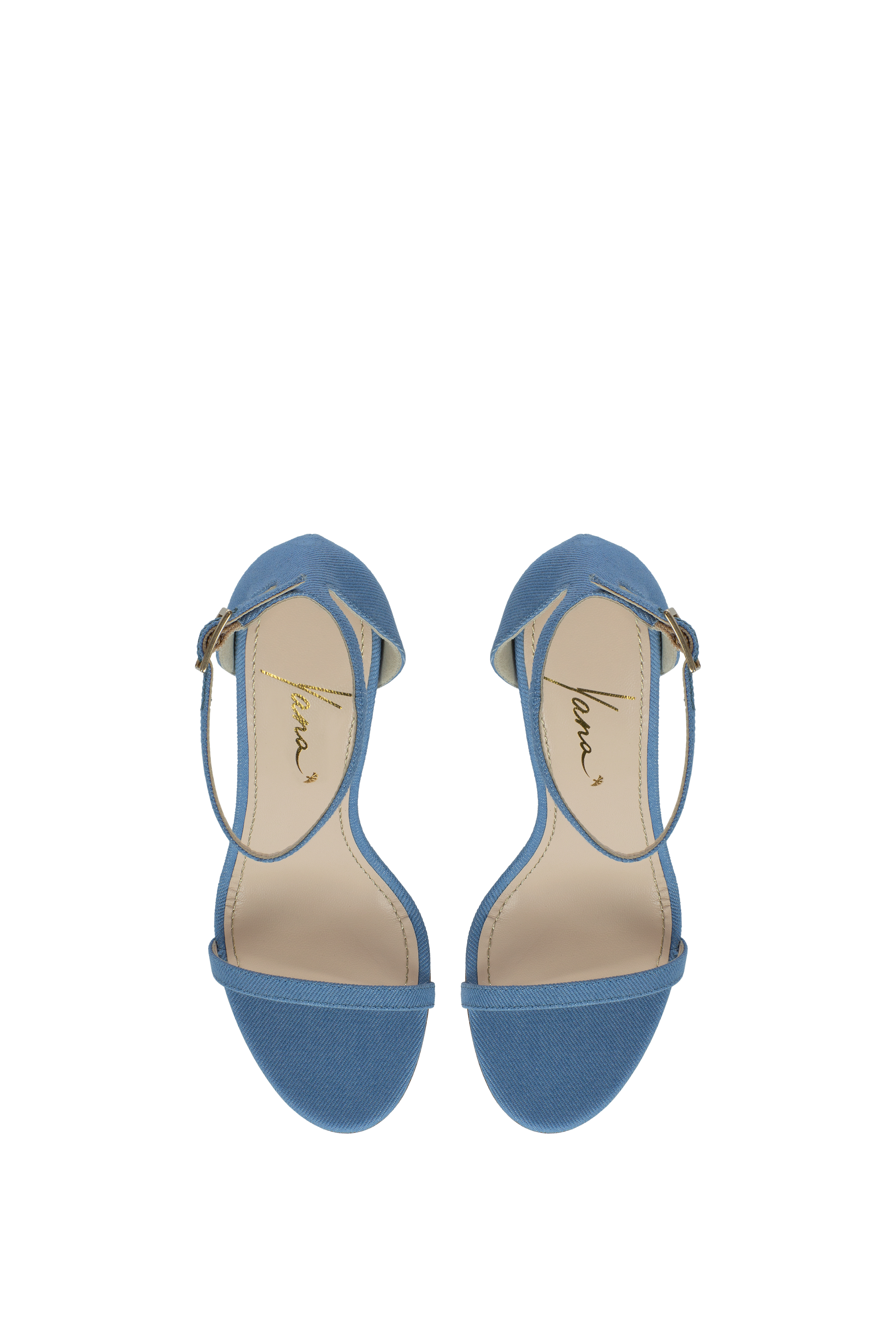 High stiletto-heel sandals are made of light blue denim. At the ankle there is a thin strap with a buckle that securely fixes the shoe on the foot.