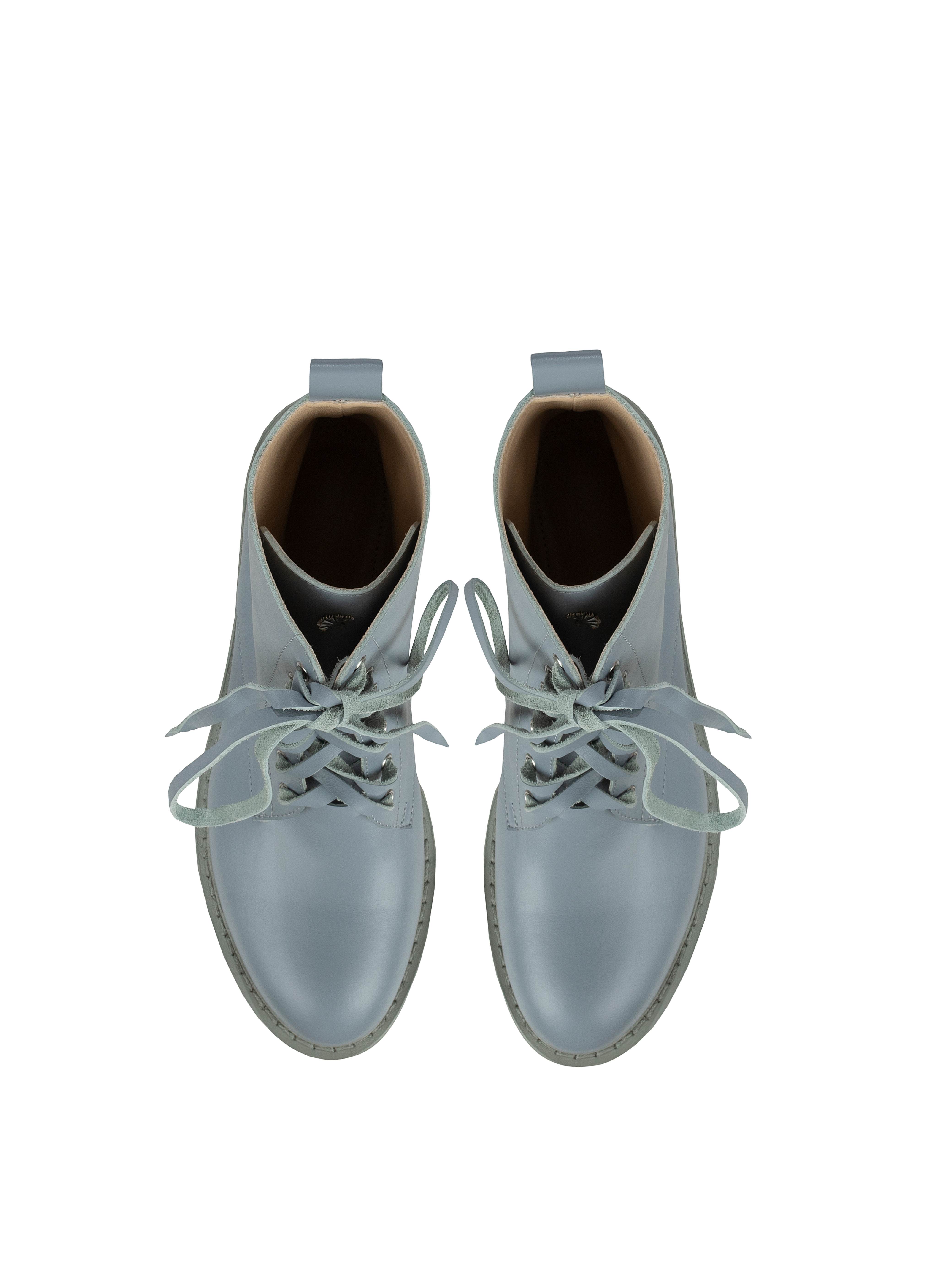 Light blue high-top boots pair equally well with jeans and with a favorite dress. Smooth genuine leather was chosen for tailoring. The laces in a matching shade to the boots are made of the same material.
