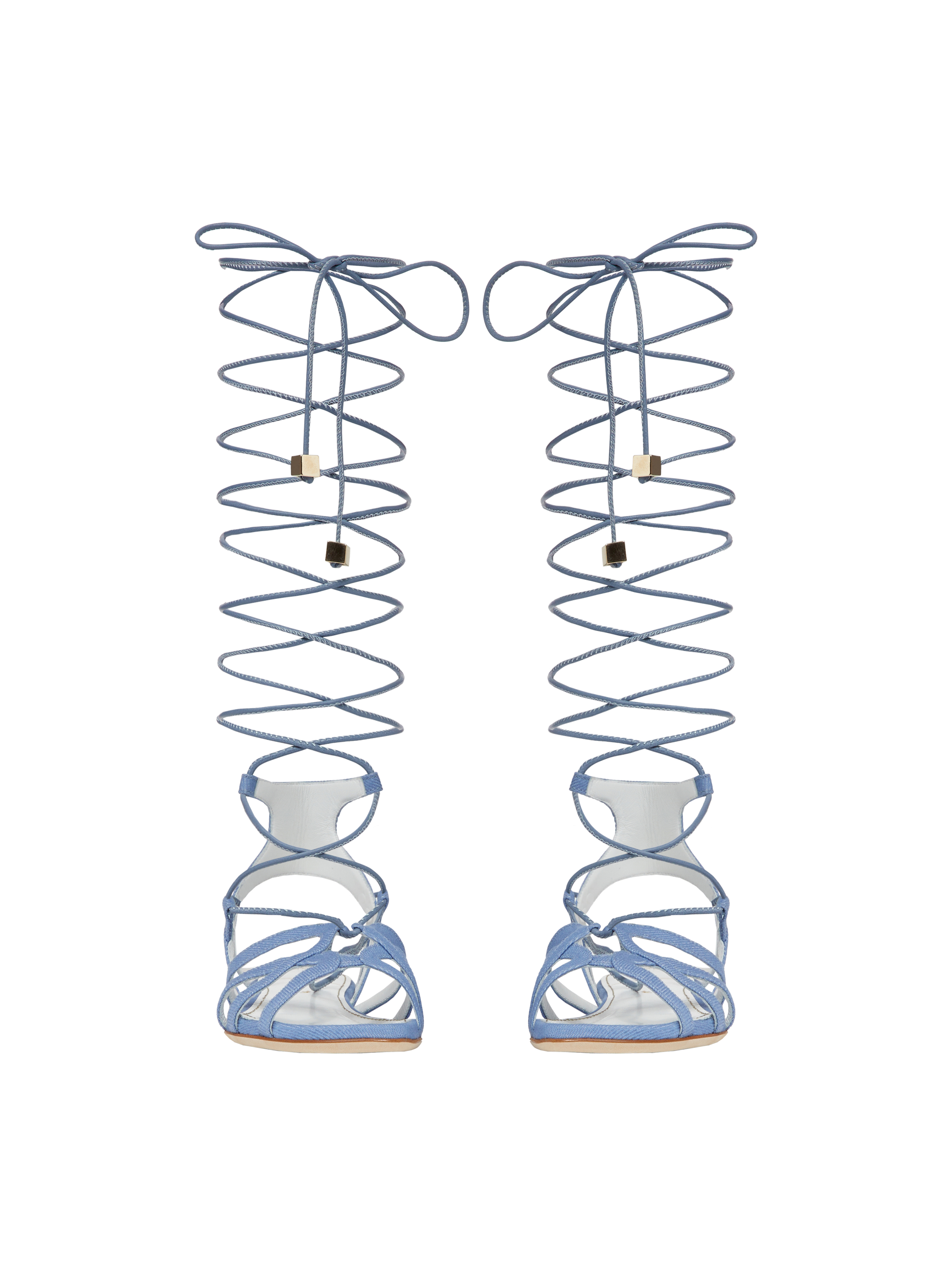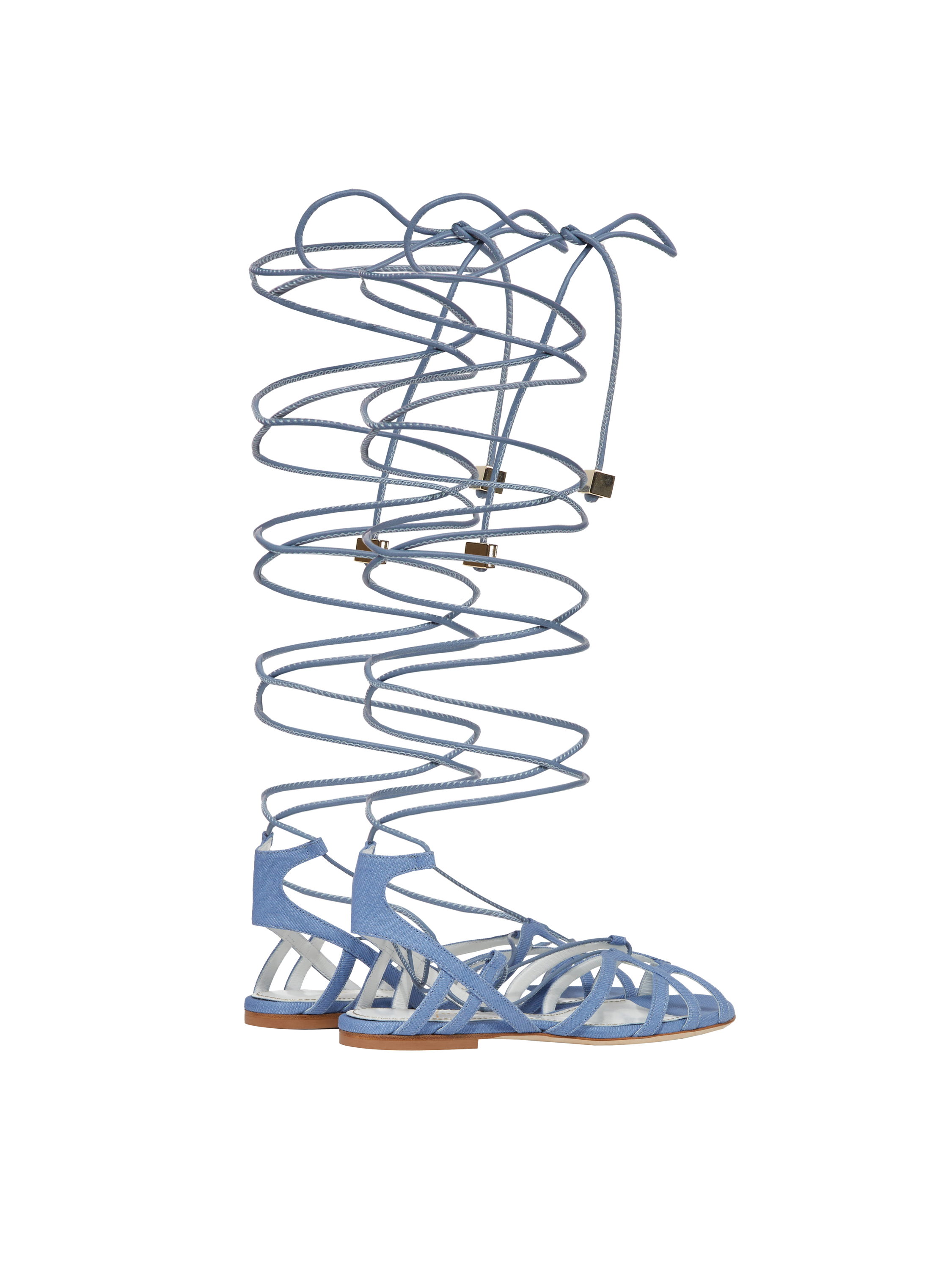 The high gladiator sandals are made of blue denim and soft genuine leather. The long criss-cross lacing will accentuate the slimness of your legs, while the small stacked heel will prevent fatigue after long walks.