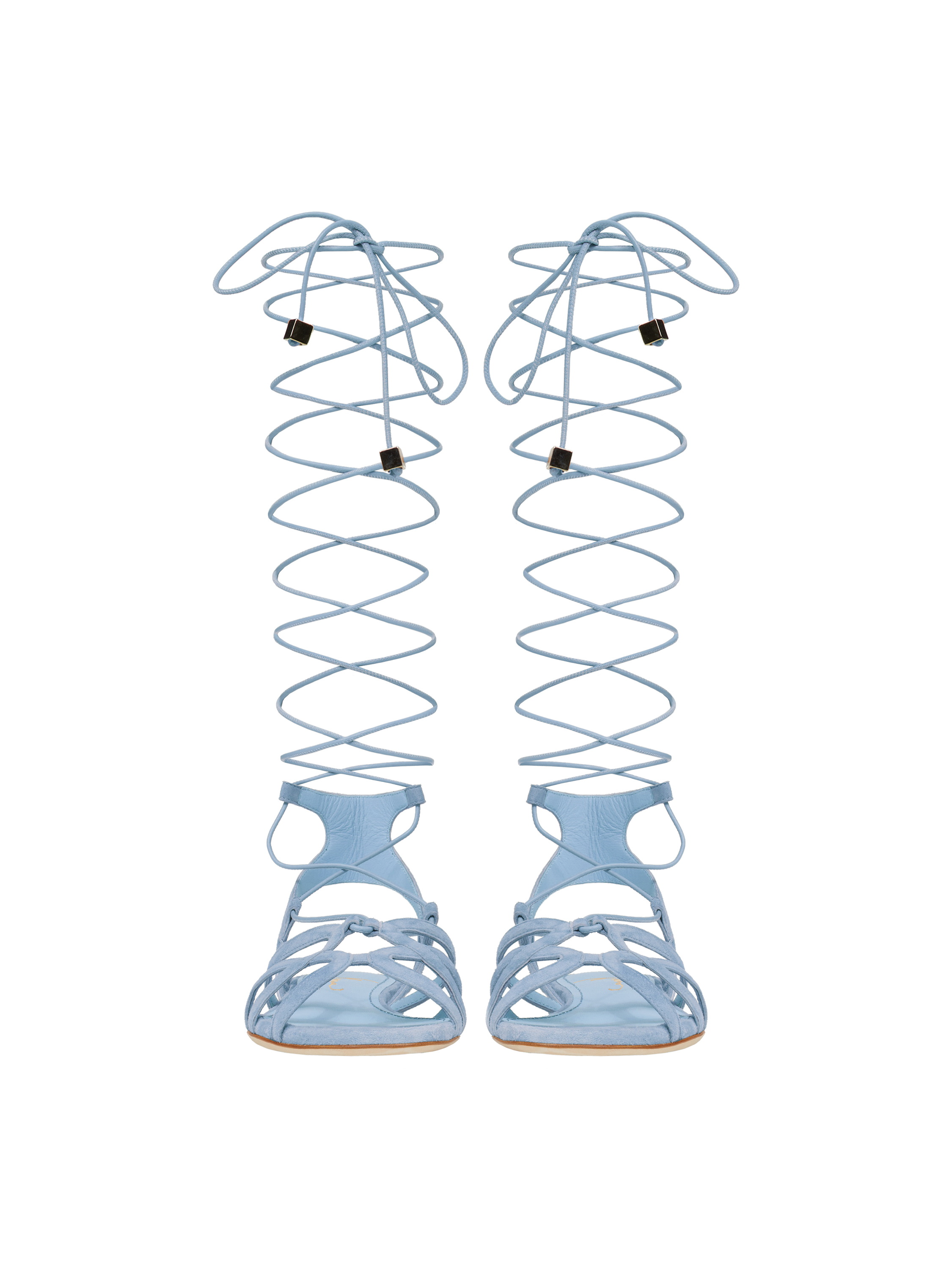 The high gladiator sandals are made of soft genuine suede in blue. The long criss-cross lacing will accentuate the slimness of your legs, while the small stacked heel will prevent fatigue after long walks.