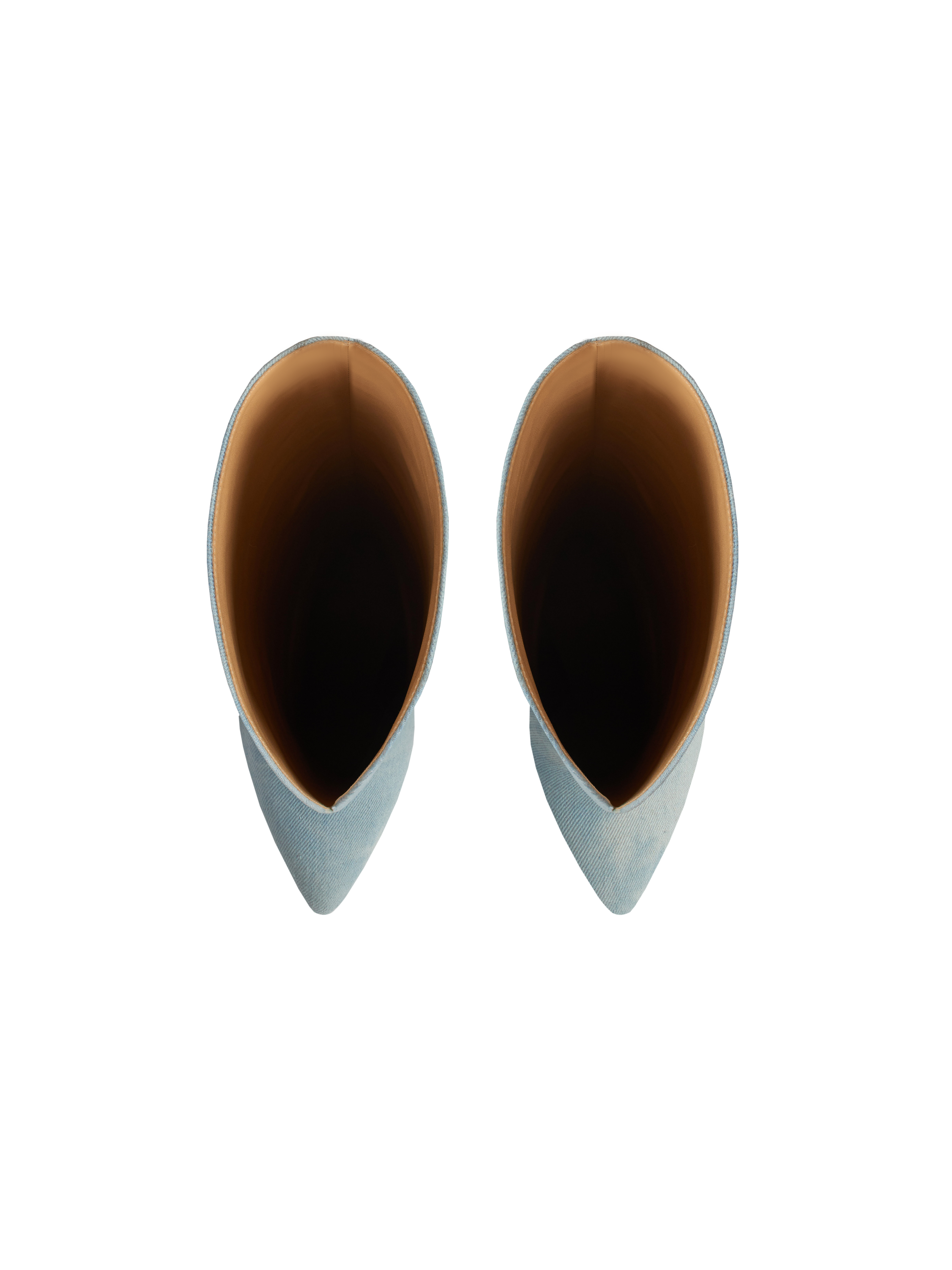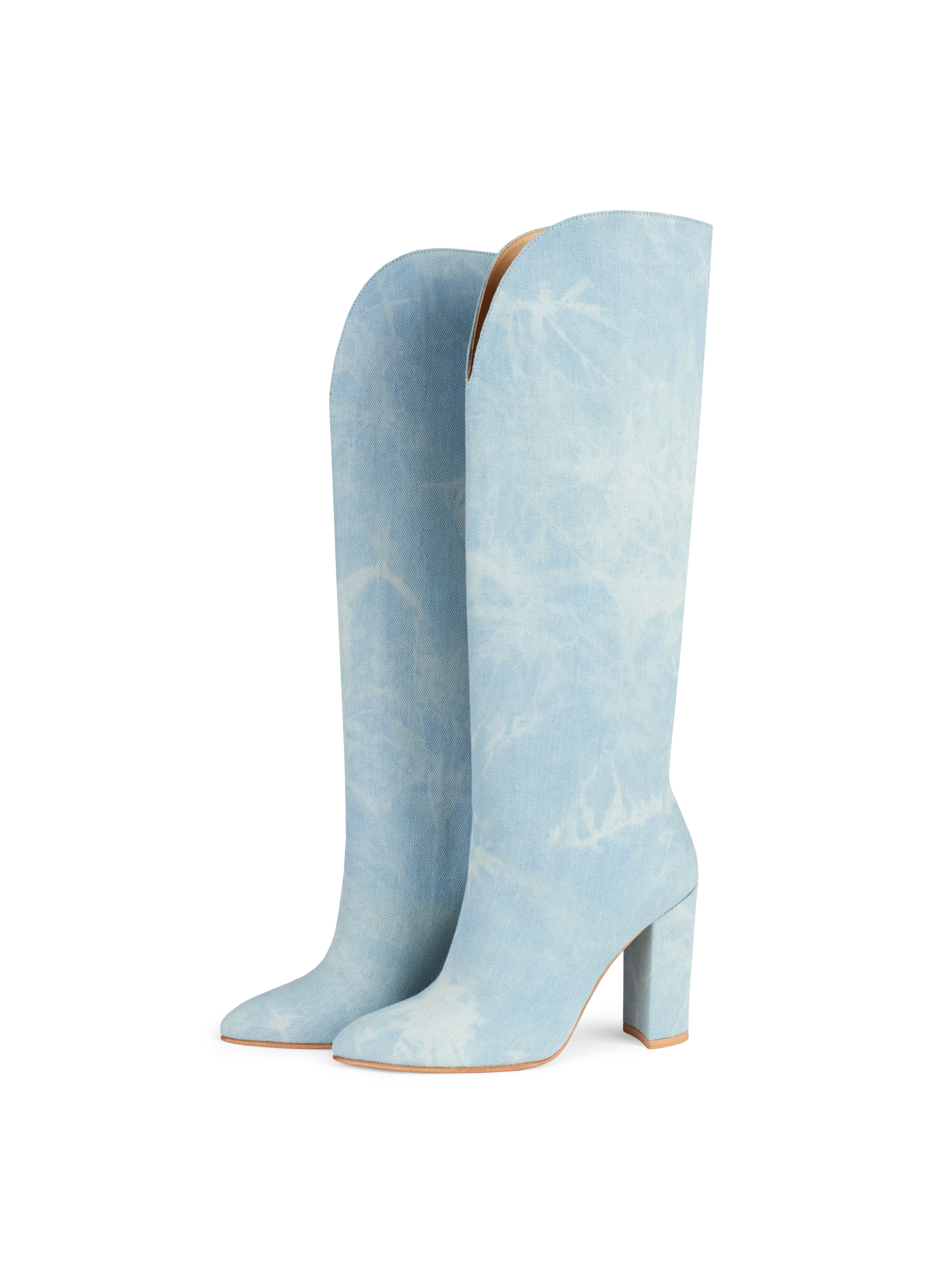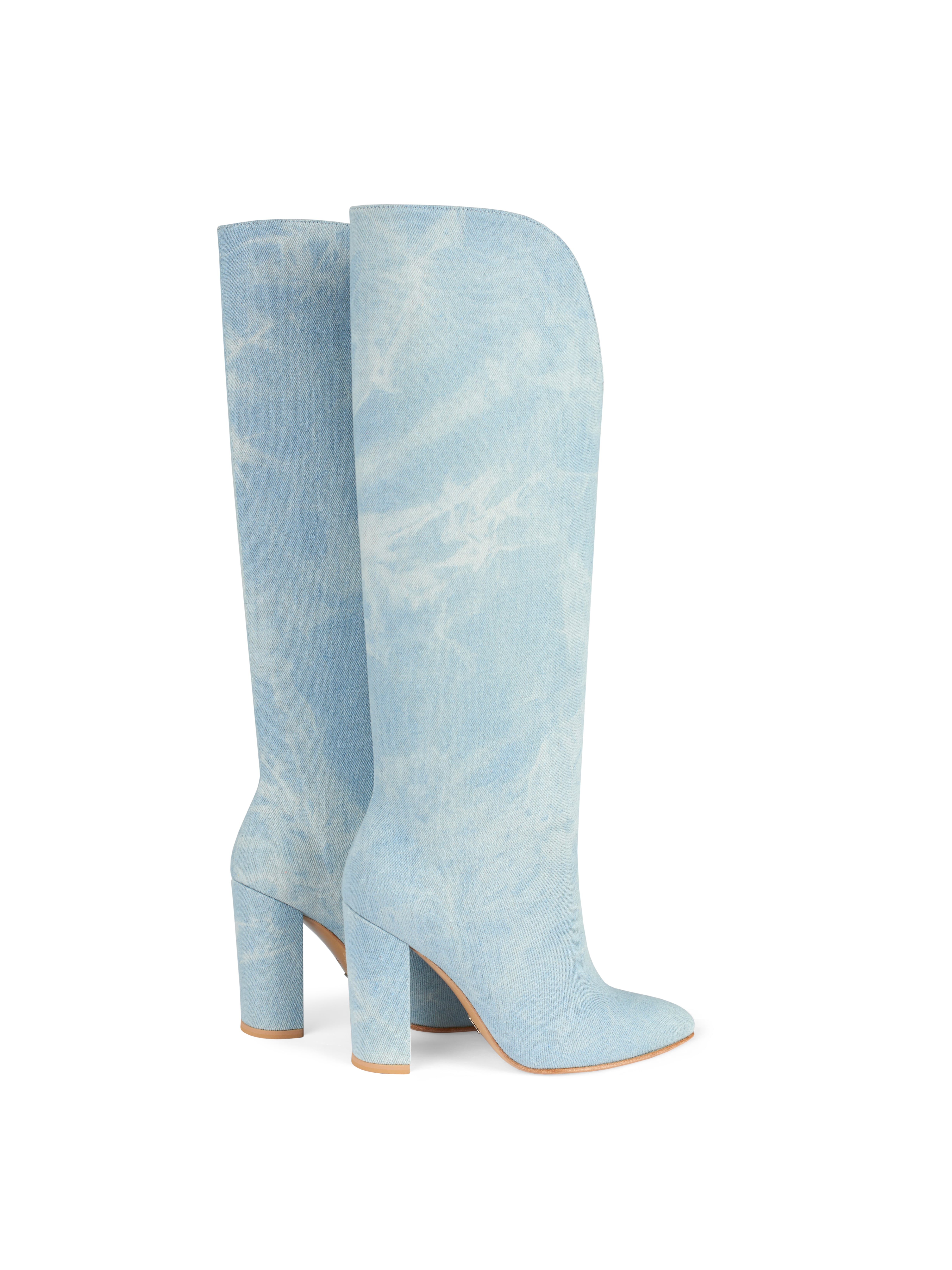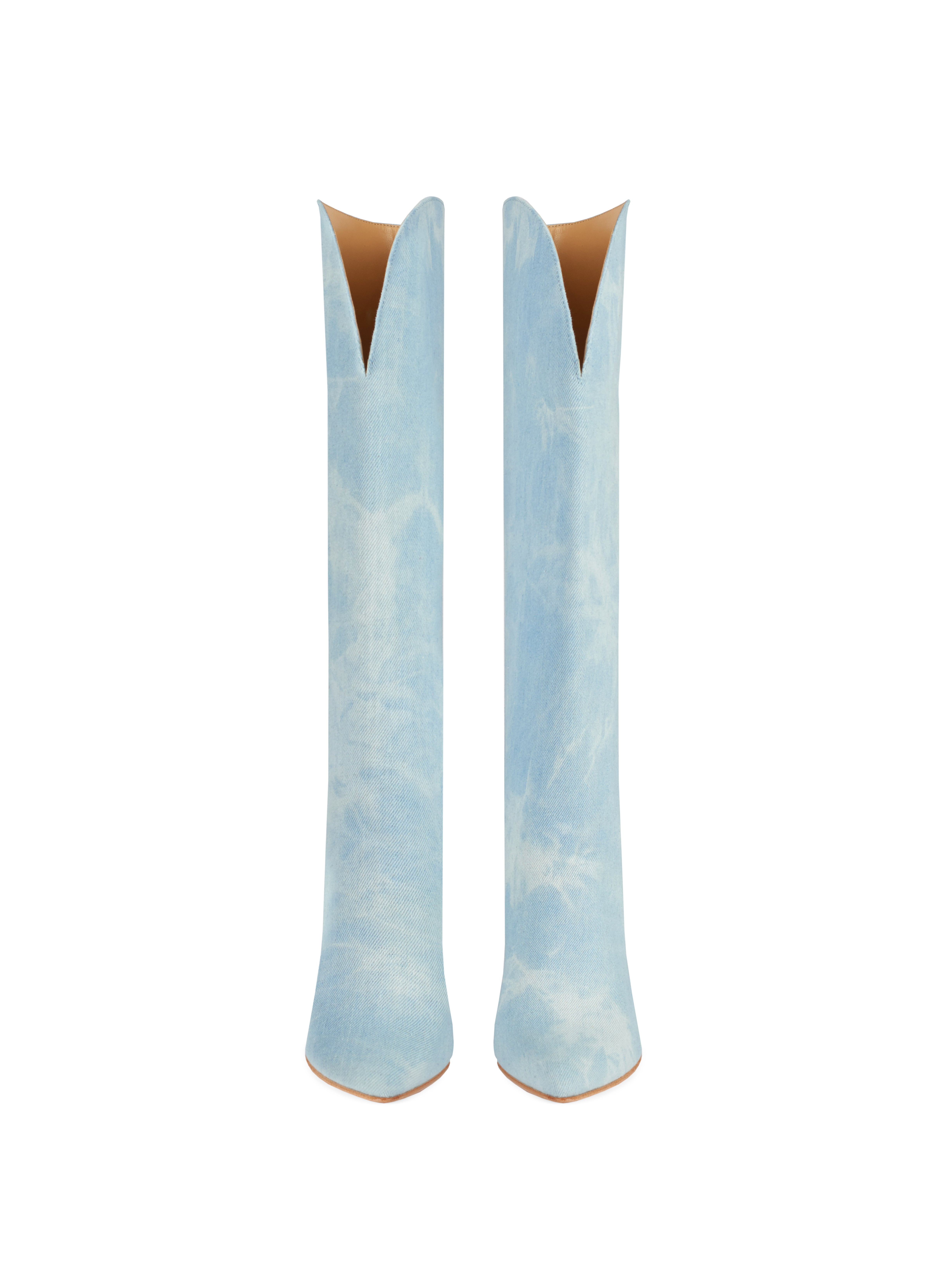 Light blue high-heeled boots with a tapered toe will help create a memorable look. They are made of soft beige leather on the inside, and on the outside are covered with light blue denim with streaks in the tie-dye technique. Thanks to the wide shaft with a shaped top, the boots without zippers are easy to put on and take off.