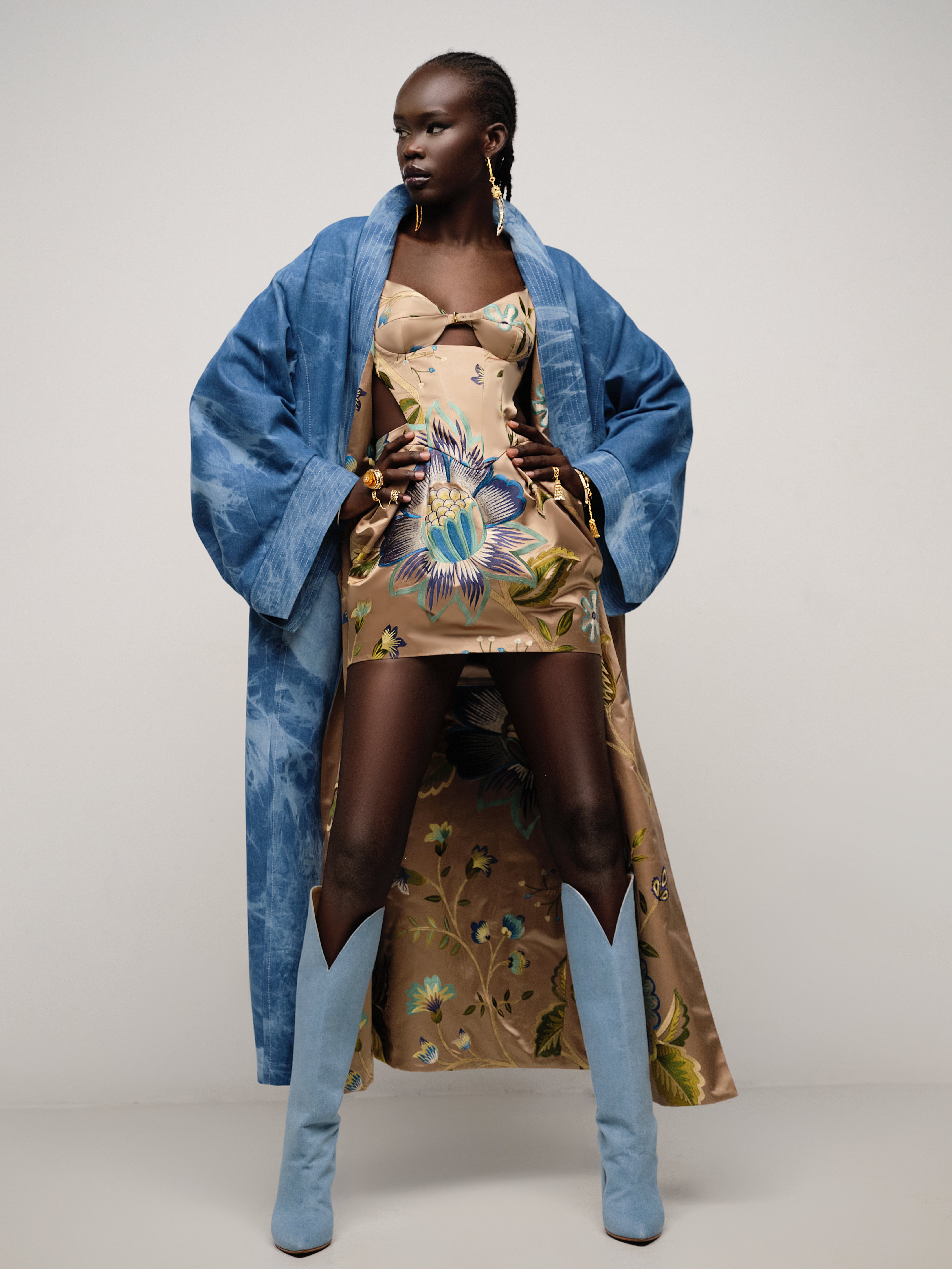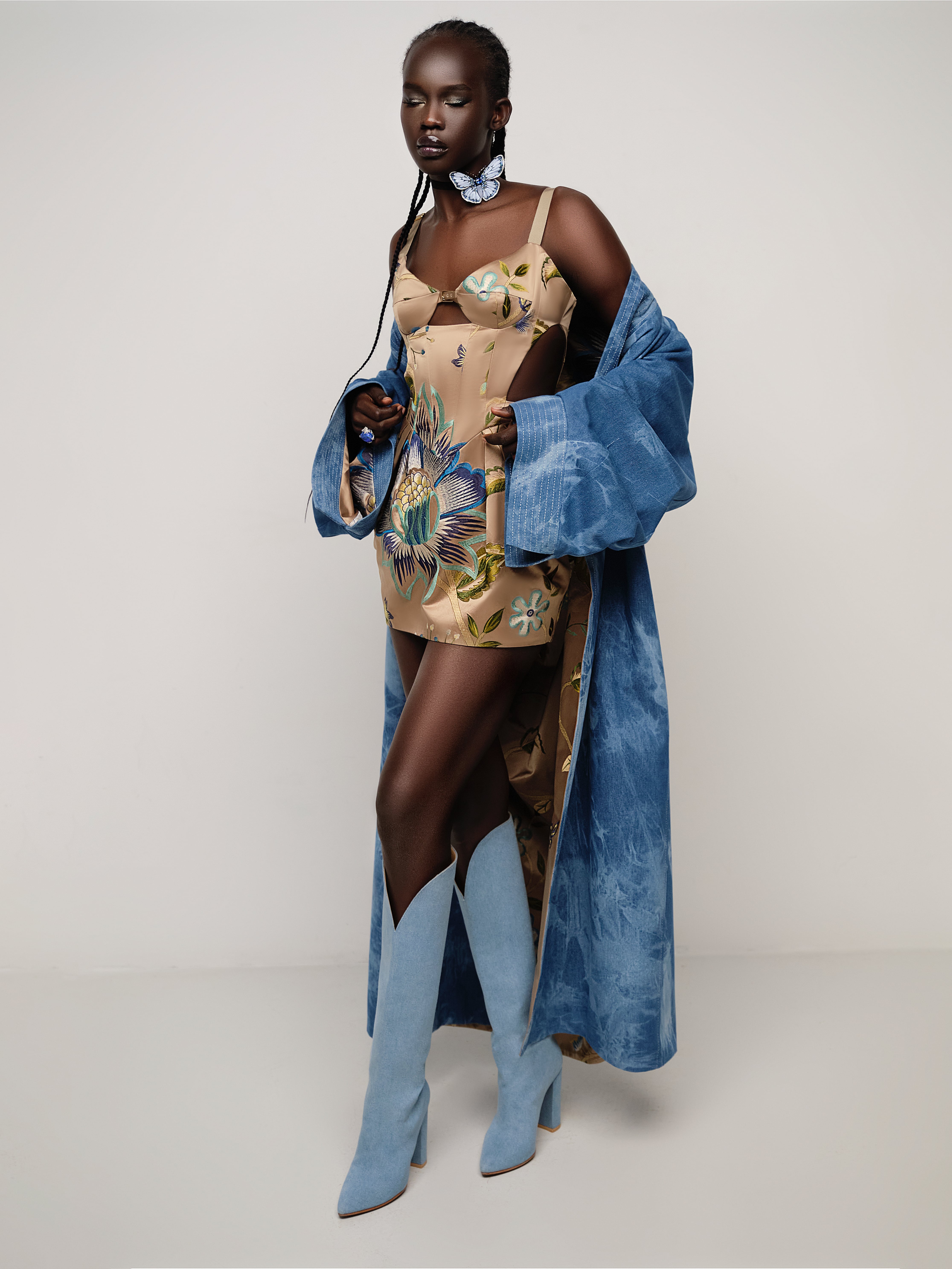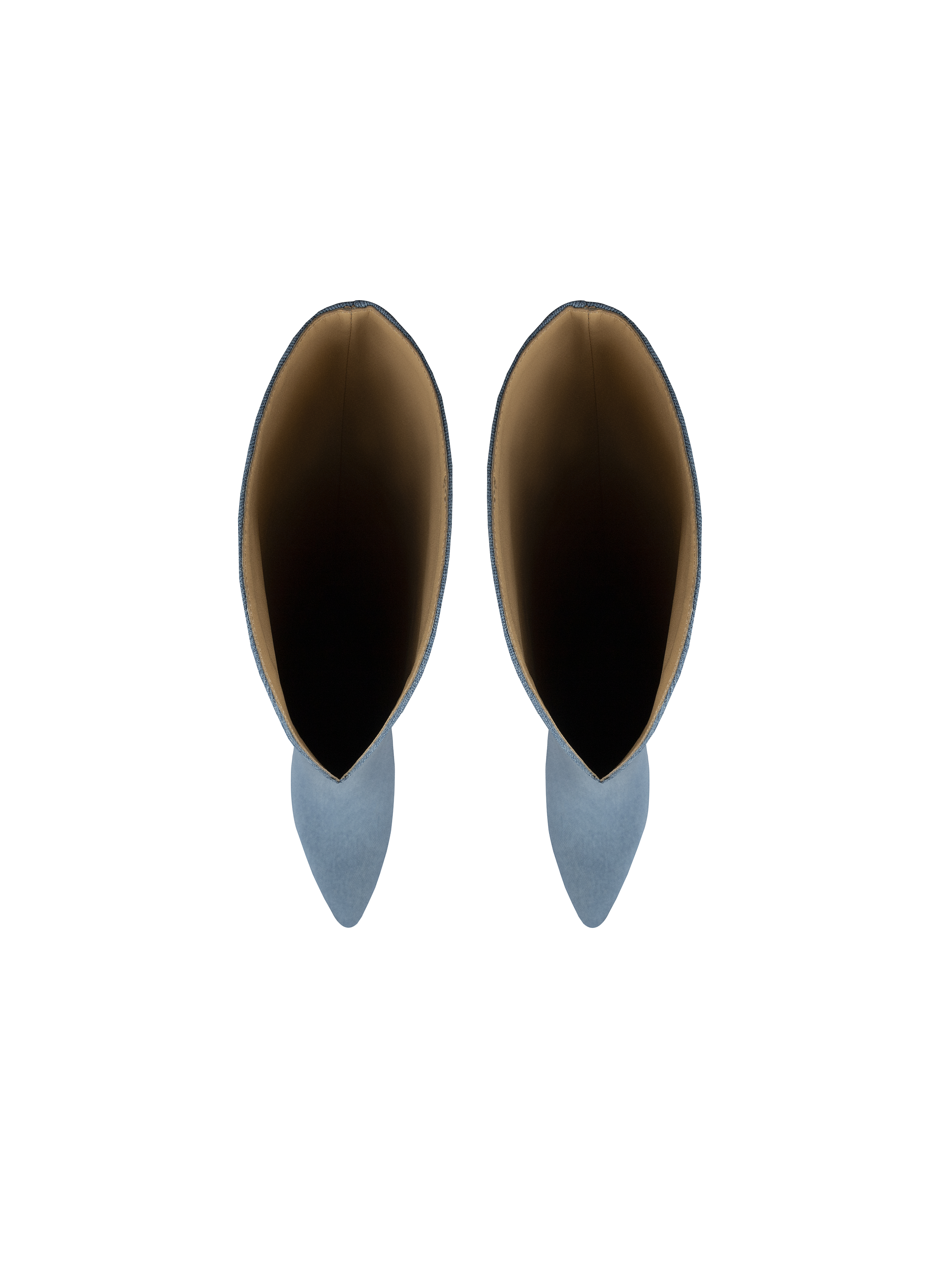 High-heeled boots with a pointed toe will help create a memorable look. Thanks to the wide shaft with a shaped top, the boots without zippers are easy to put on and take off. For this model, natural brown leather is covered with light blue denim fabric. Handmade. Custom tailoring is possible.