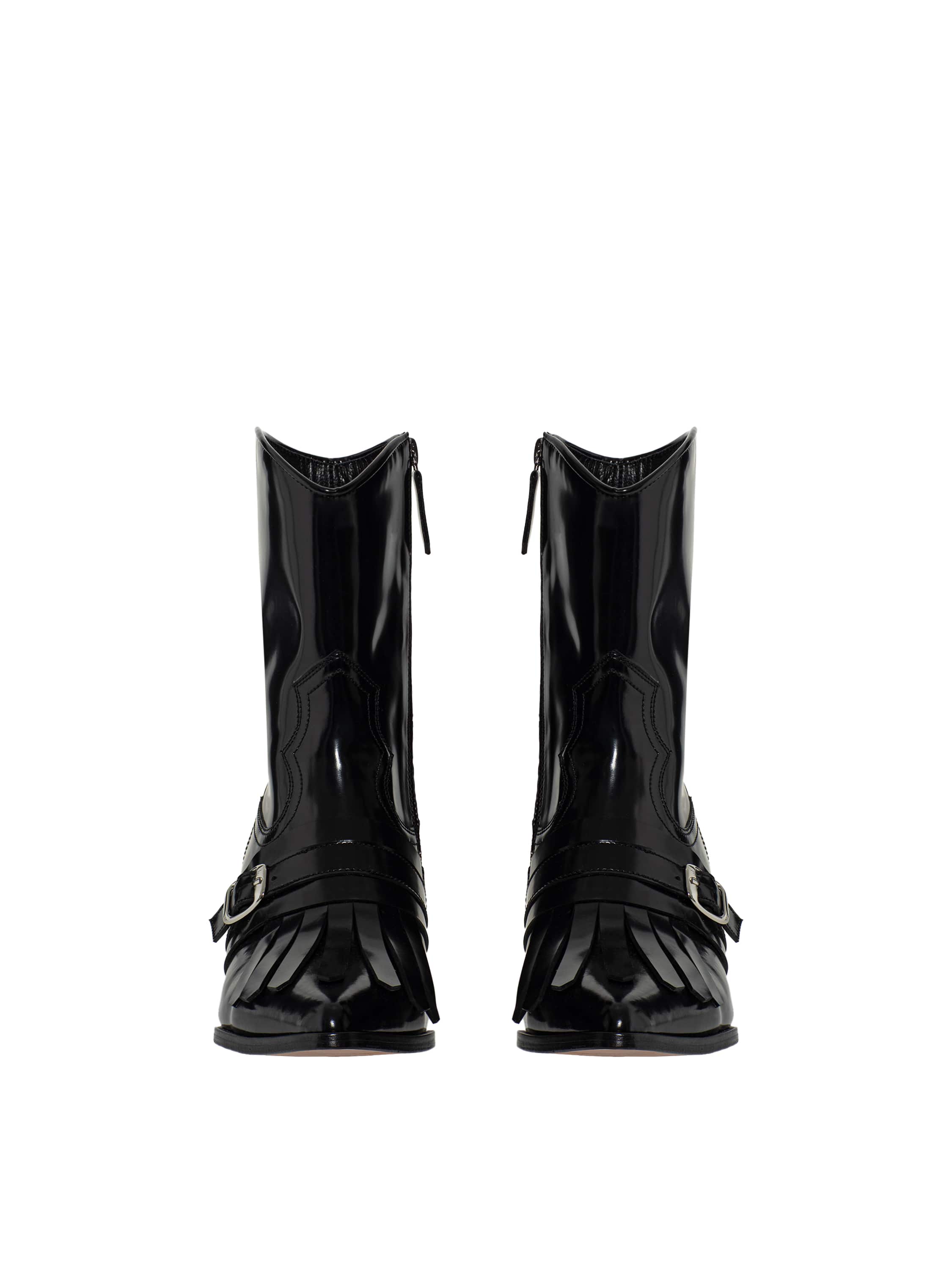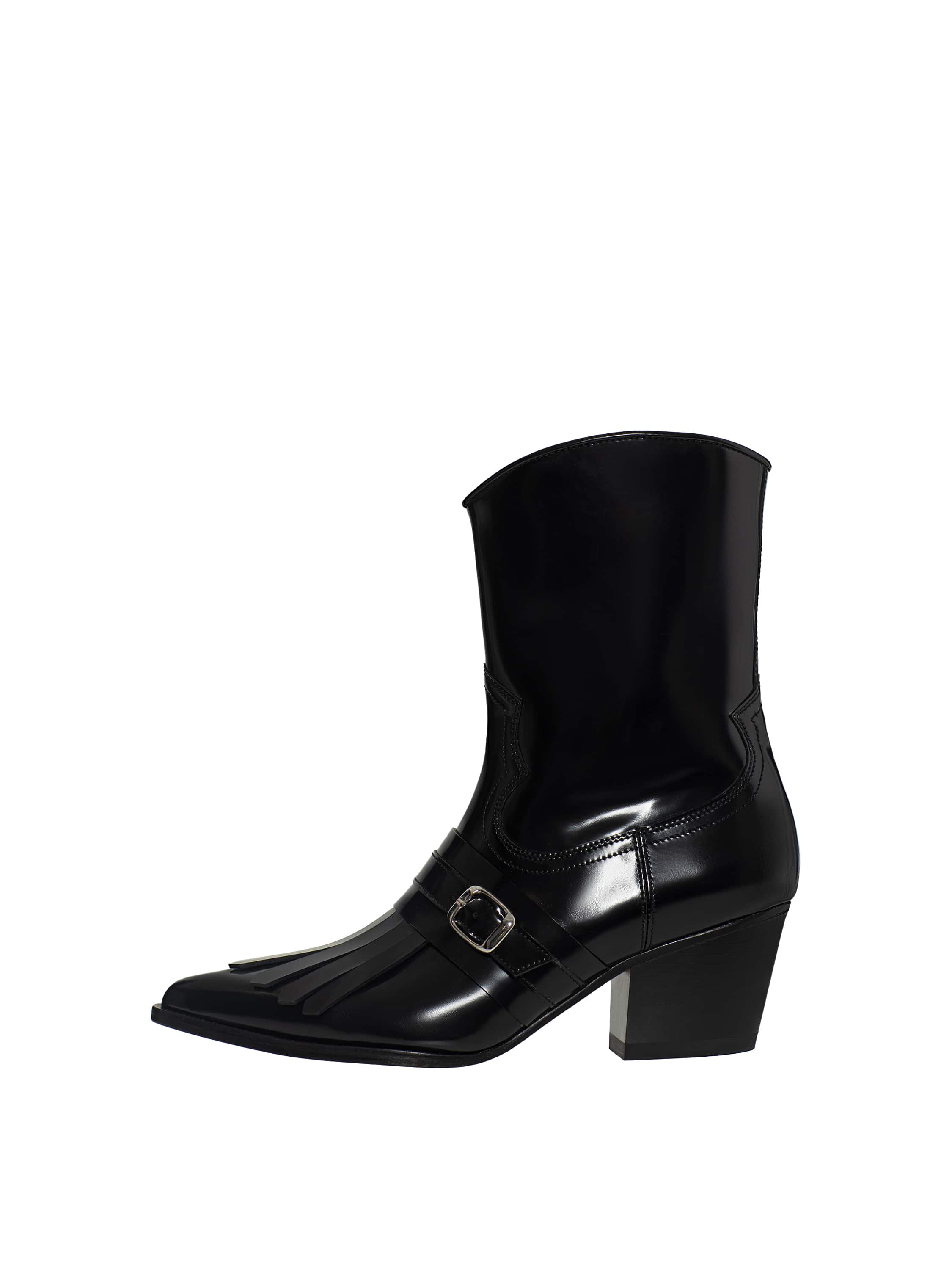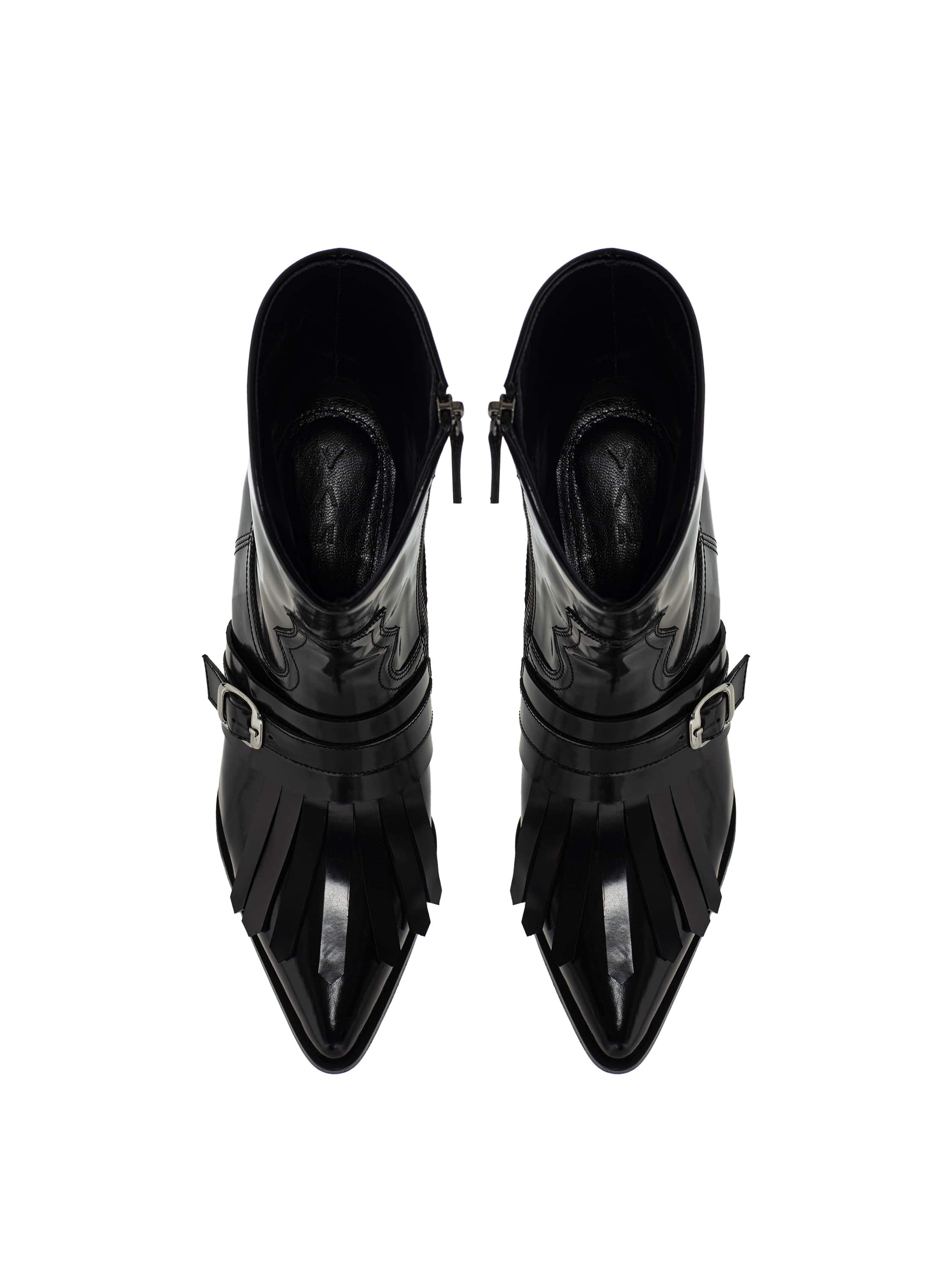Iconic black cowboy boots from YANA in a new interpretation. The new design refers to the aesthetics of the conquistadors: pointed toe, fringe, and shaped elements. The piece is crafted from patent leather.