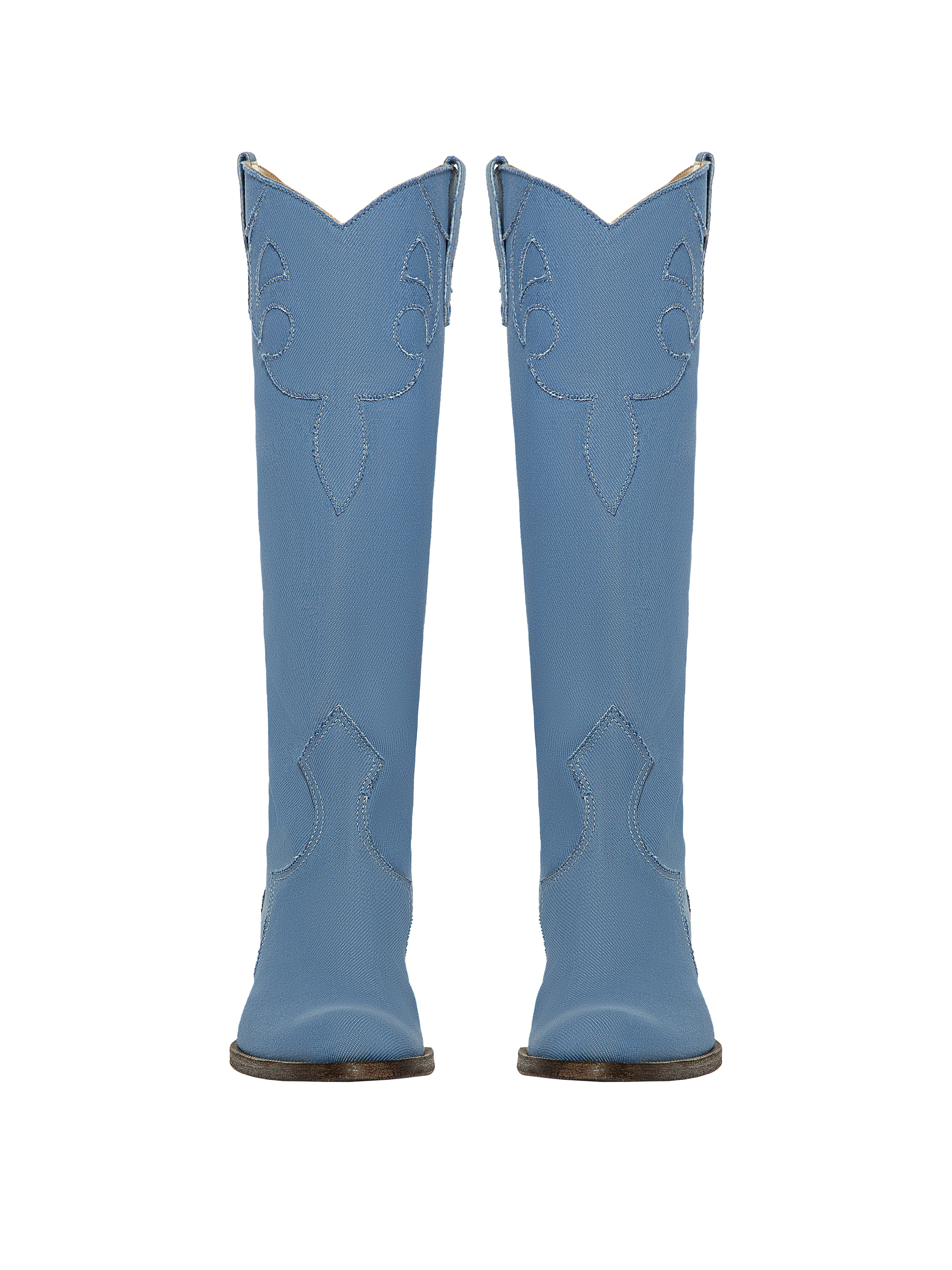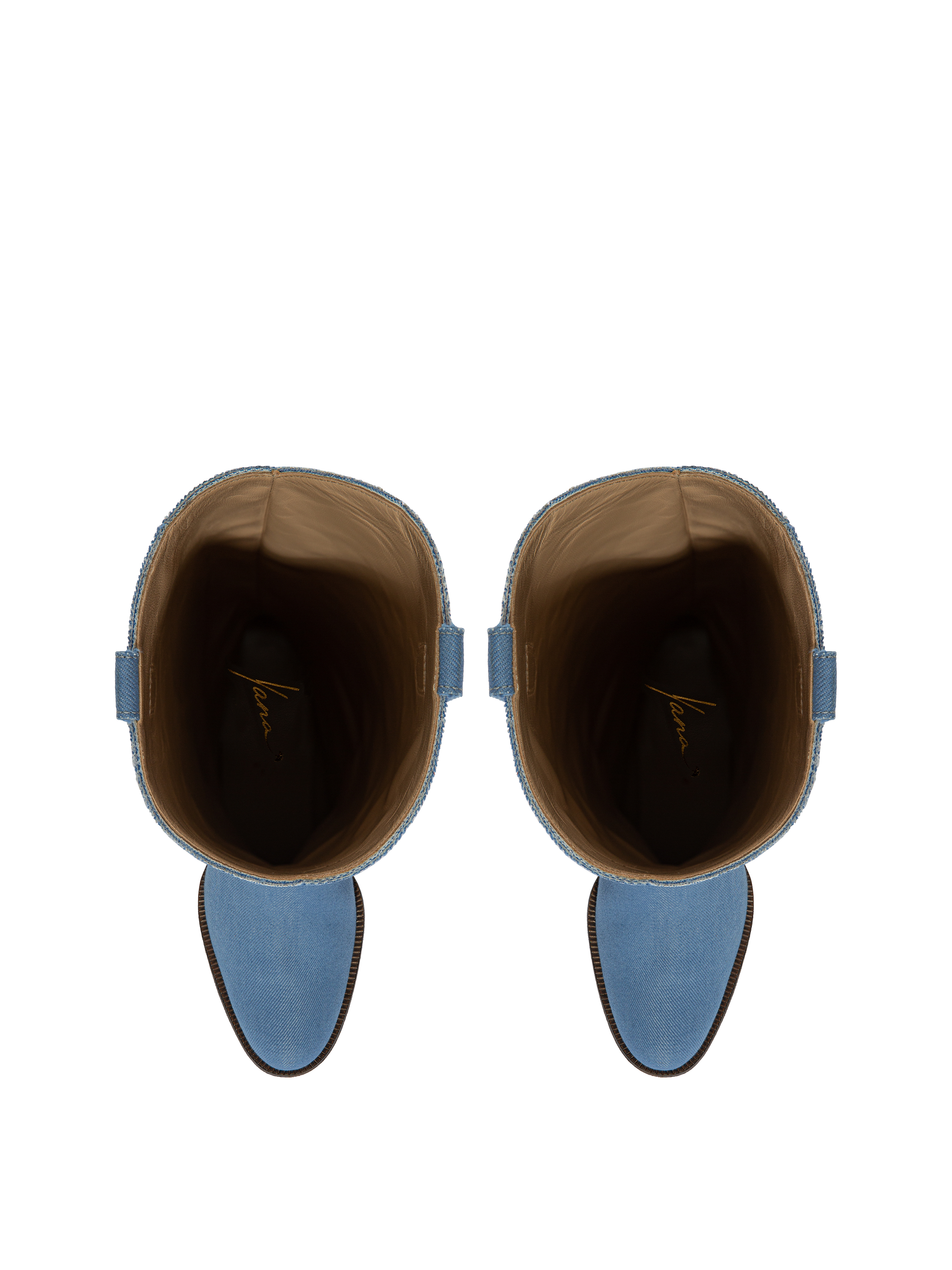 Cowboy boots are a vivid example of versatile footwear that pairs equally well with both jeans and dresses. The brand’s craftsmen made the model from natural beige leather covered with blue denim.