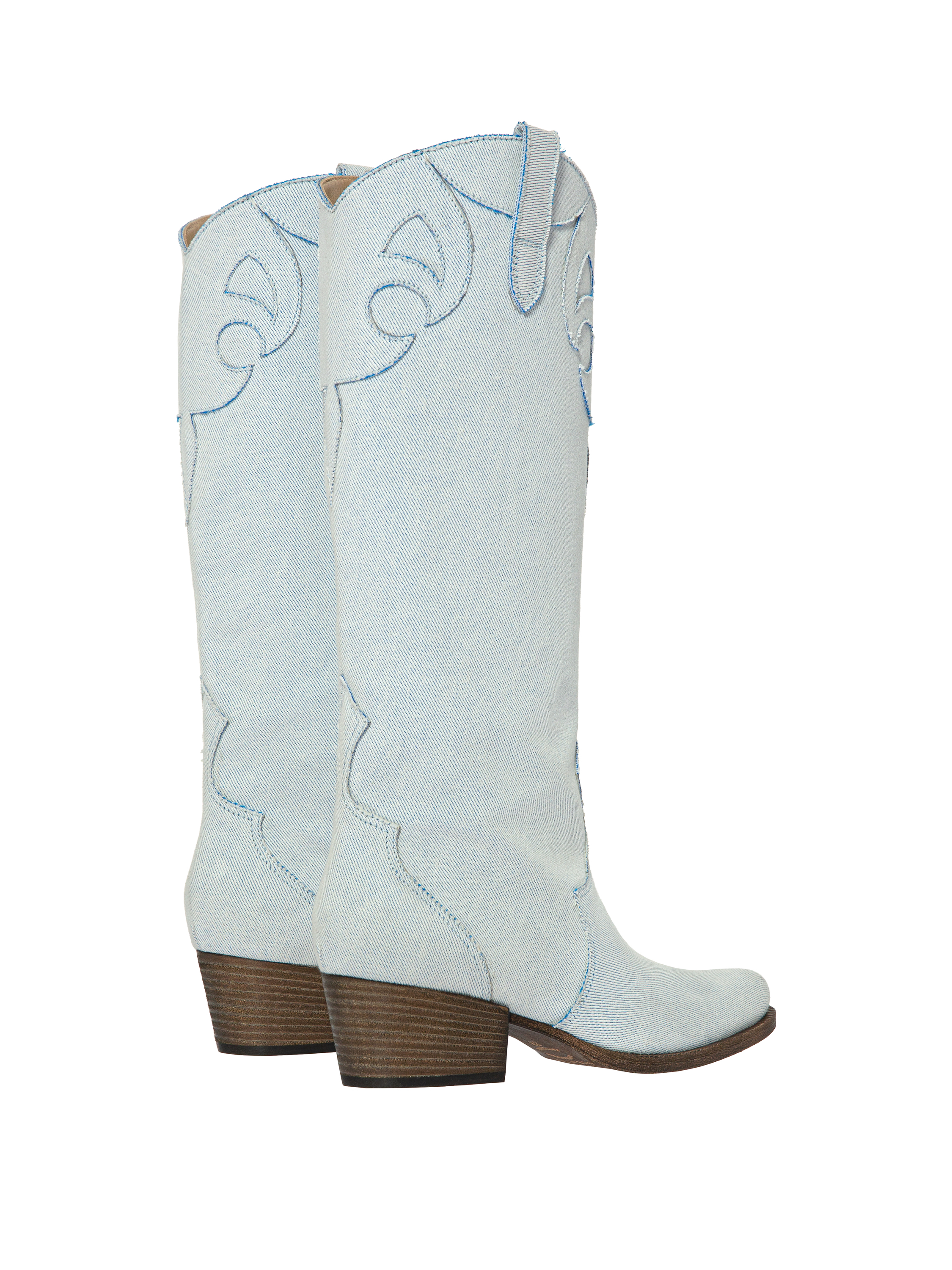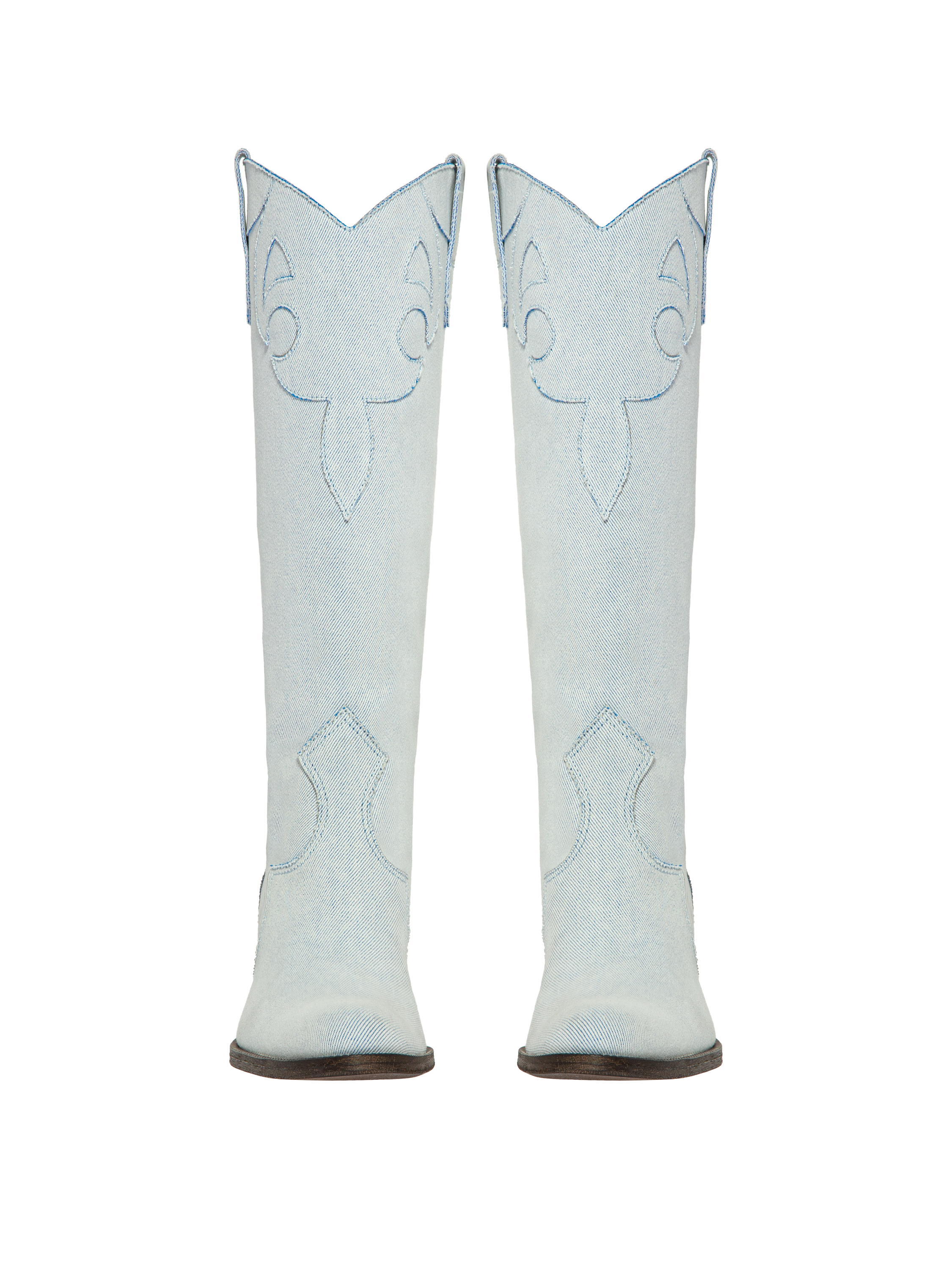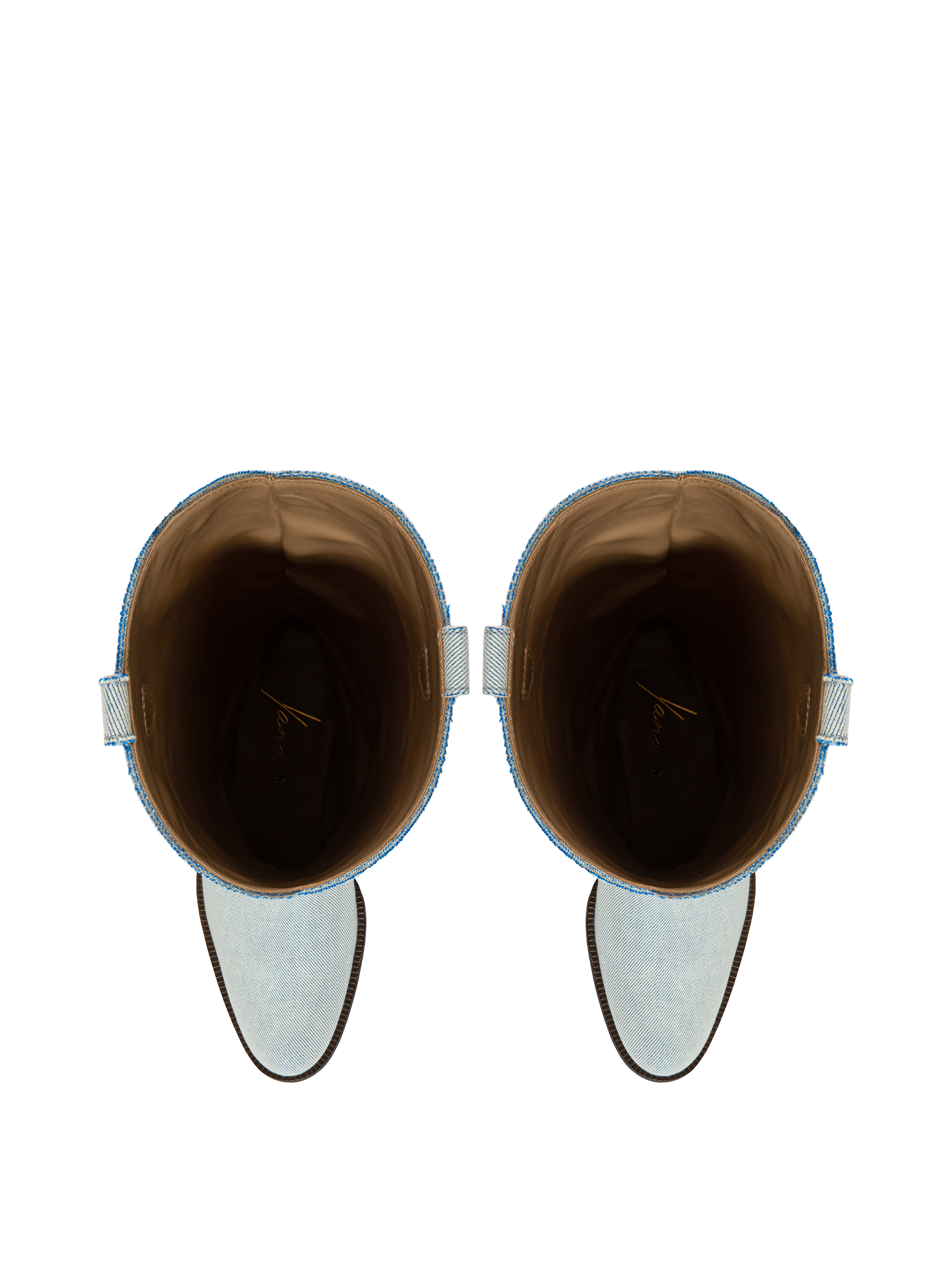 Cowboy boots are a vivid example of versatile footwear that pairs equally harmoniously with both jeans and dresses. The brand’s craftsmen made this model from natural beige leather covered with light blue denim.