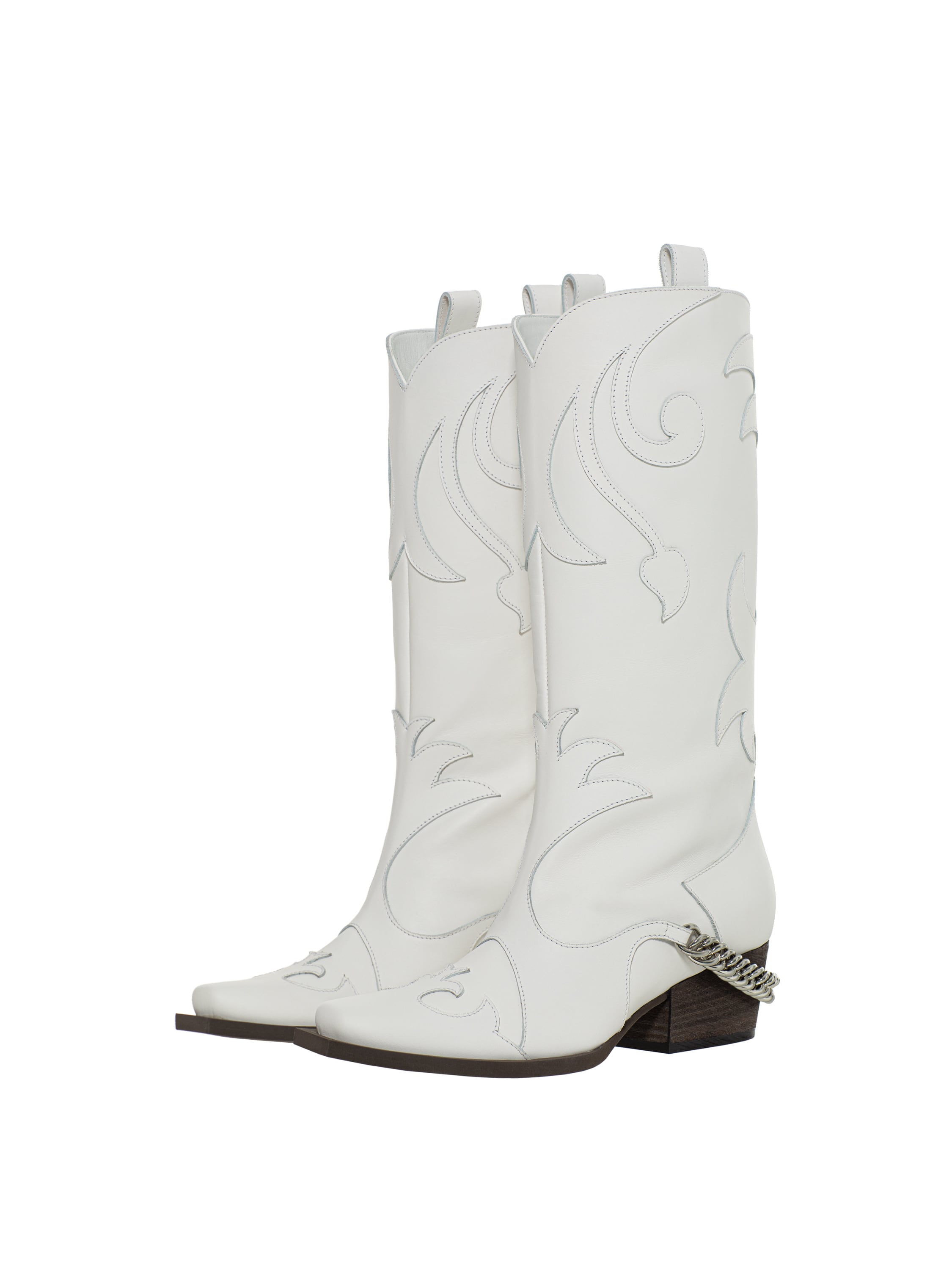 White cowboy boots made of genuine leather are a versatile footwear option that will work both with everyday jeans and with dressy dresses. The style on a slightly slanted heel is complemented by shaped details and a chain.