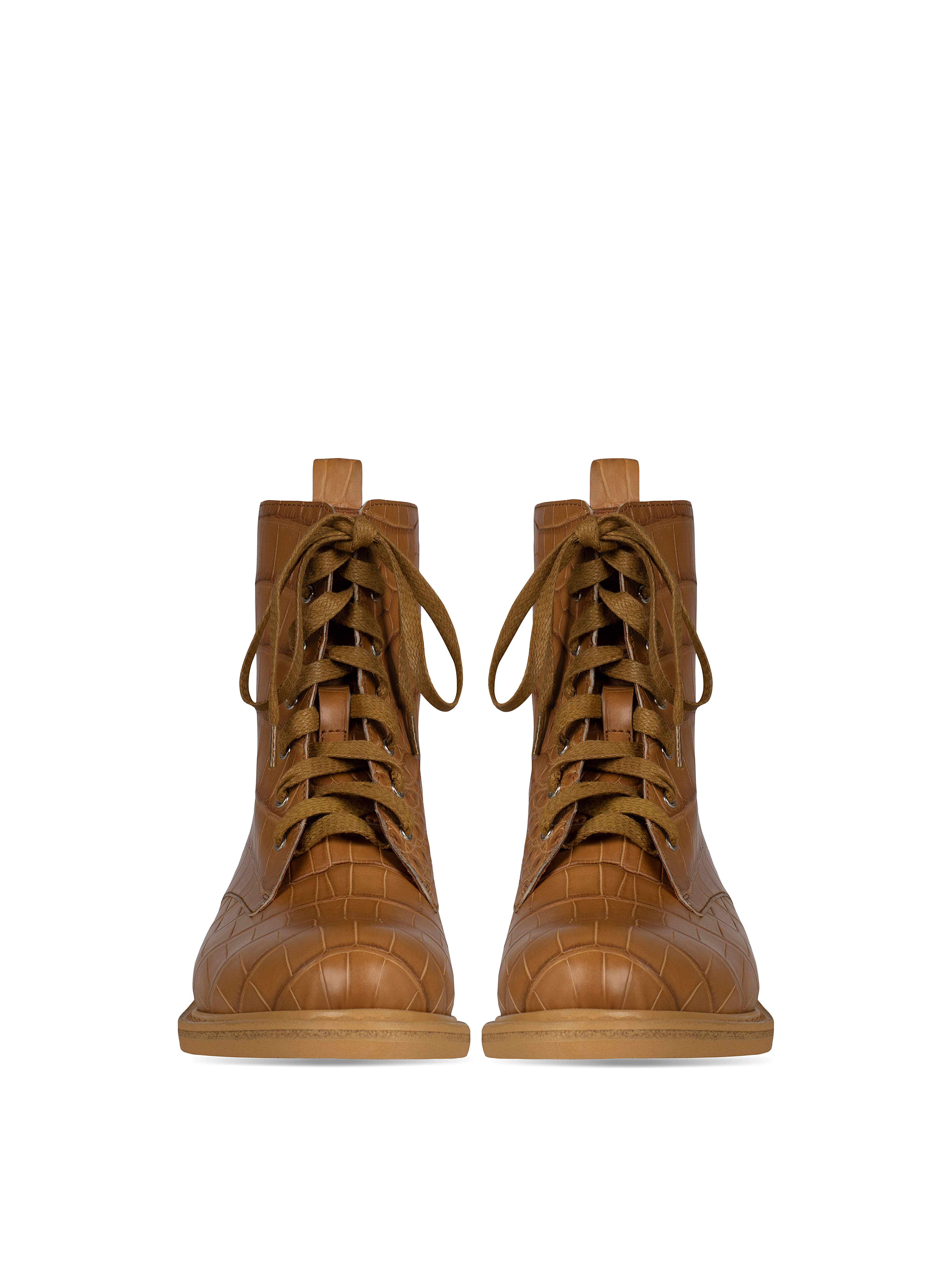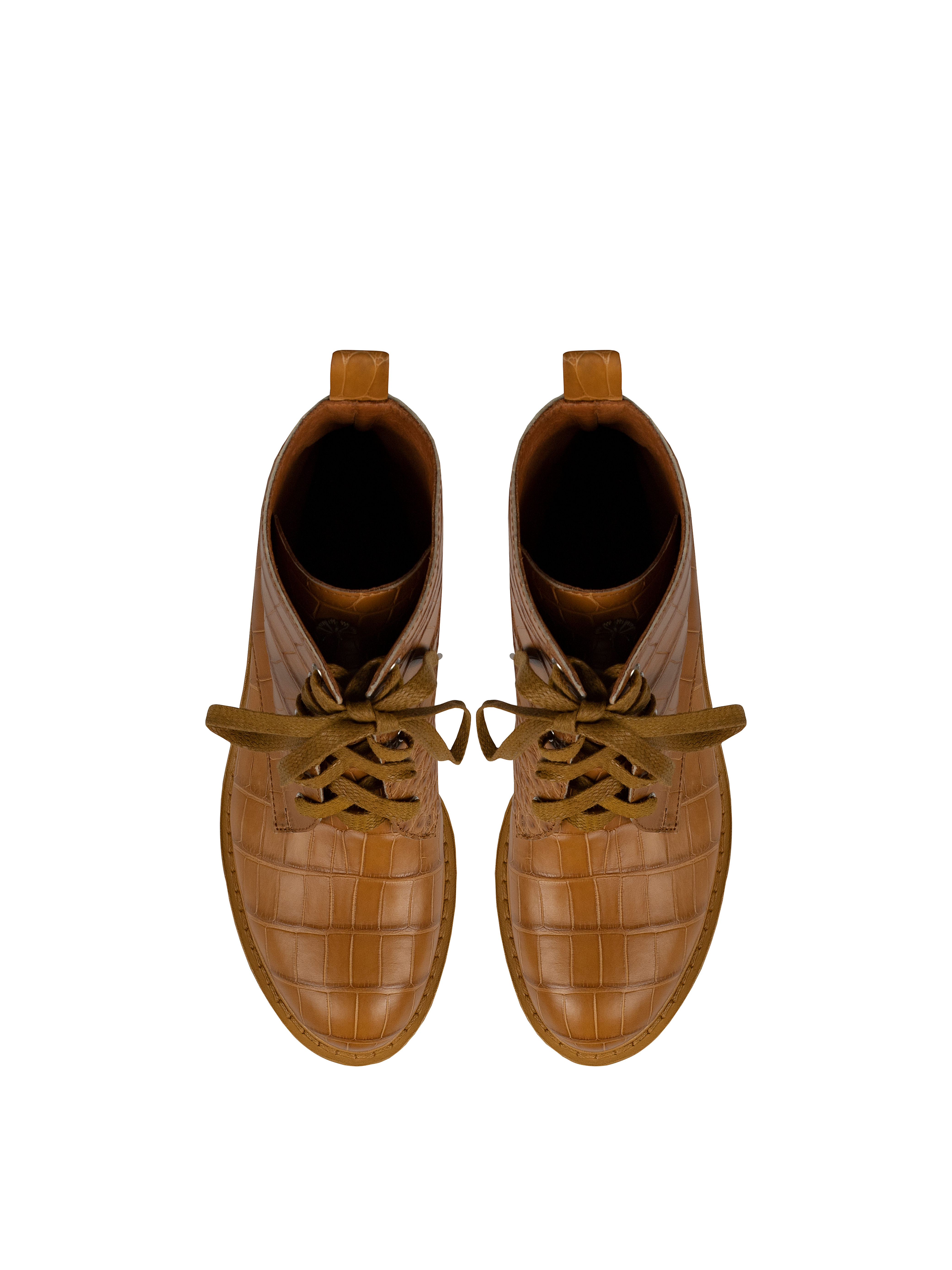 High brown lace-up boots with a round toe and contrasting laces are made of crocodile leather. The thick sole is made of compressed leather and protected by a rubber tread.