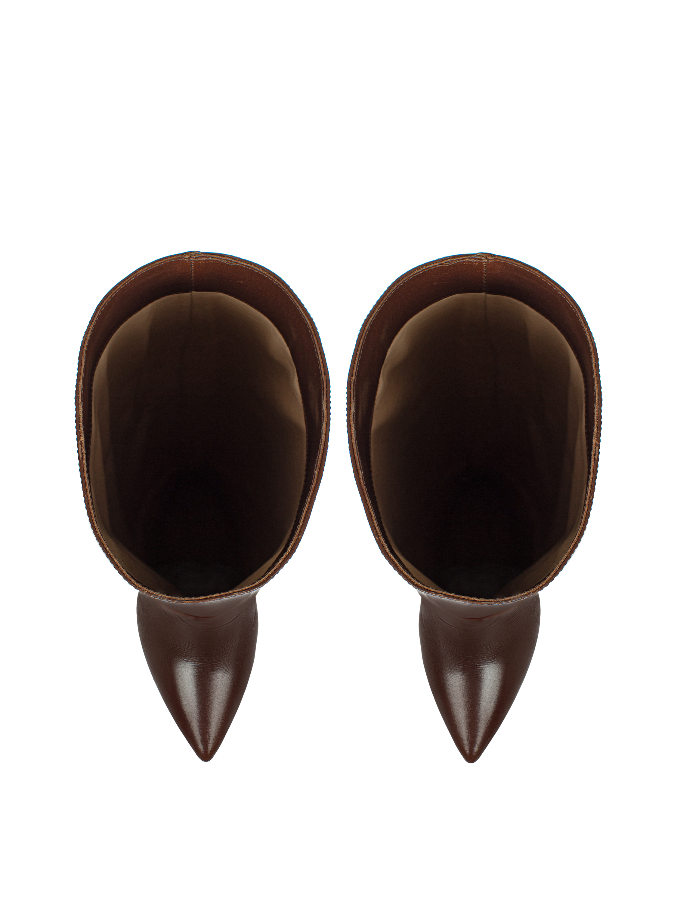 Brown high stiletto-heel boots with a pointed toe will help create a memorable look. Thanks to the wide shaft, the boots without zippers are easy to put on and take off. The model is made of soft, grained leather with a matte sheen.