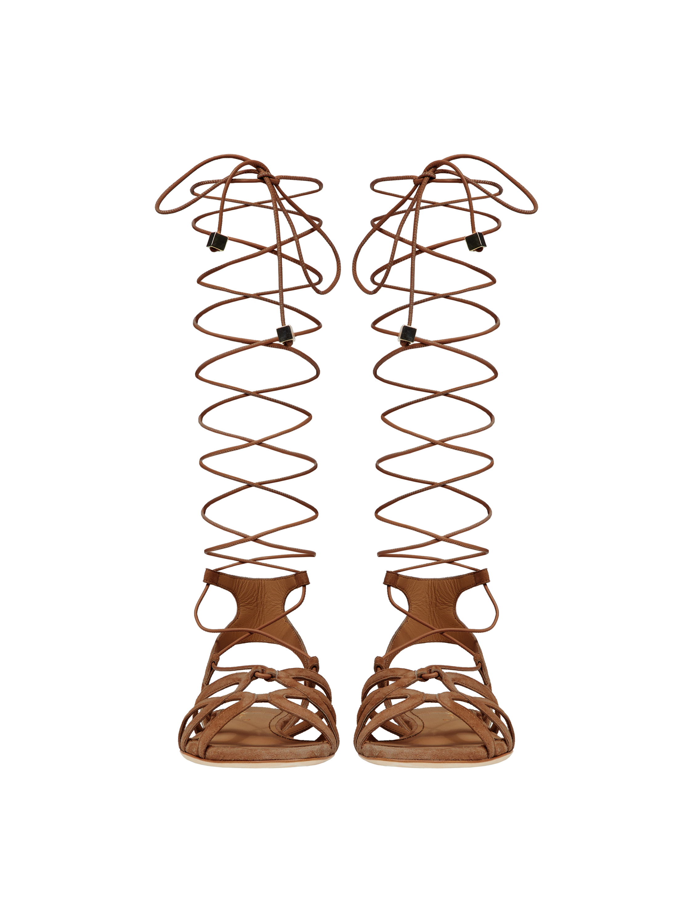 The high gladiator sandals are made of soft genuine suede in brown. The long criss-cross lacing will accentuate the slimness of your legs, while the small stacked heel will prevent fatigue after long walks.