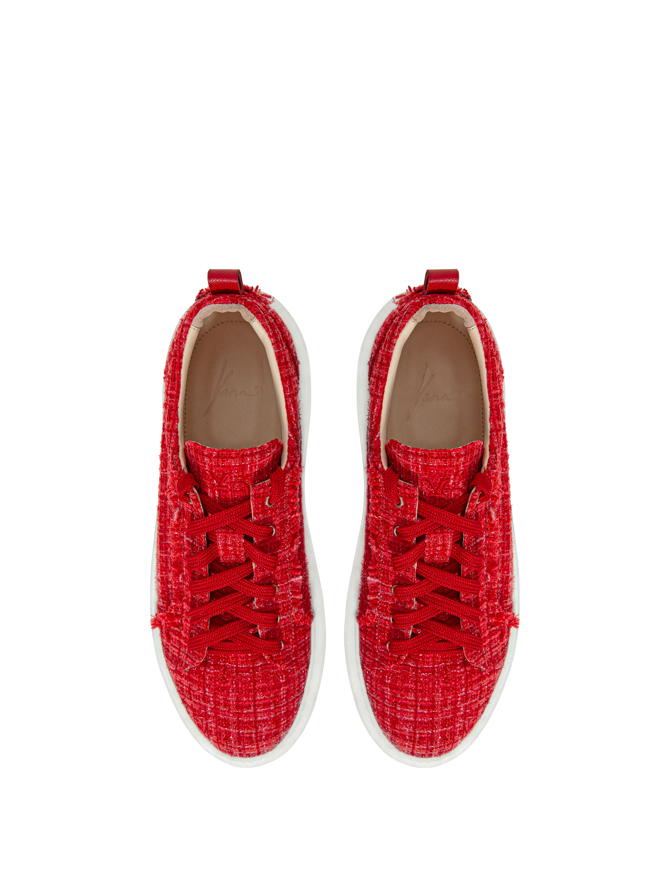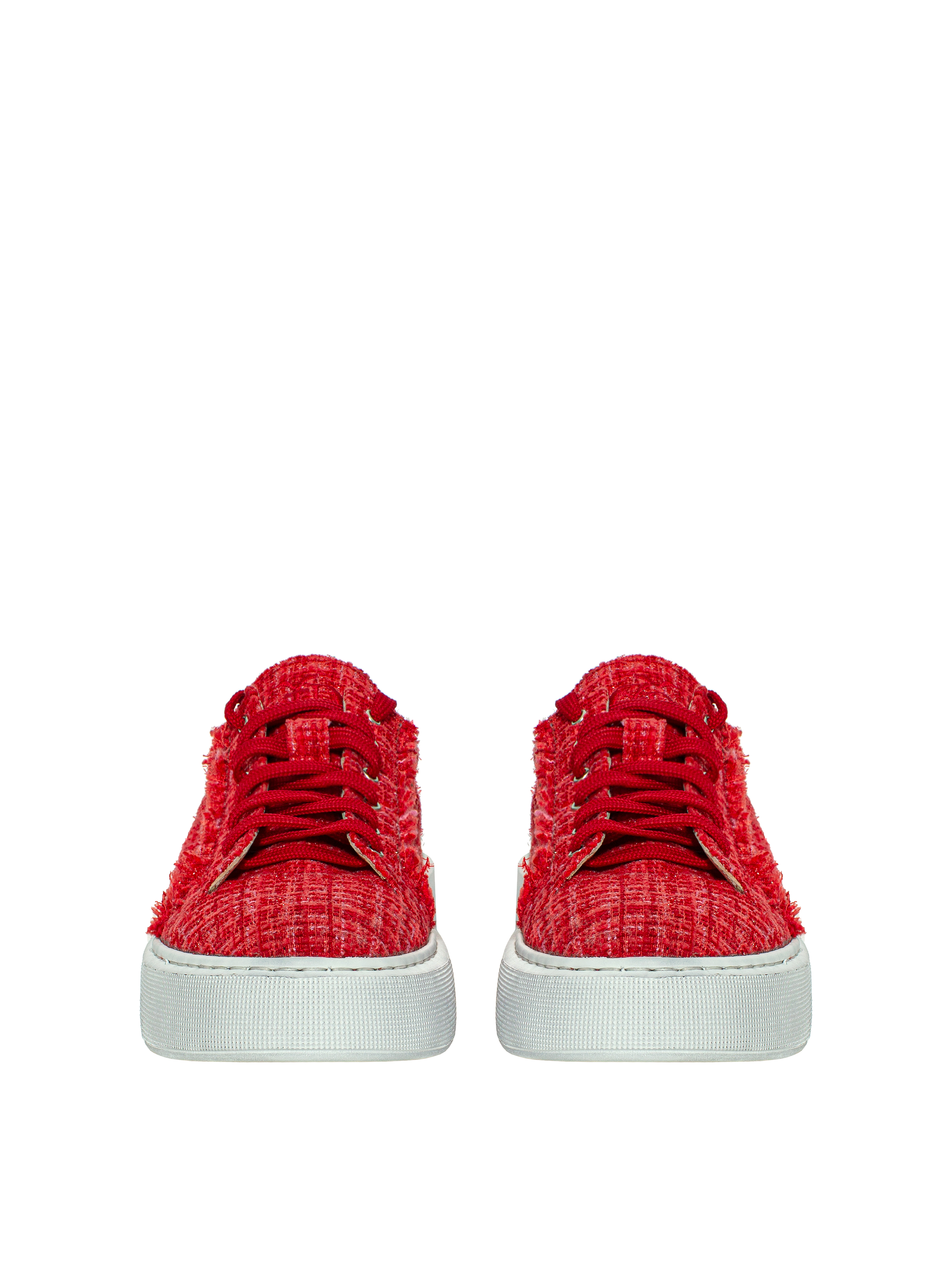 Red tweed sneakers with lurex and a wide white sole. The inner part is made of natural beige leather. Decorated with tonal embroidery at the back.