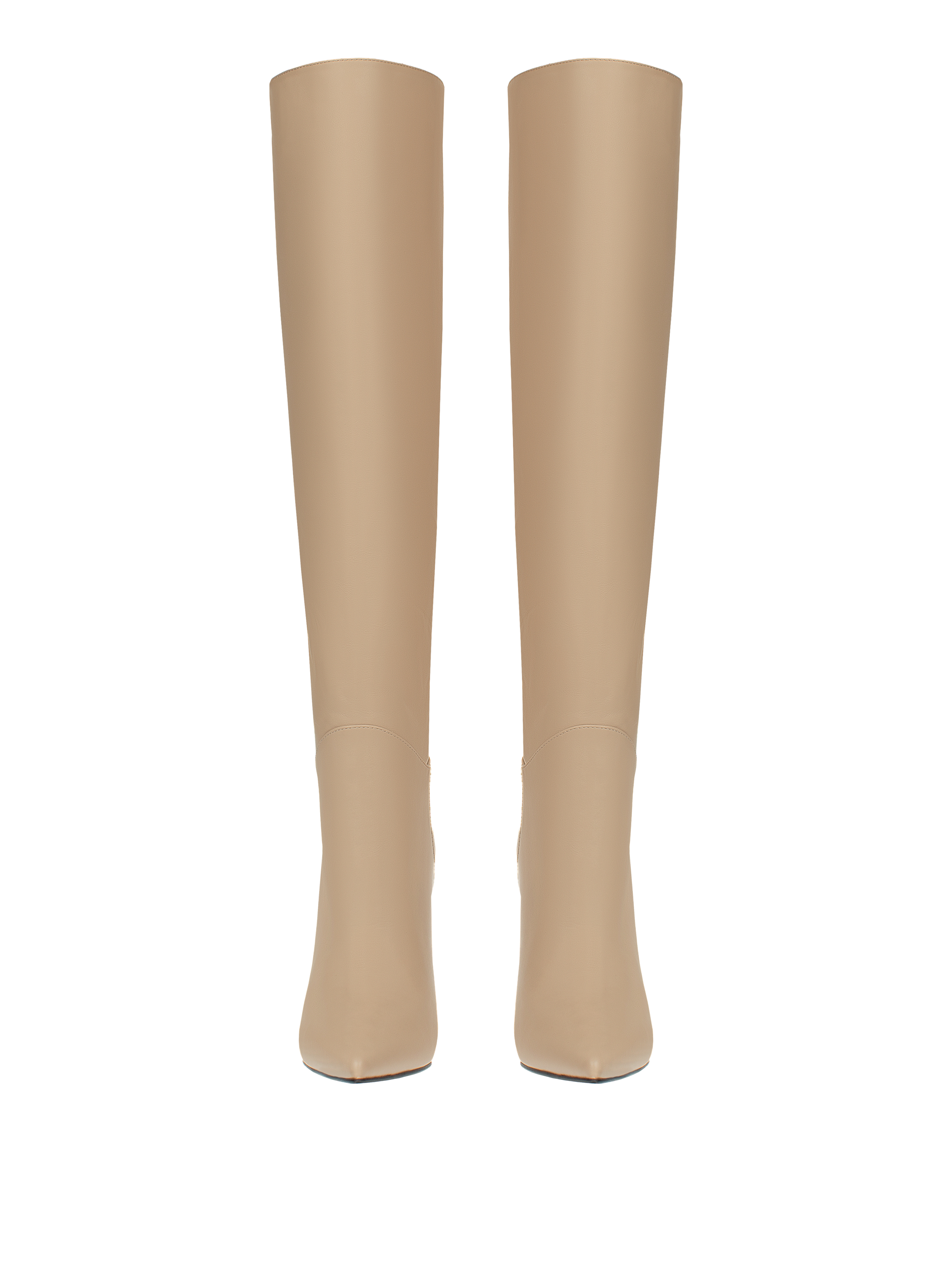 Cream high stiletto-heel boots with a pointed toe will help create a memorable look. Thanks to the wide shaft, the boots without zippers are easy to put on and take off. The model is made of soft, grained leather with a matte sheen.