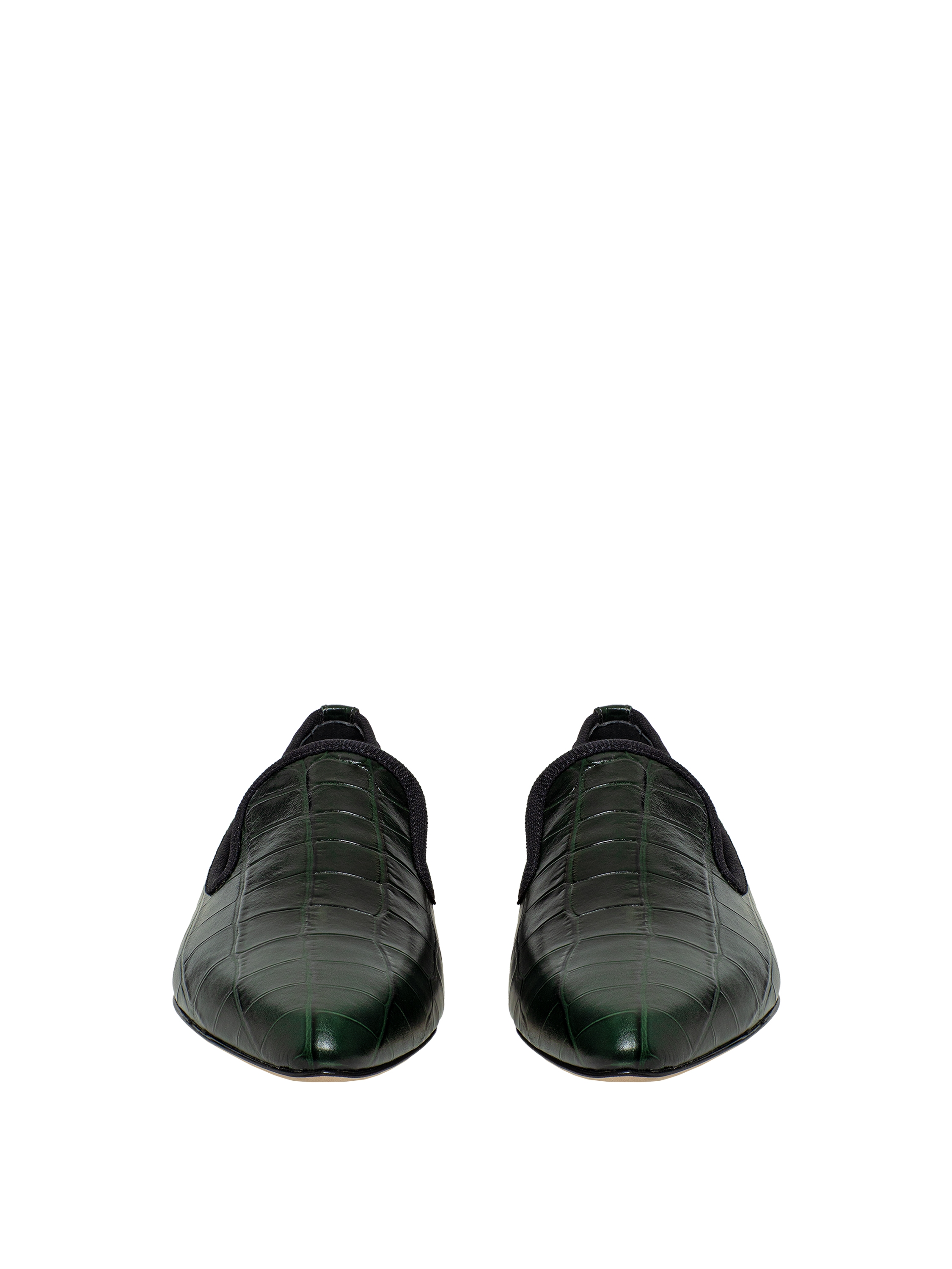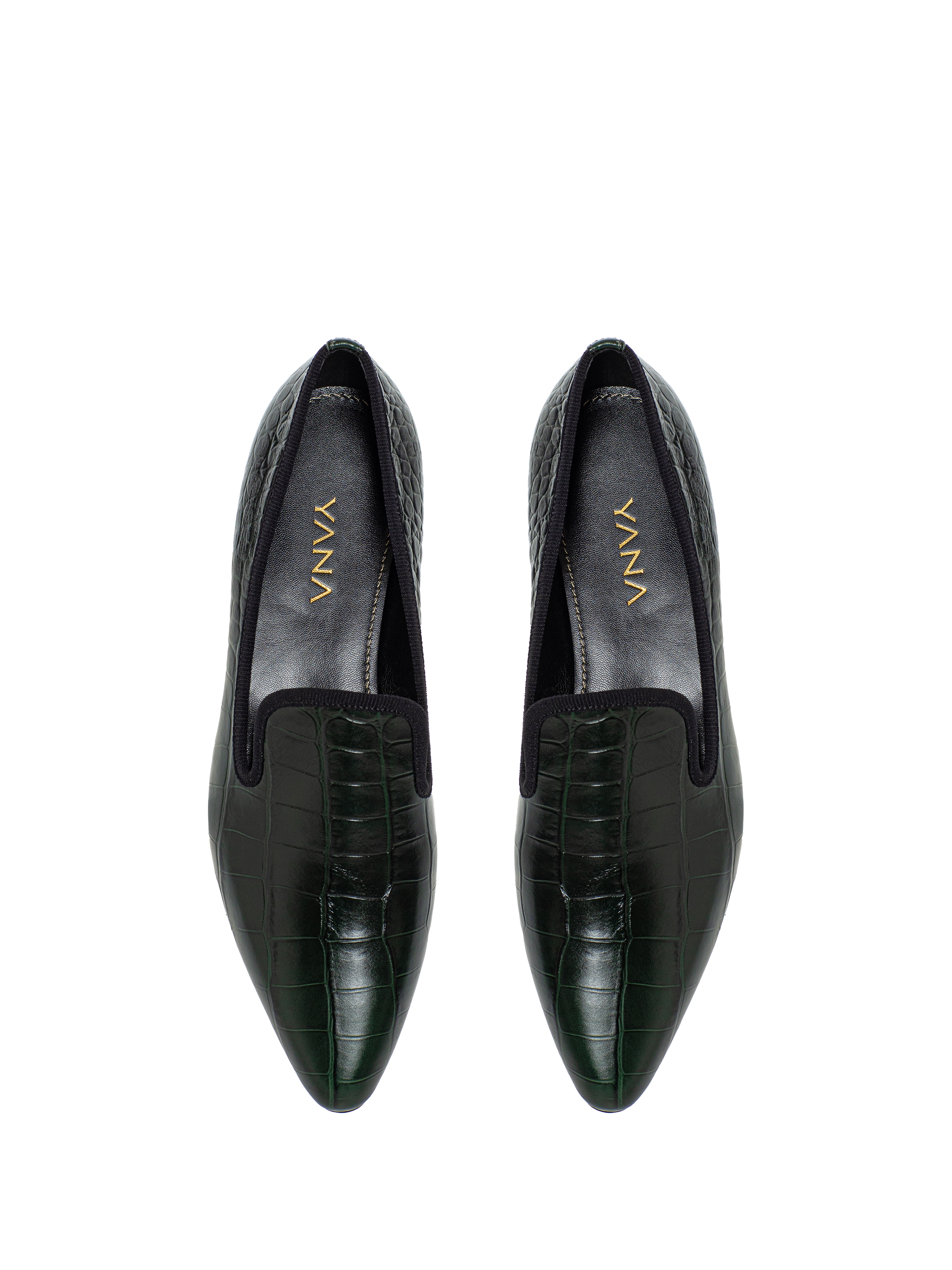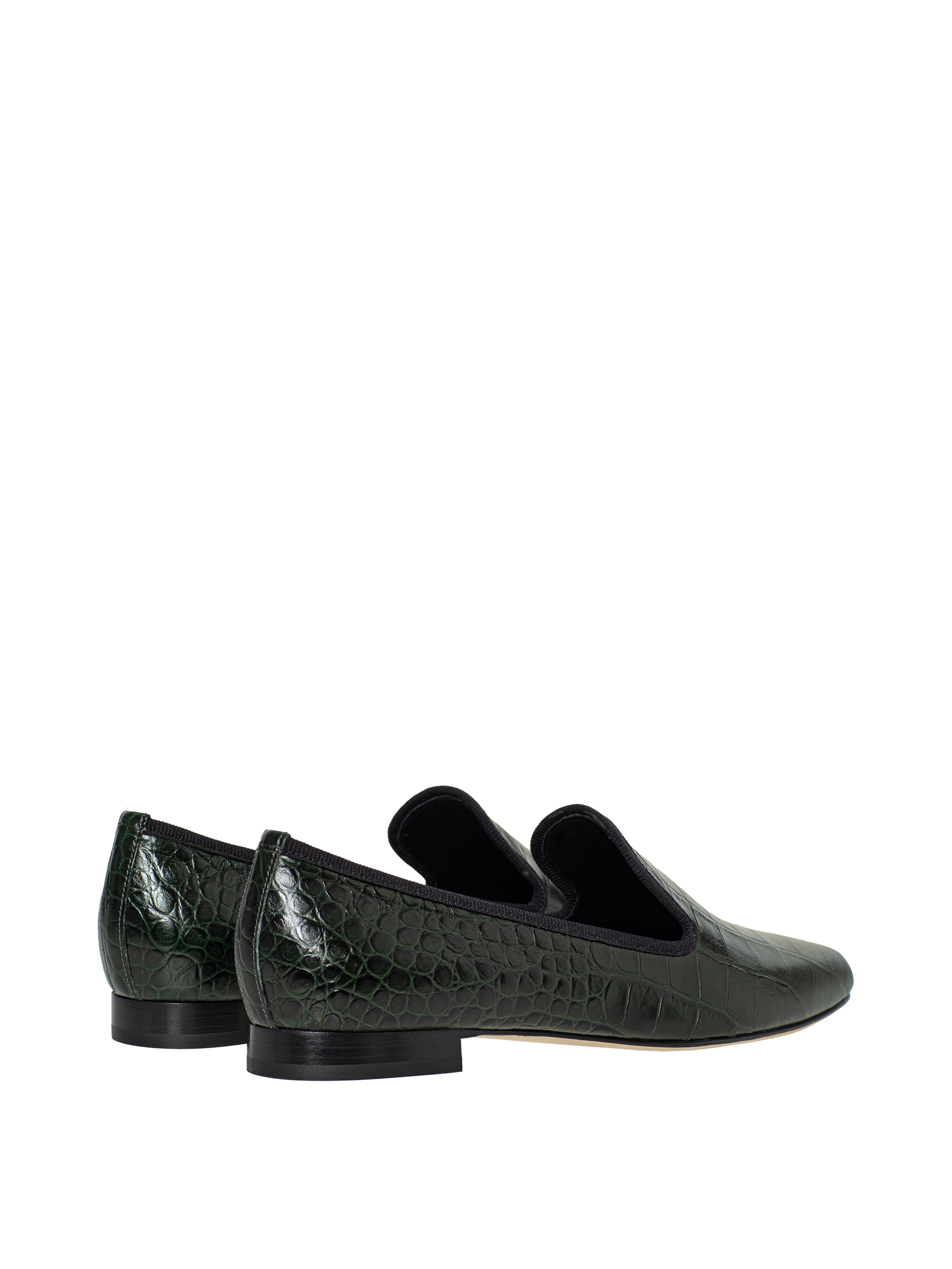 The dark green loafers are made of soft calfskin. The versatile model will become an eye-catching addition both to a strict business outfit and to a casual look. The embossed crocodile-effect print gives the surface an expressive texture.