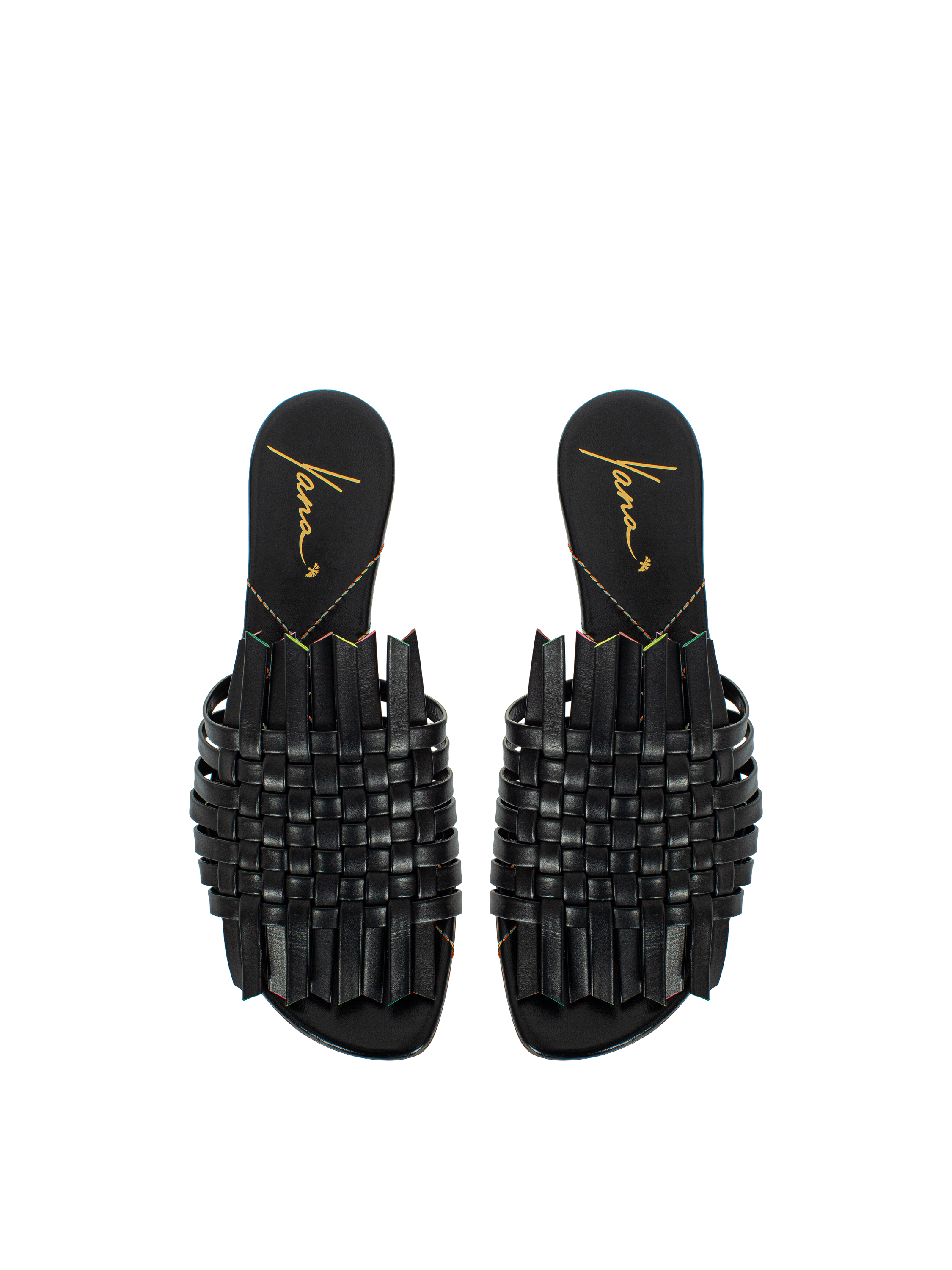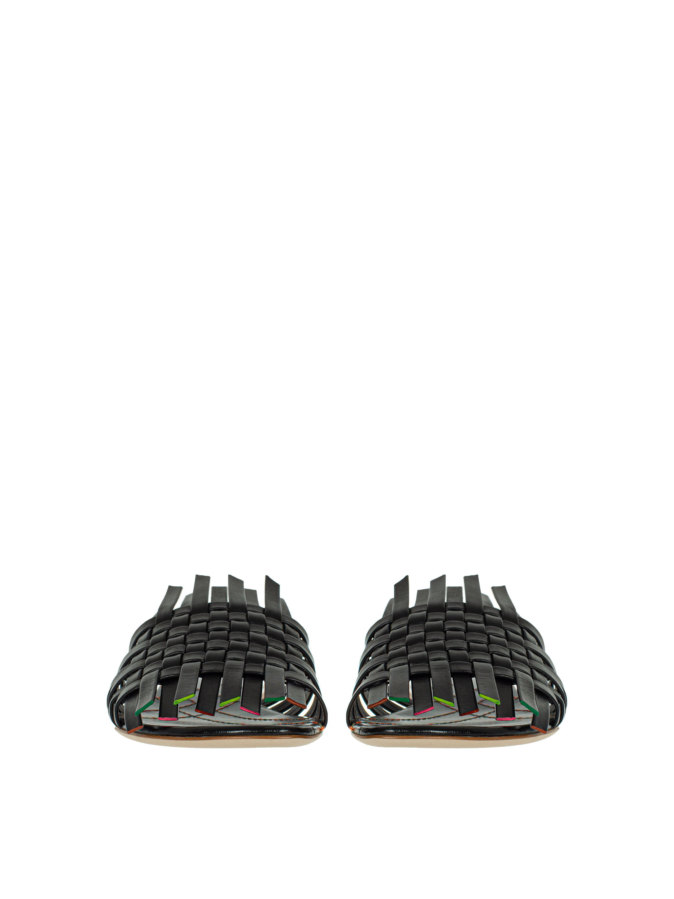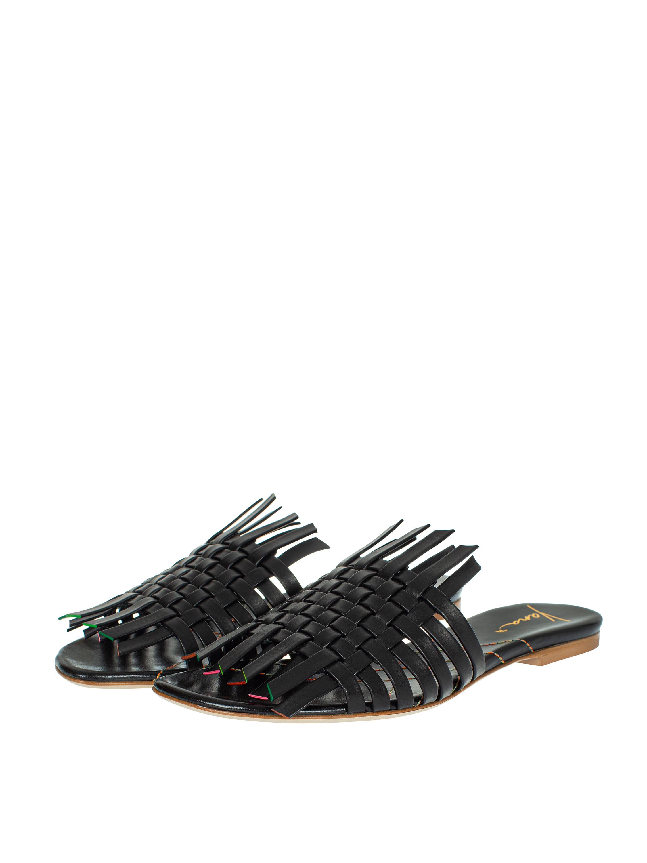 Woven flat mules with an open toe are made of genuine black leather with colored accents along the edge. This shoe model pairs equally well with dresses and your favorite jeans from Yana Dress.