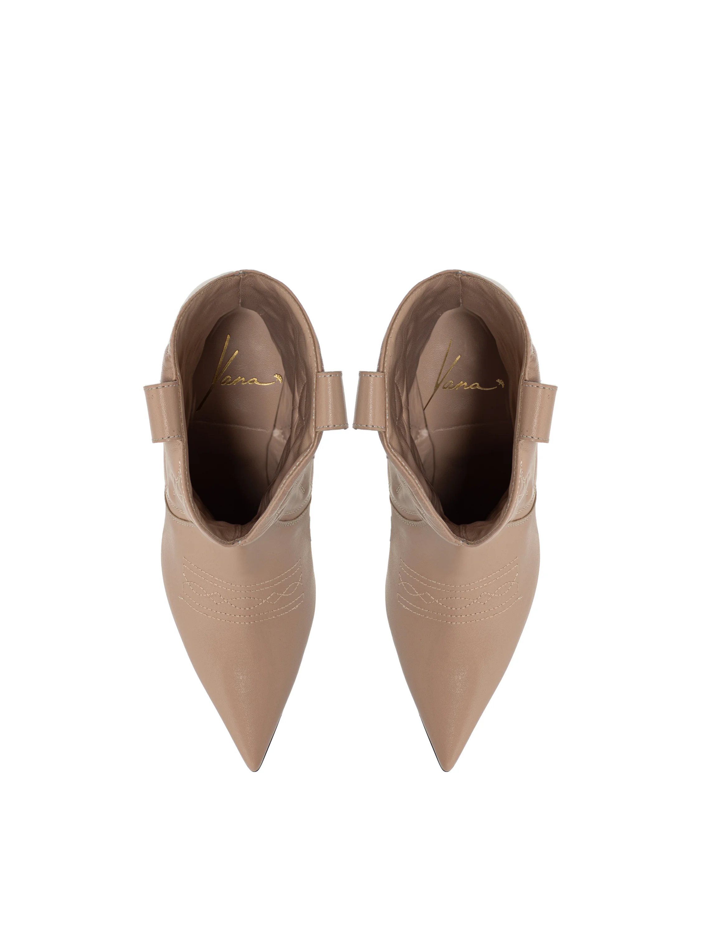 Beige cowboy boots are a vivid example of versatile footwear that pairs equally harmoniously with both jeans and dresses. The brand’s craftsmen made the style from genuine leather with embossed embroidery and finished it with a pointed toe and stiletto heel. Thanks to the zippers on the inner side, the boots are easy to put on and take off.