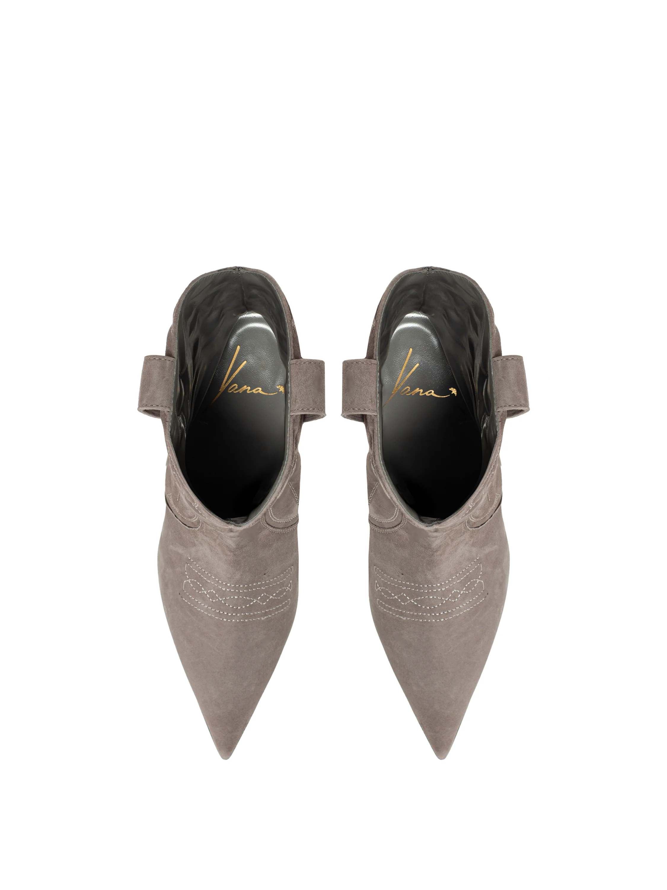 Grey cowboy boots are a vivid example of versatile footwear that pairs equally harmoniously with both jeans and dresses. The brand’s craftsmen made the style from genuine suede with embossed embroidery and finished it with a pointed toe and stiletto heel. Thanks to the zippers on the inner side, the boots are easy to put on and take off.