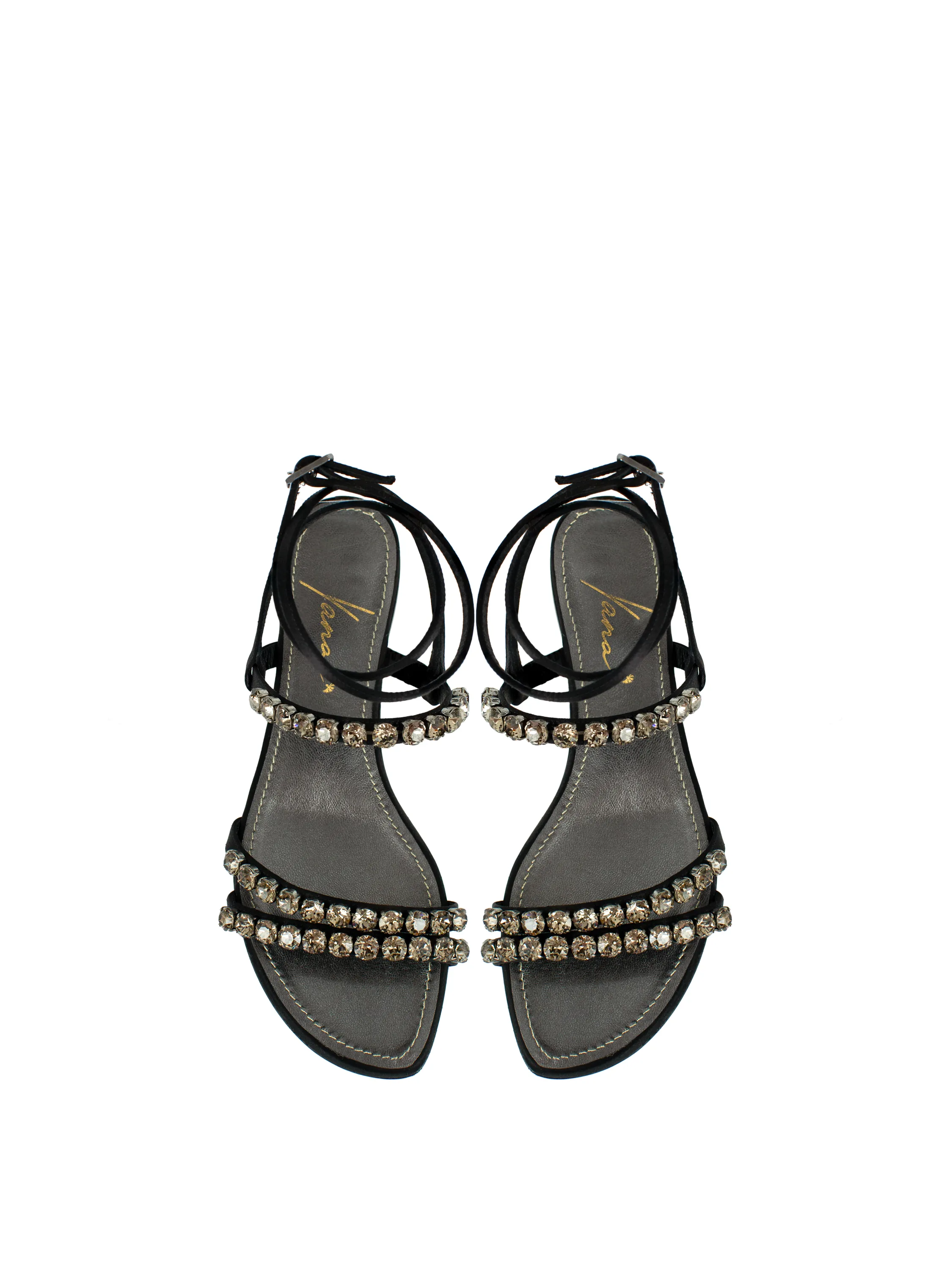 Black satin sandals are both comfortable and elegant. The model with thin straps is decorated with large silvery rhinestones. Long adjustable straps wrap around the ankle.