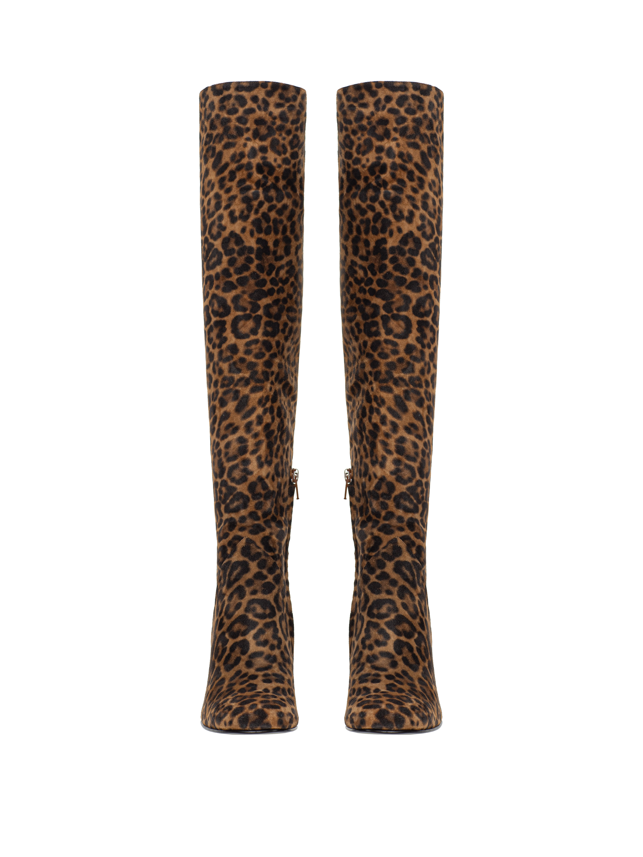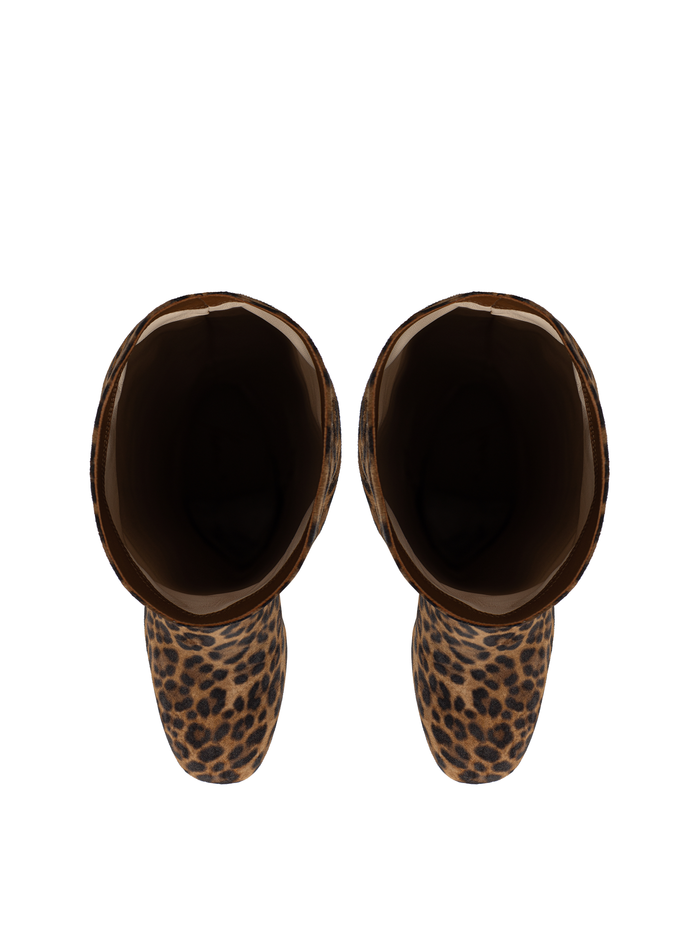 Spectacular high boots are made of natural suede styled as leopard skin. The bold animal print draws attention and adds expressiveness to a basic look. Model with a round toe on a high stable heel.
