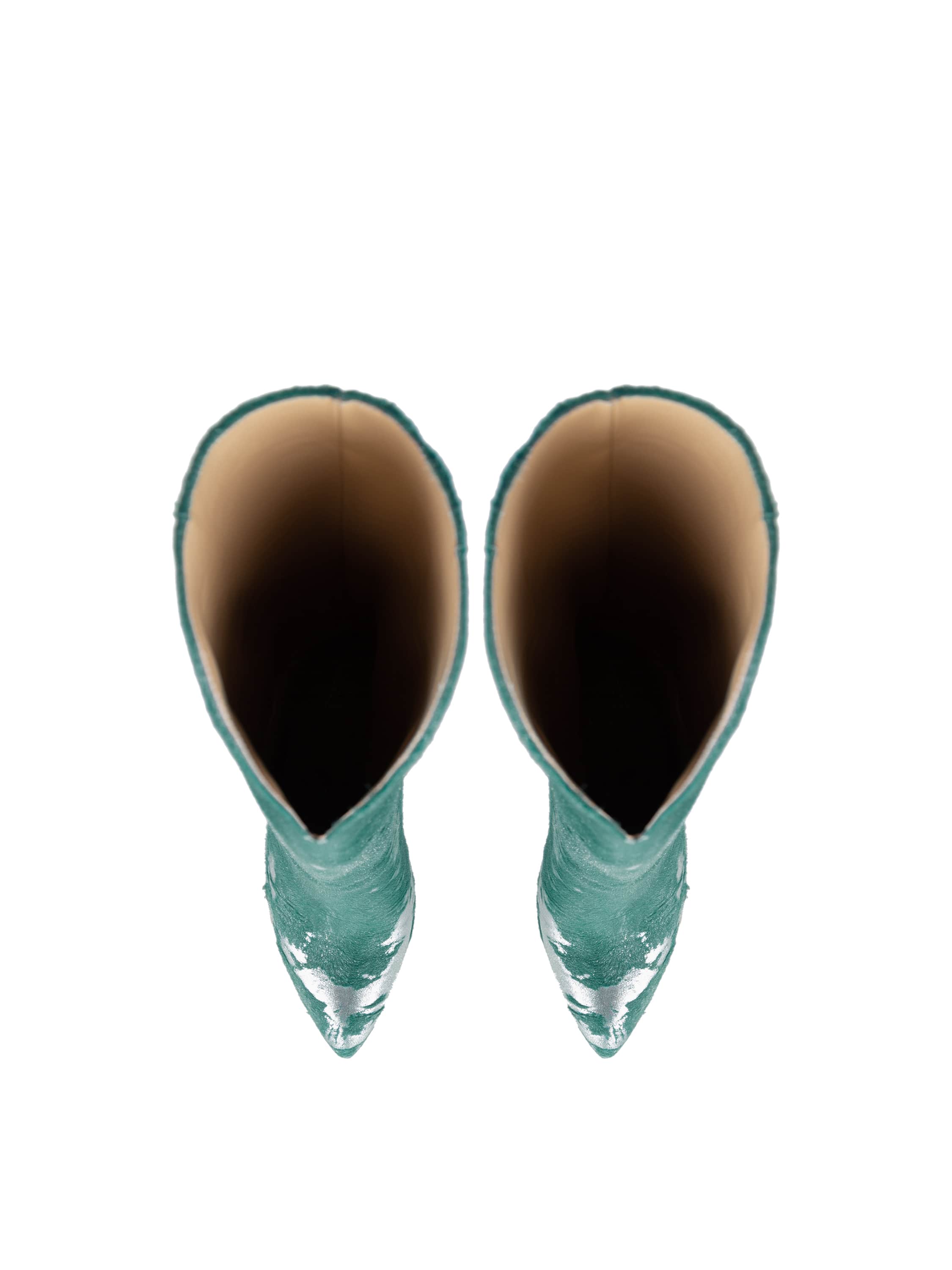 Silver and turquoise high-heeled boots with a pointed toe will help create a memorable look. Thanks to the wide shaft with a shaped top, the zipless shoes are easy to put on and take off. The model is made of soft leather with pony hair.