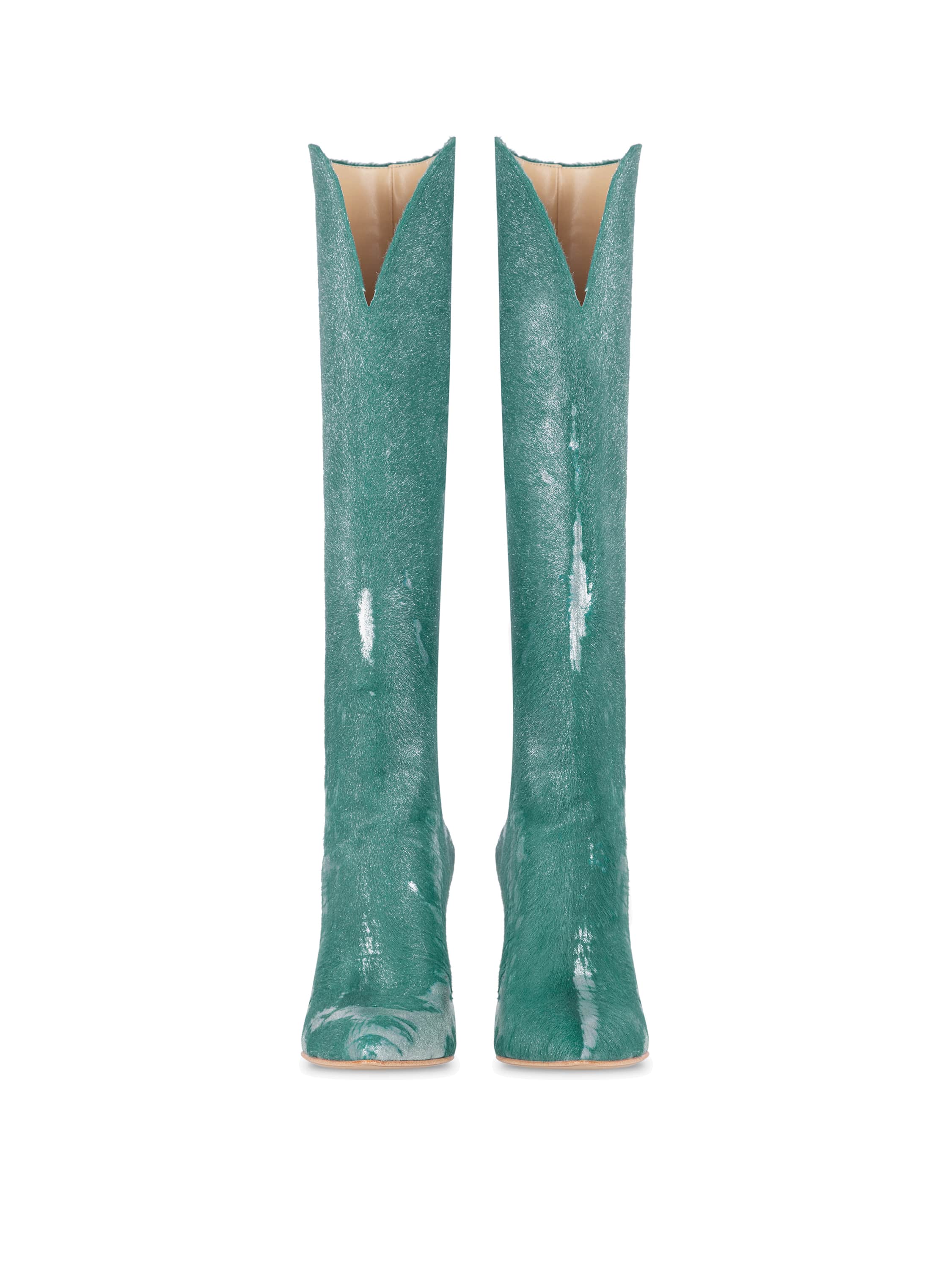 Silver & Turquiose Pony Fur Heeled Tall Boots