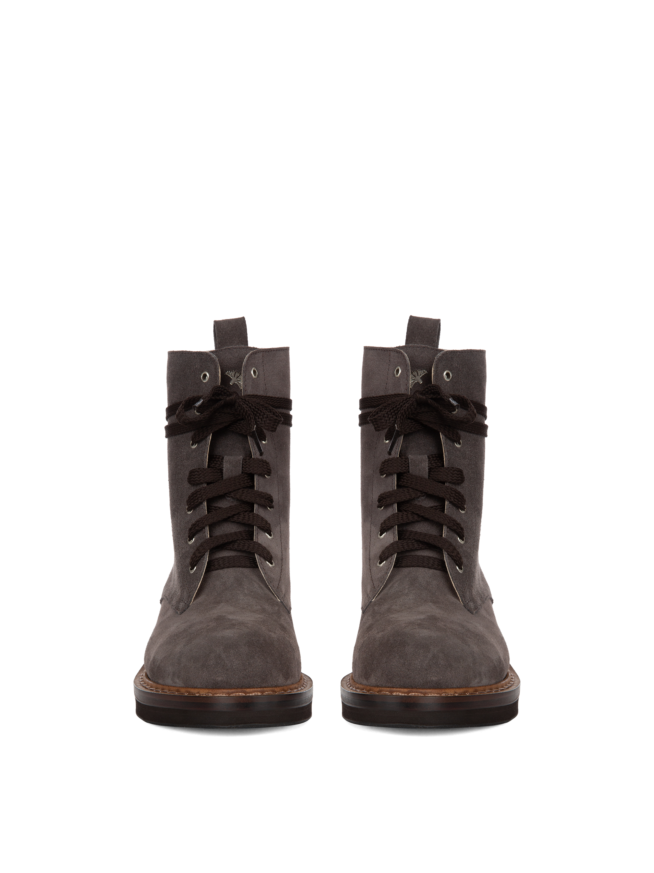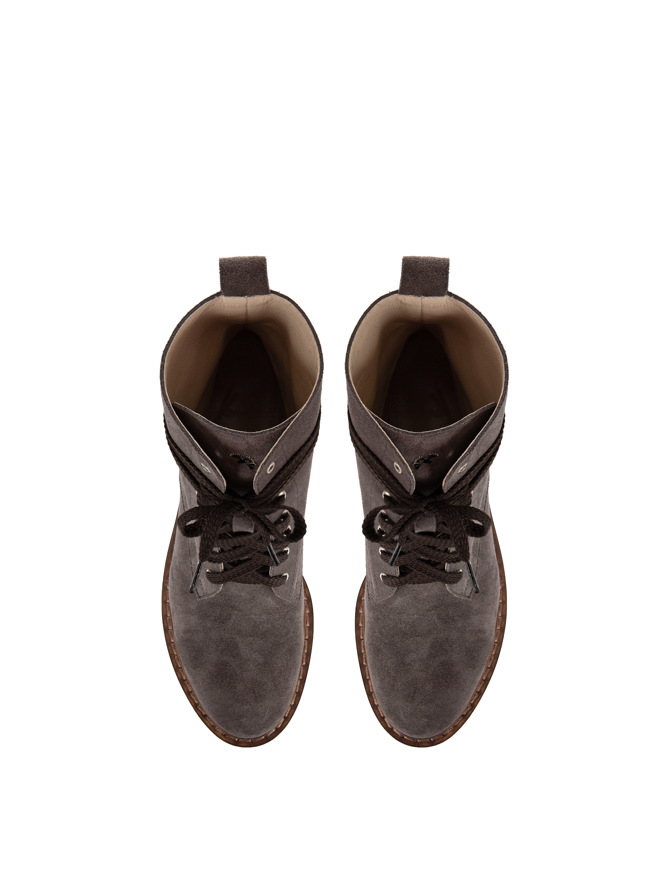 High grey boots with a round toe and brown lacing are made of genuine suede. The thick brown sole is made of pressed leather and protected by a rubber tread.