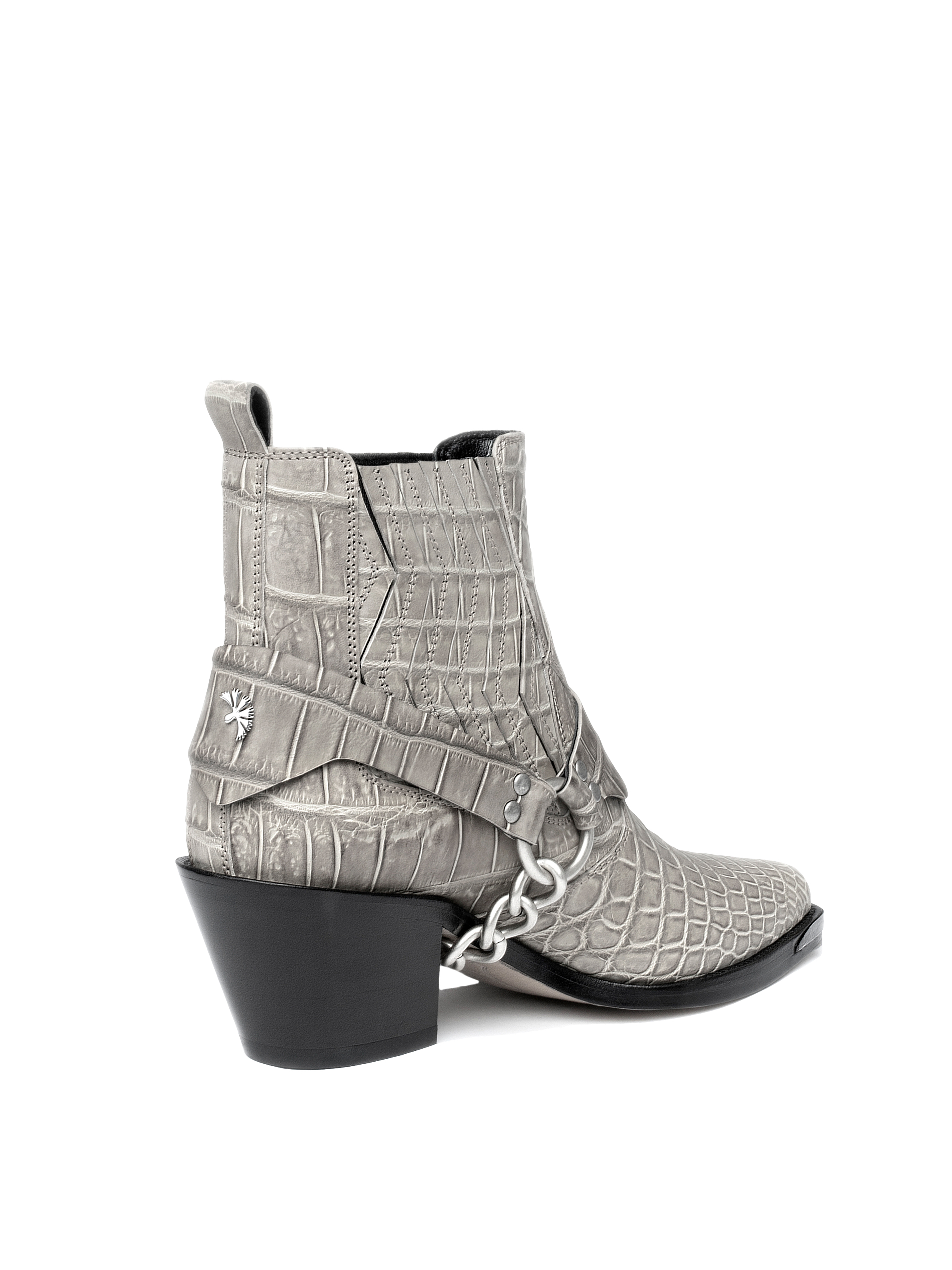 Short gray cowboy boots made of crocodile leather, complemented by silver chain fittings. Perfect for autumn.