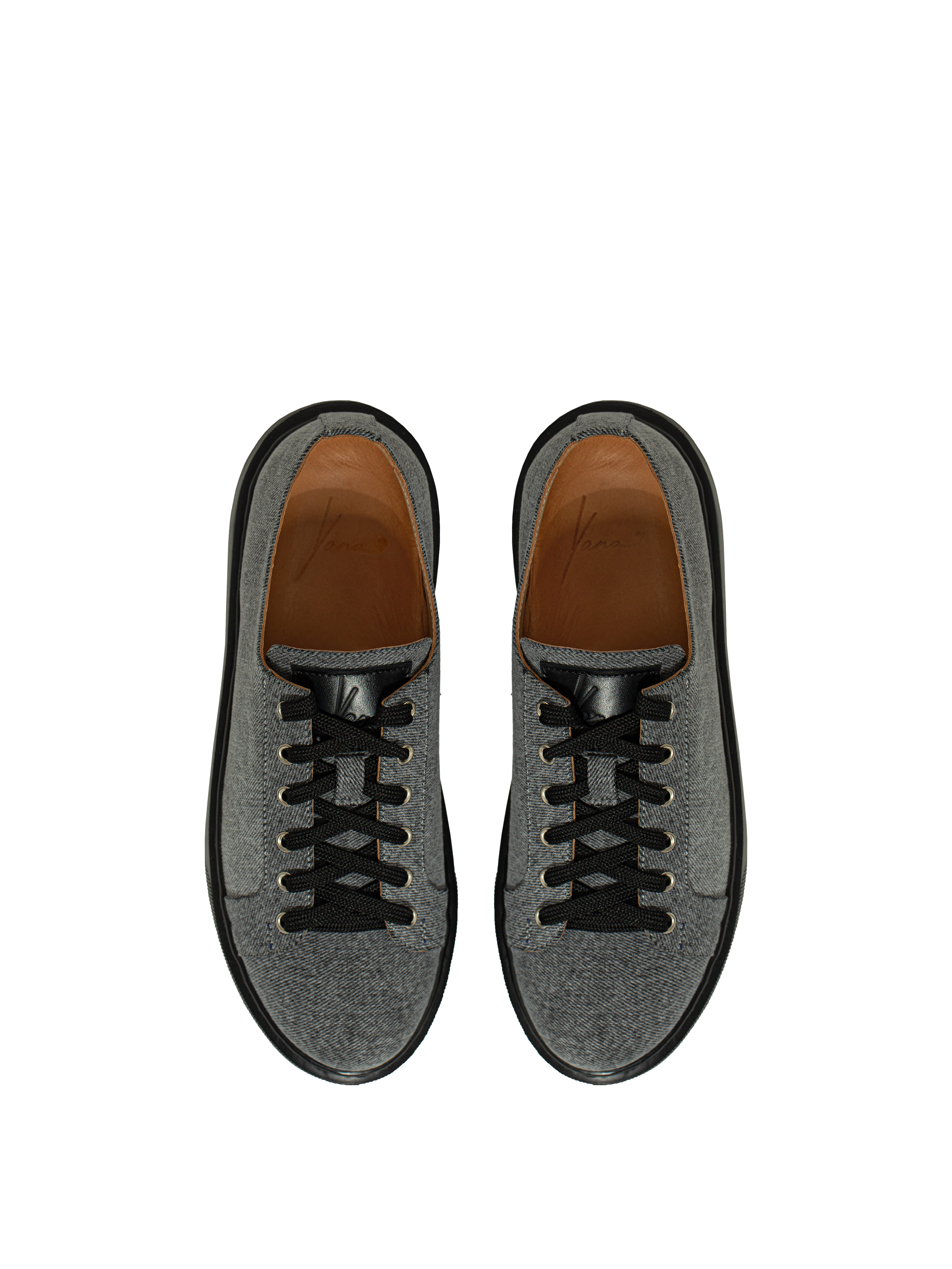 Grey denim sneakers with a wide black sole. The interior is made of natural beige leather. Decorated with a black leather patch with the brand’s logo on the front.