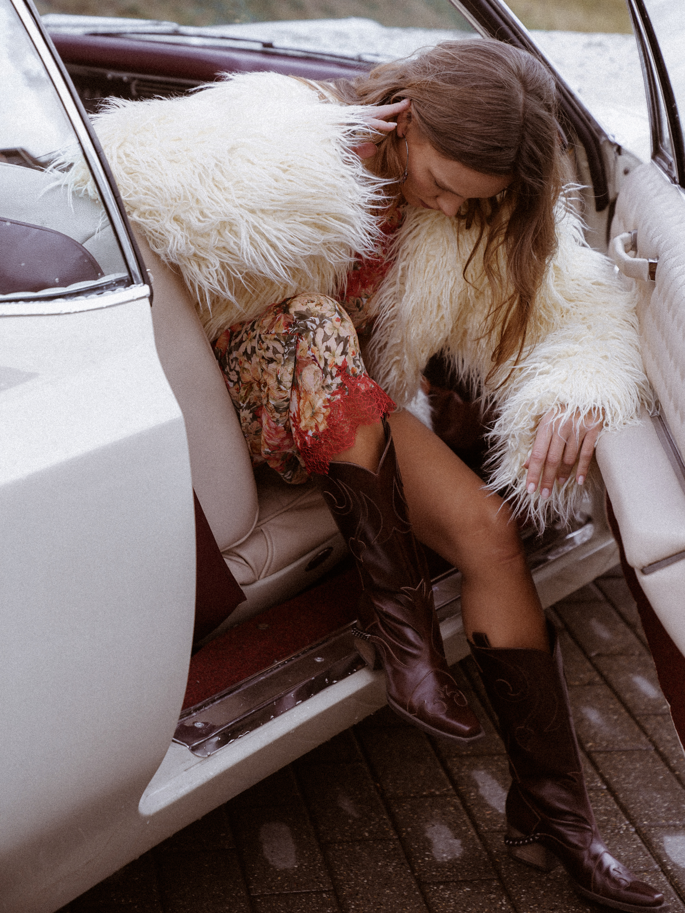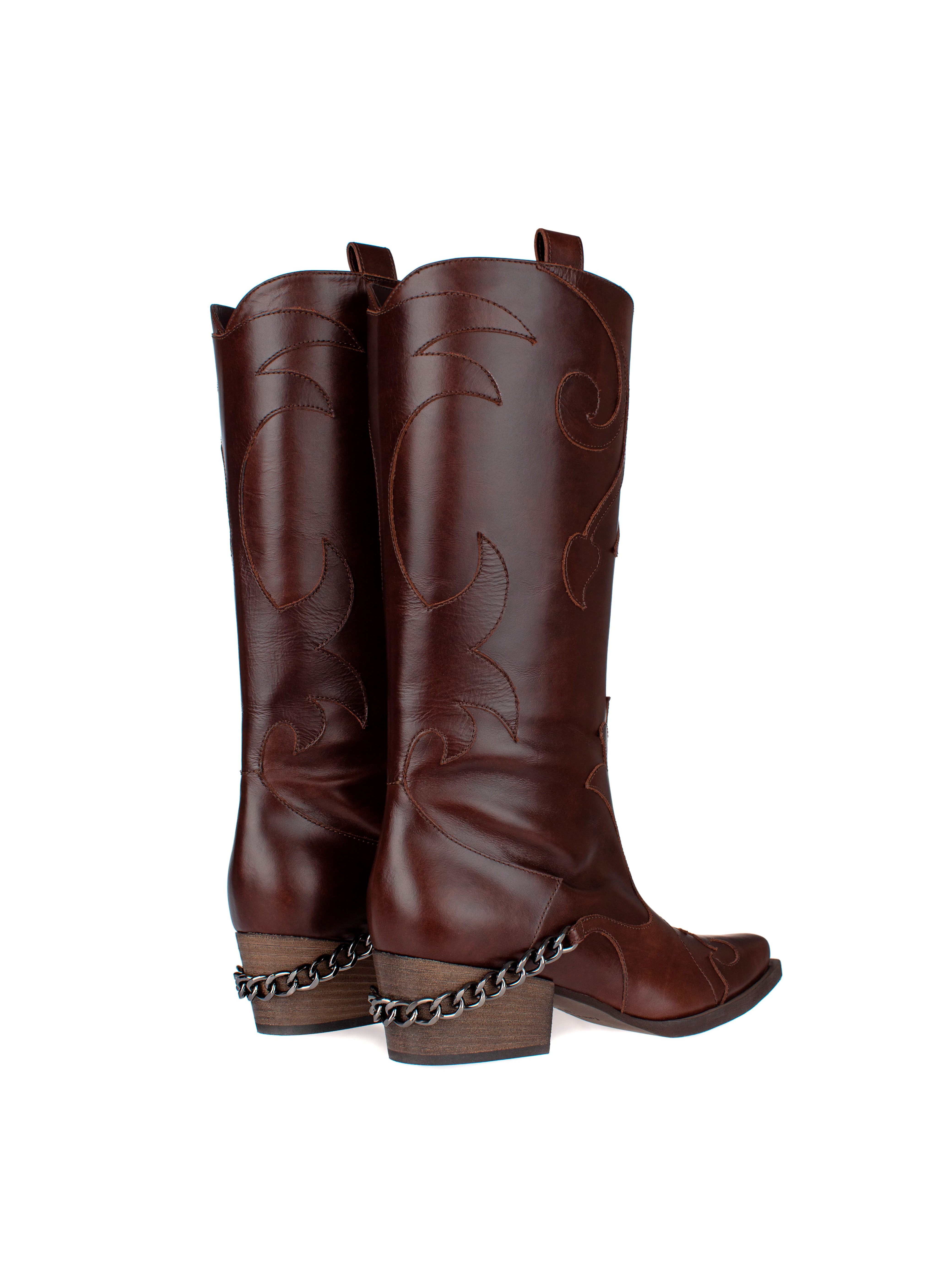 Dark brown cowboy boots are a vivid example of versatile footwear that pairs equally well with both jeans and dresses. The brand’s craftsmen made the model from genuine leather and set it on a slightly slanted heel. The boots are complemented by shaped details and a black shiny chain.