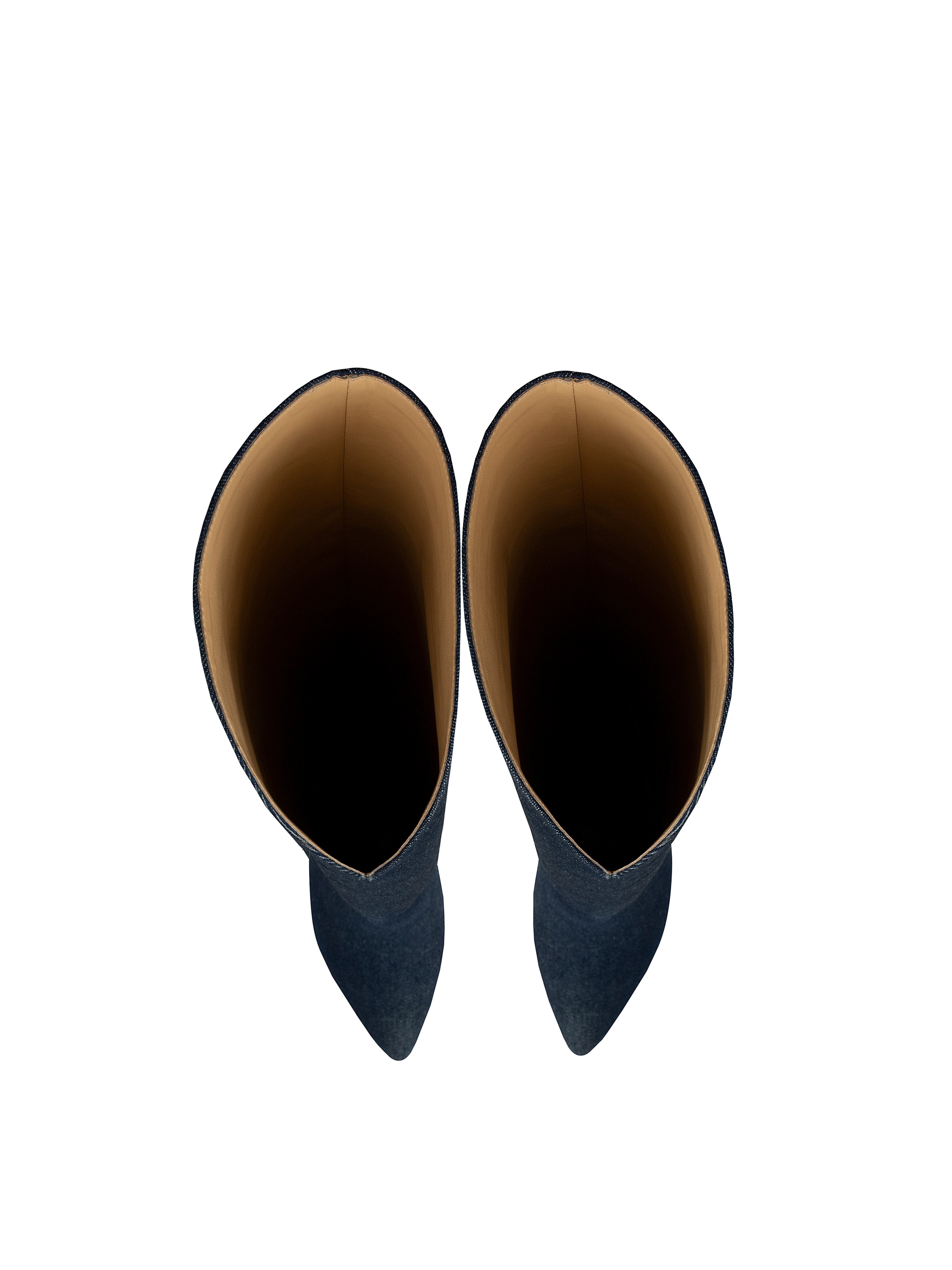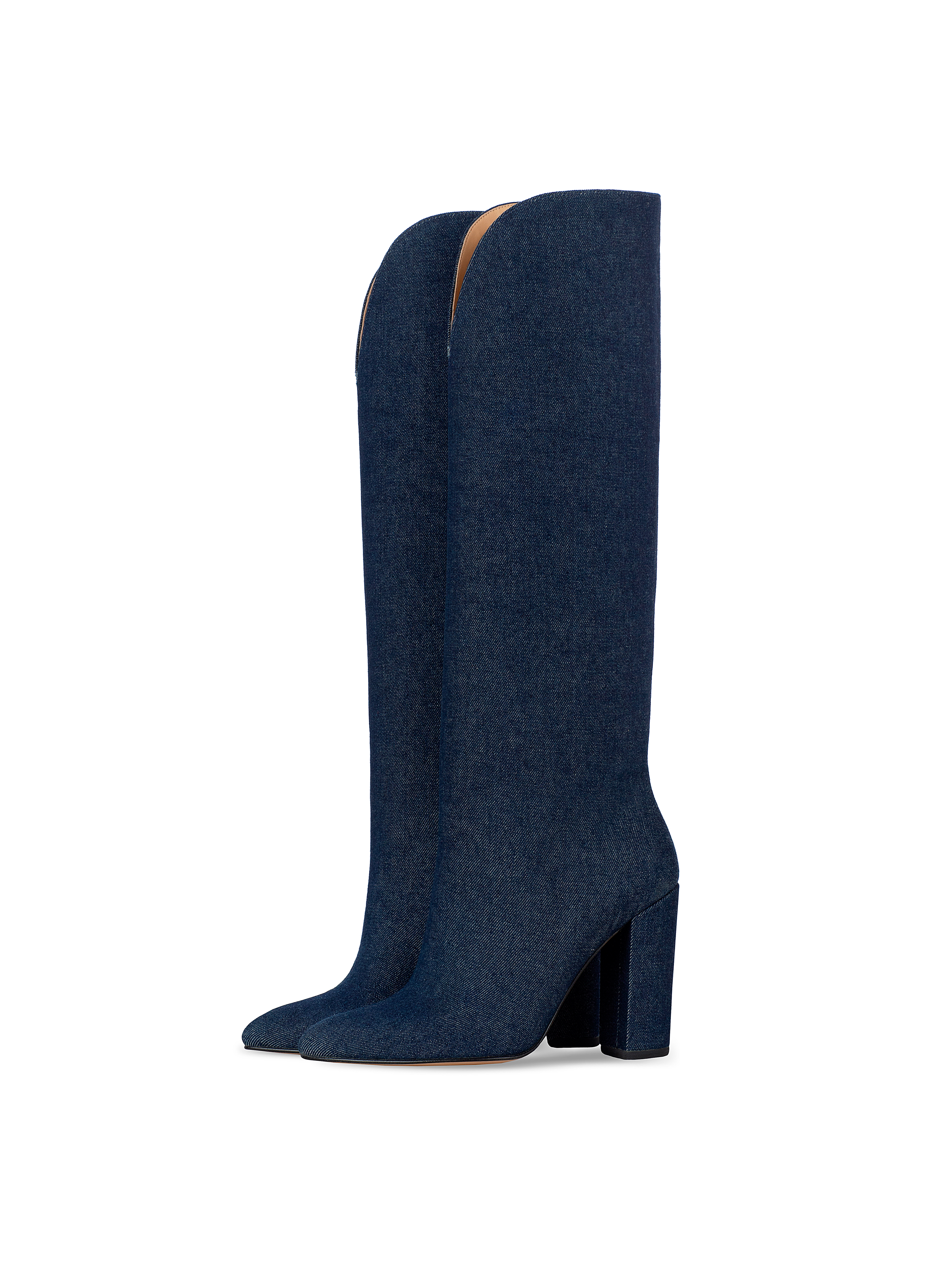 High-heeled boots with pointed toes will help create a memorable look. Thanks to the wide shaft with a shaped top edge, the zipperless boots are easy to put on and take off. For this model, natural brown leather is covered with dark blue denim fabric.