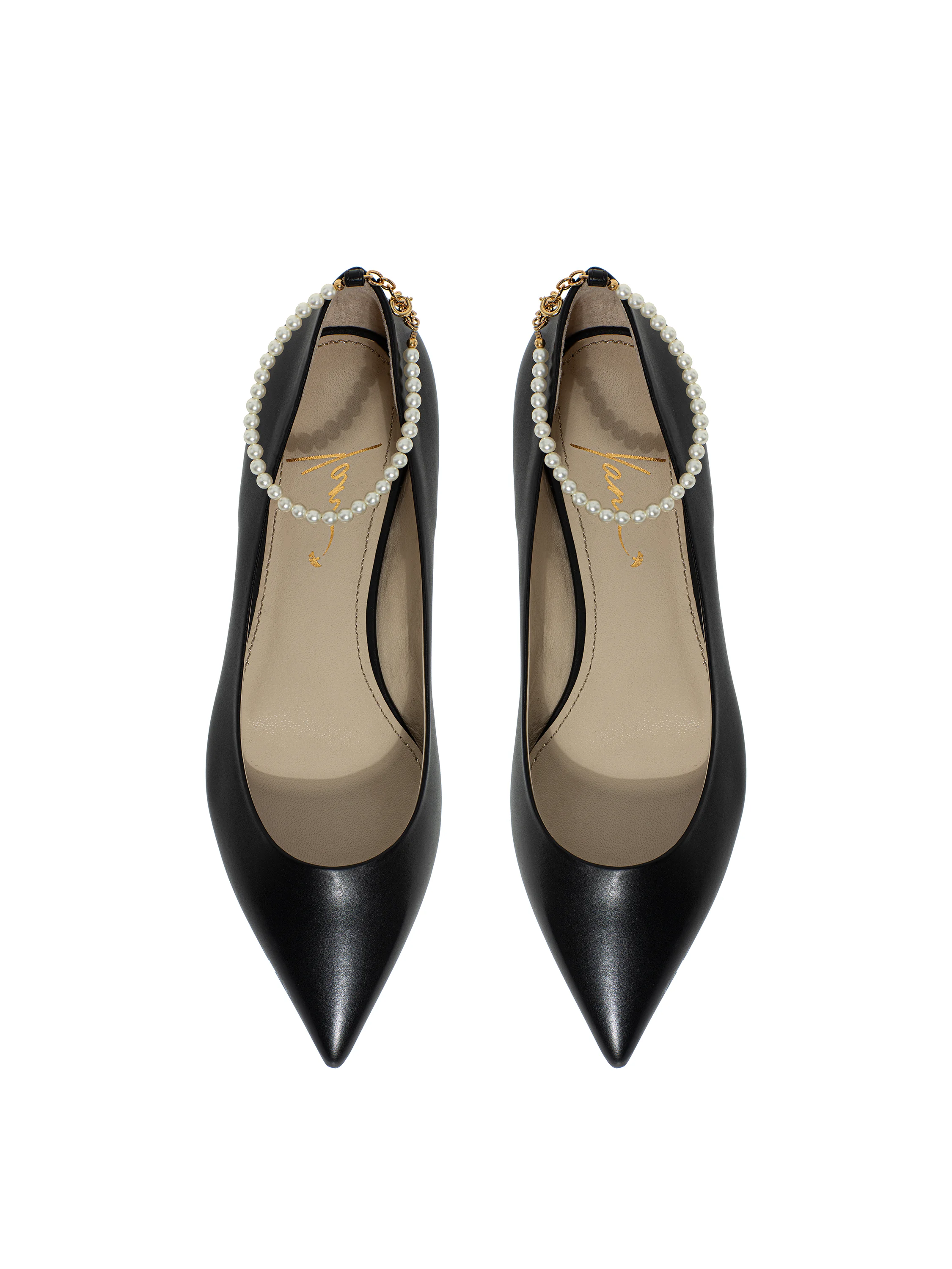 The black ballet flats are made of smooth genuine leather. The model with a classic pointed toe and a thin ankle strap made of pearl beads looks especially refined.
