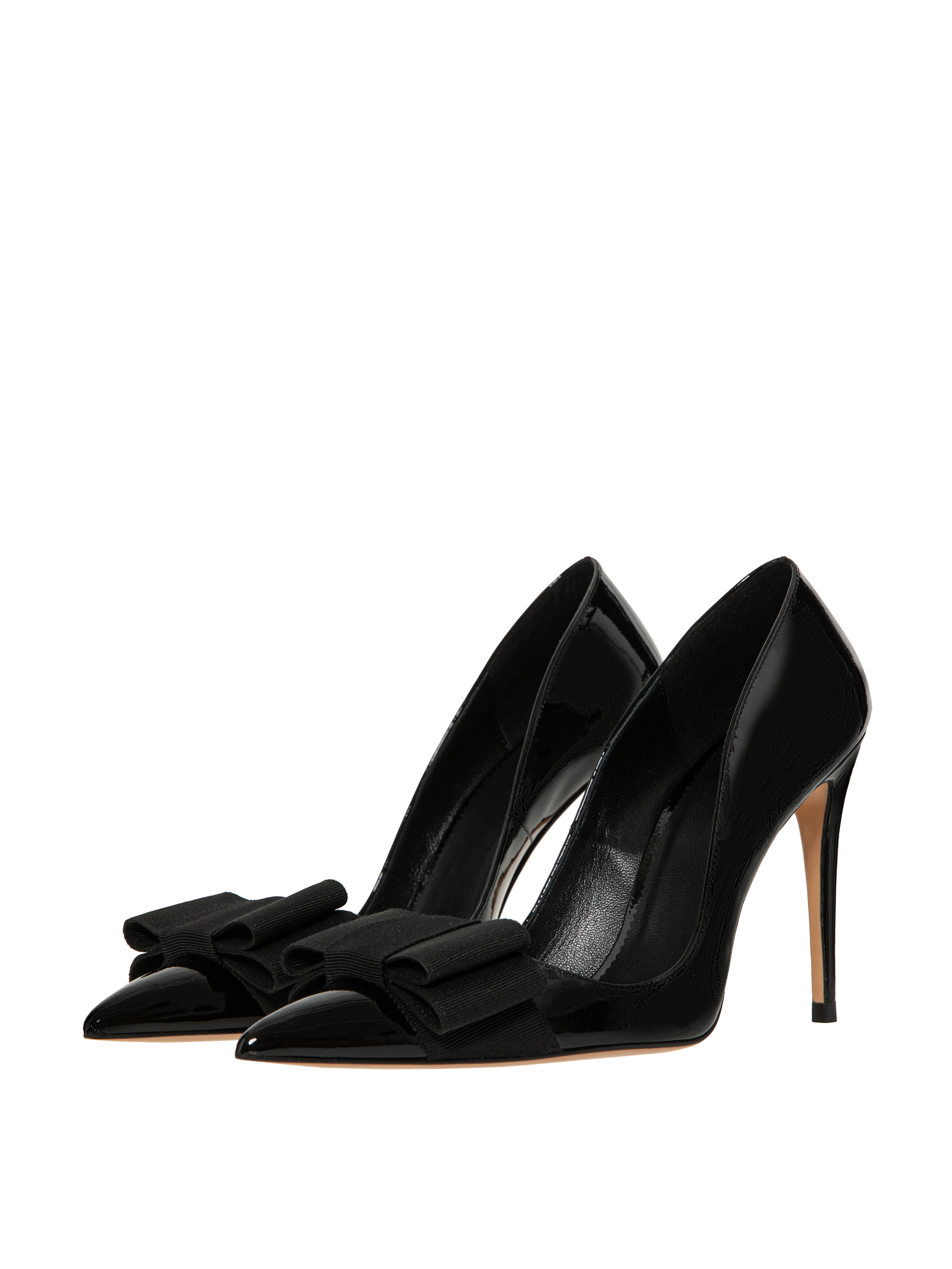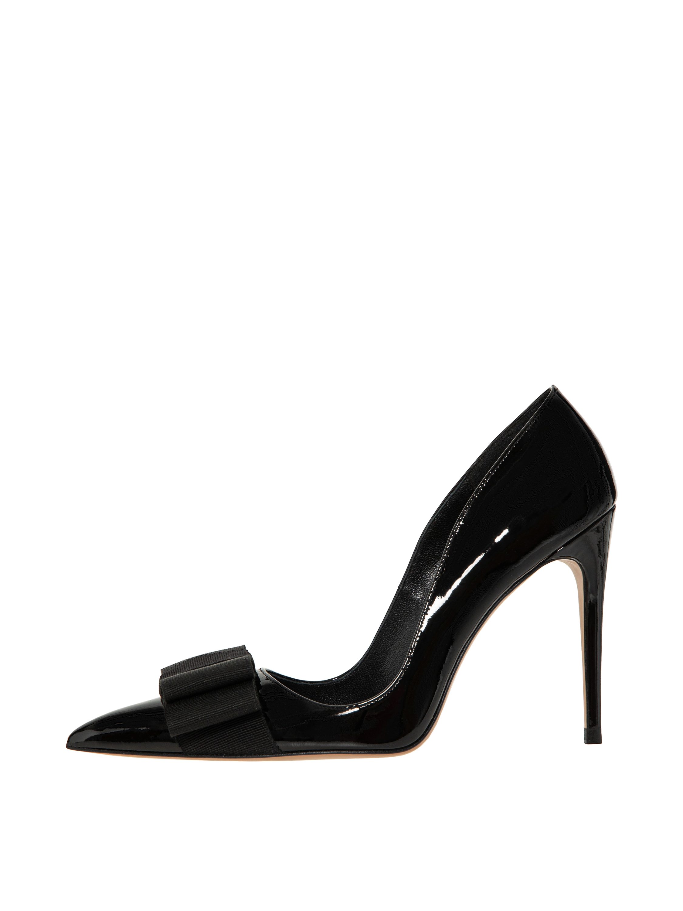 Elegant pumps with an elongated pointed toe are made of black patent leather. The classic stiletto model is decorated with an accent bow.