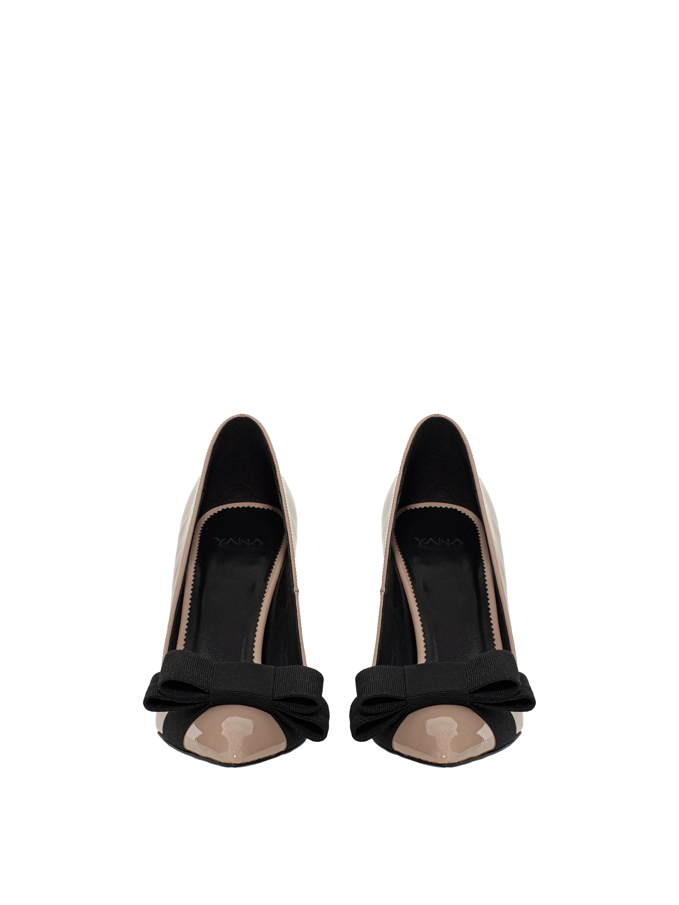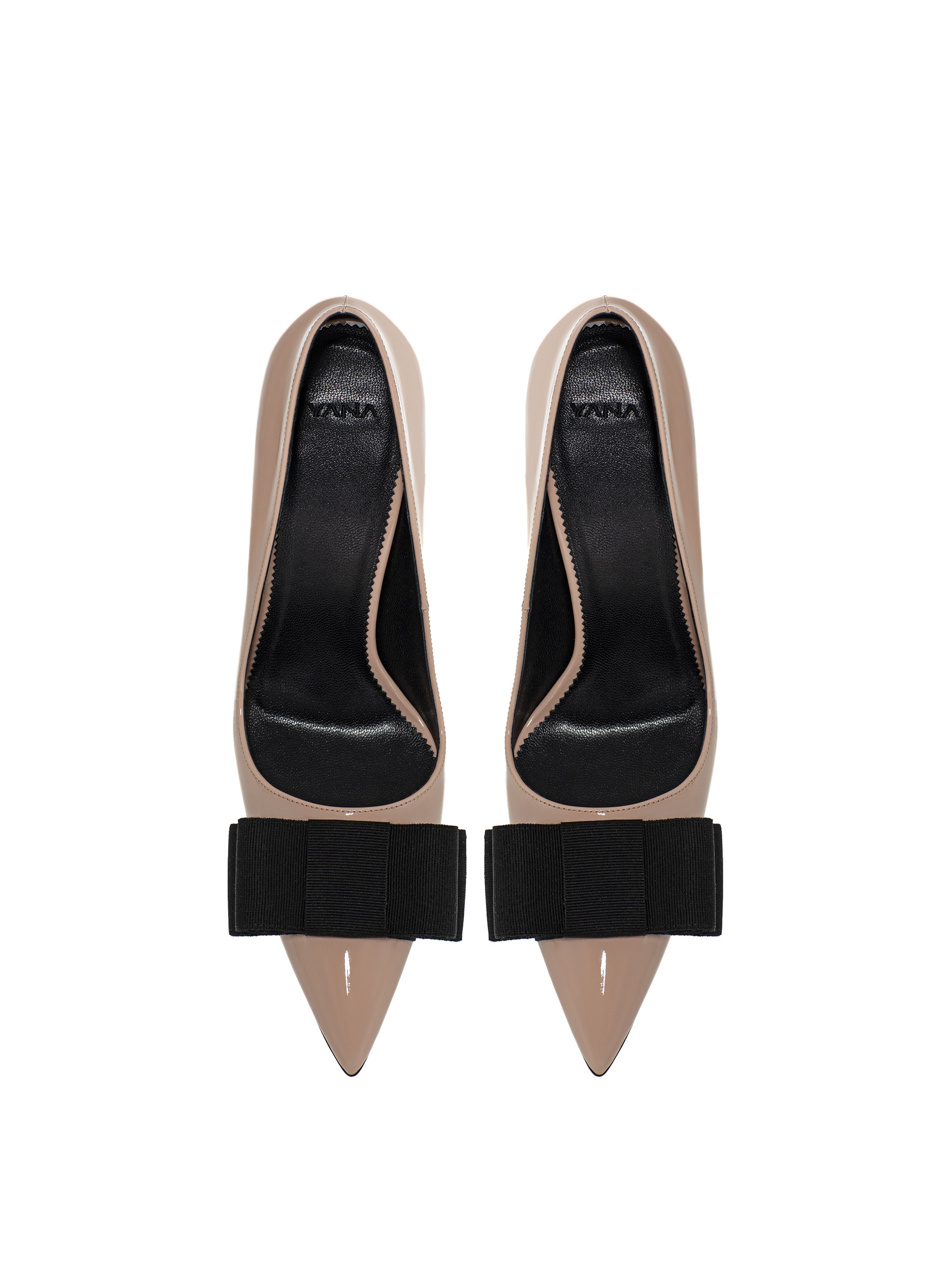 Elegant powder-pink pumps are crafted from patent leather. The elongated toe is adorned with a black bow.