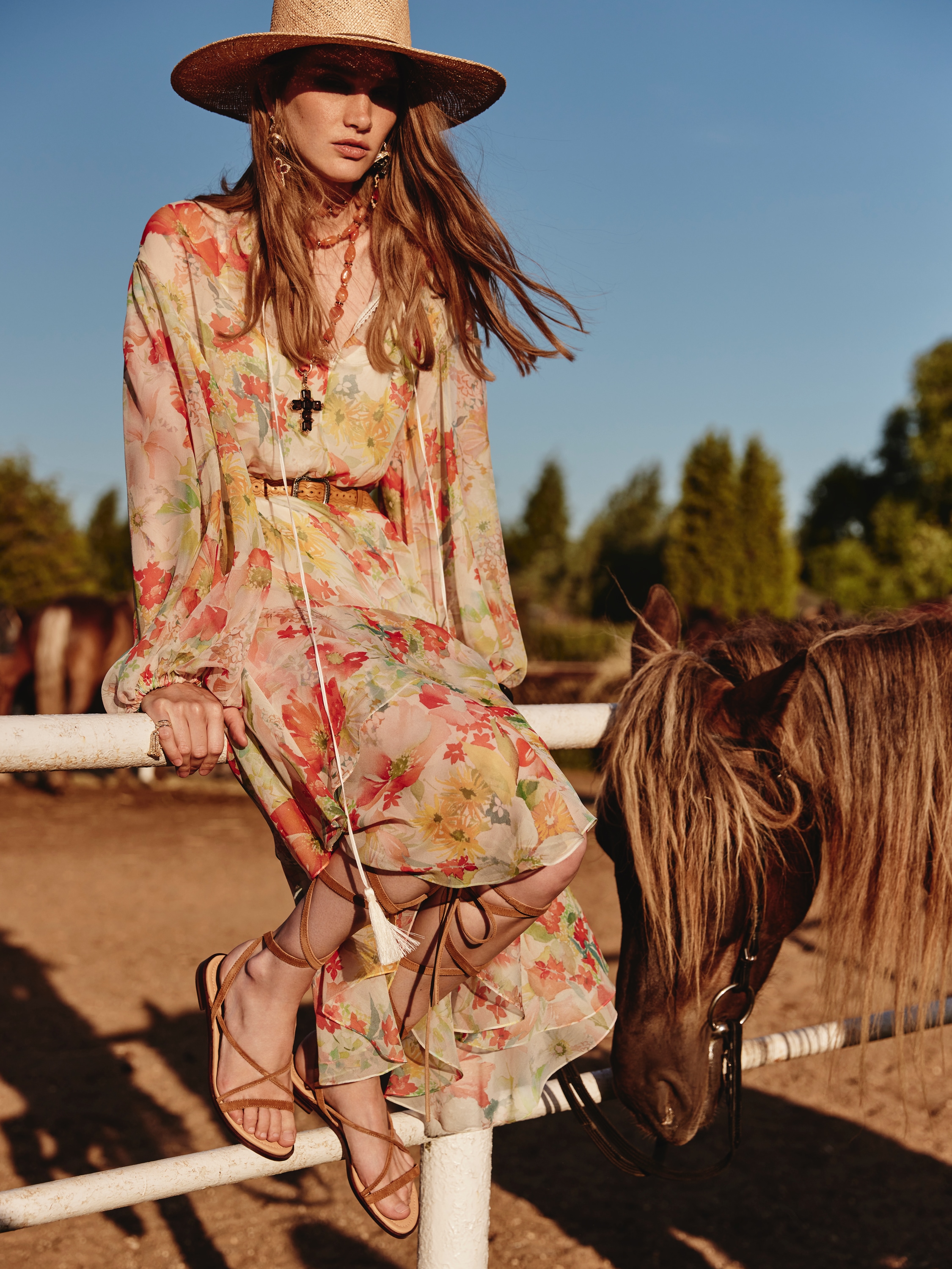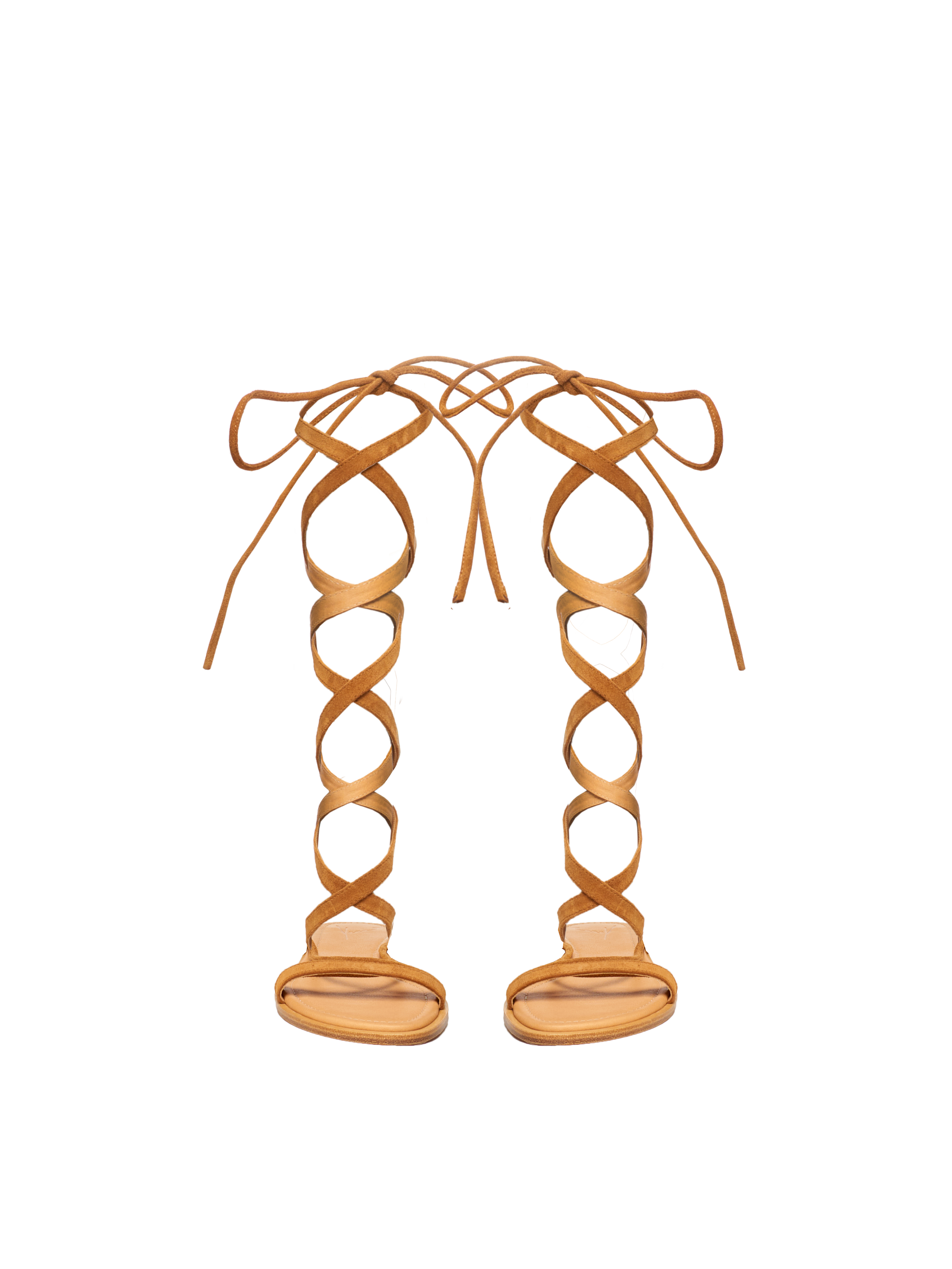 High gladiator sandals are made of brown suede. The crisscross wrap will emphasize the slenderness of your legs, and the small stacked heel will prevent fatigue after long walks.