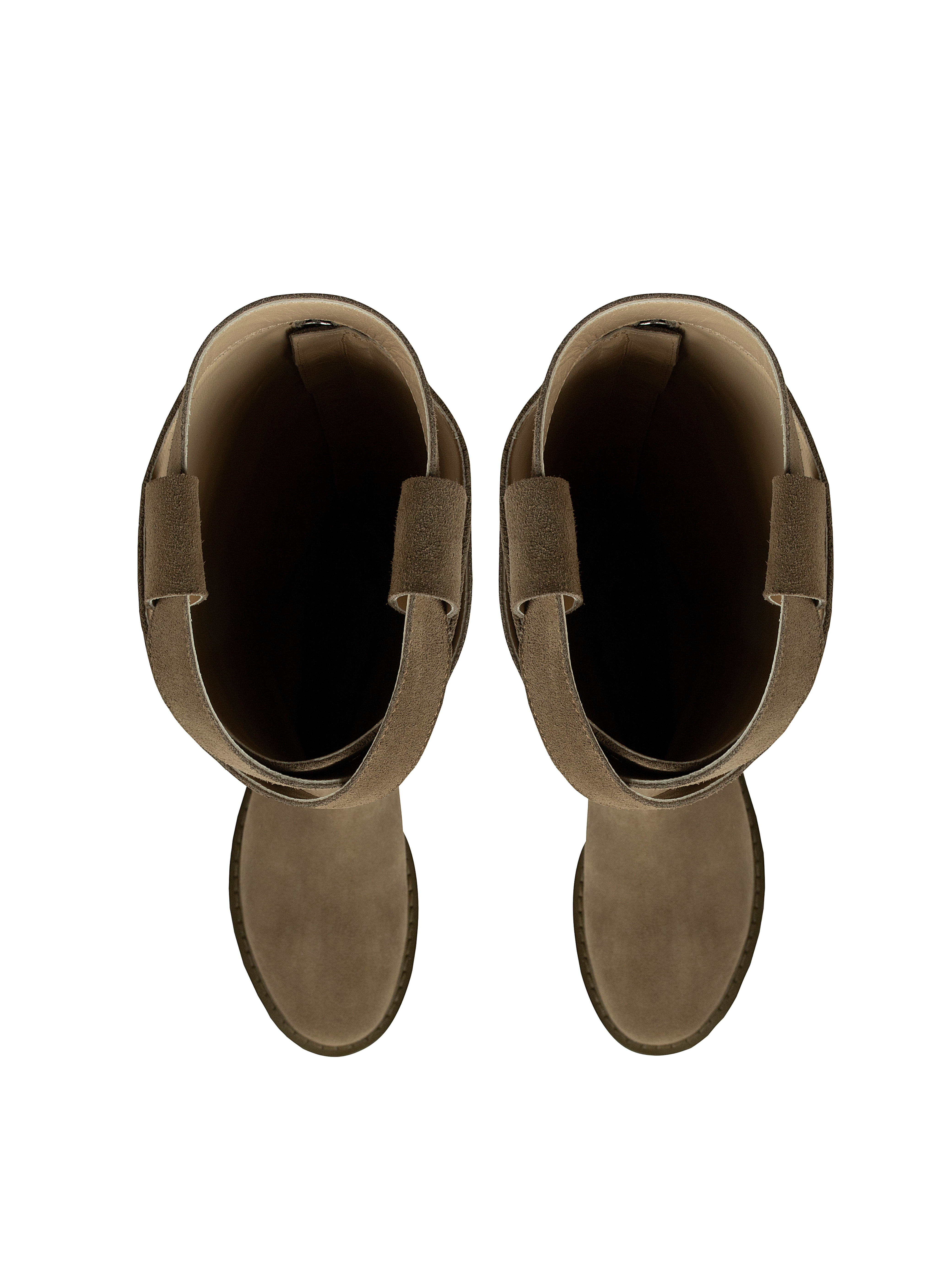 Khaki boots with a round toe and a low square heel are made of genuine suede. The high shaft is complemented by leather straps. Thanks to the small side loops, the slip-on model is easy to put on and take off.