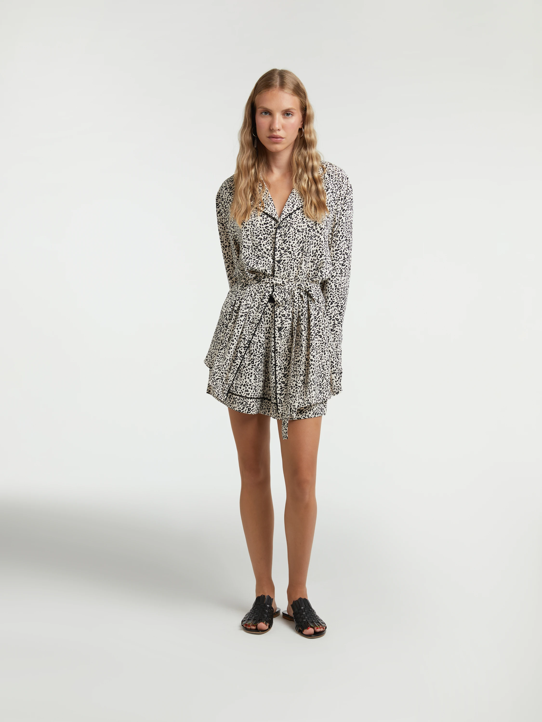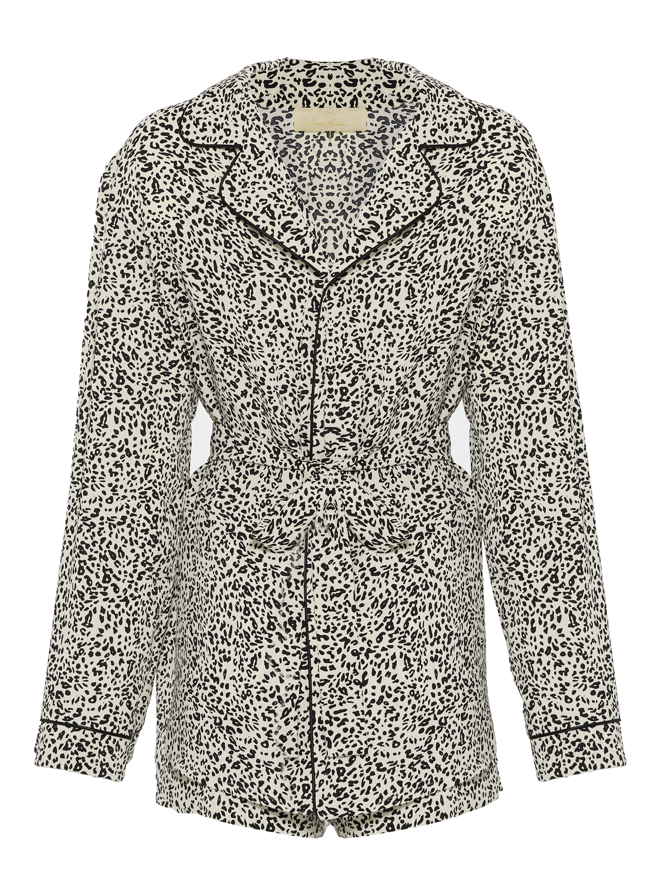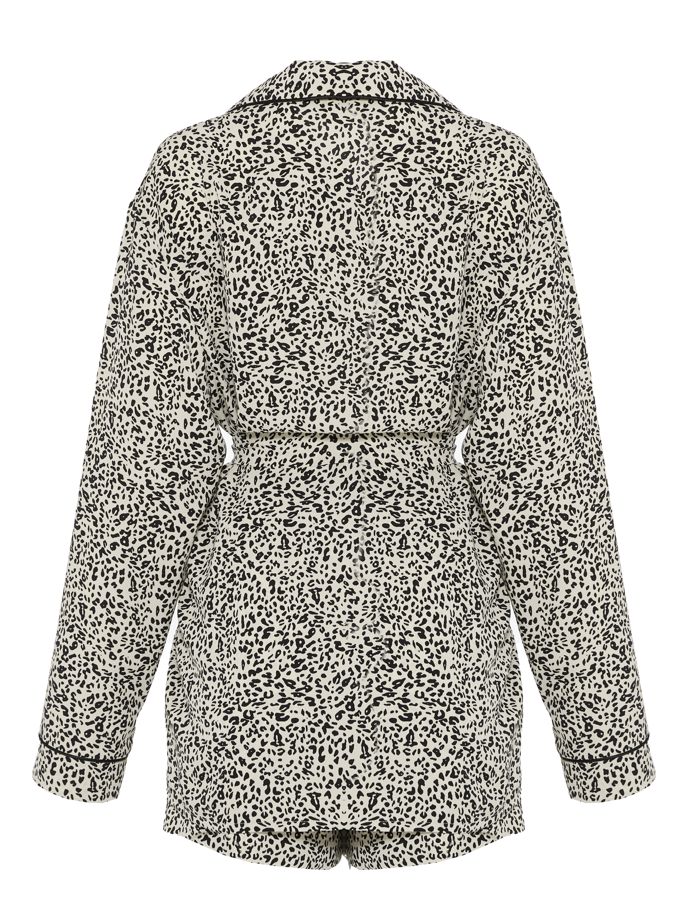 The beige pajamas are made of viscose with a leopard print. The set consists of a long-sleeved shirt with a belt and loose shorts with a wide black elastic waistband.
