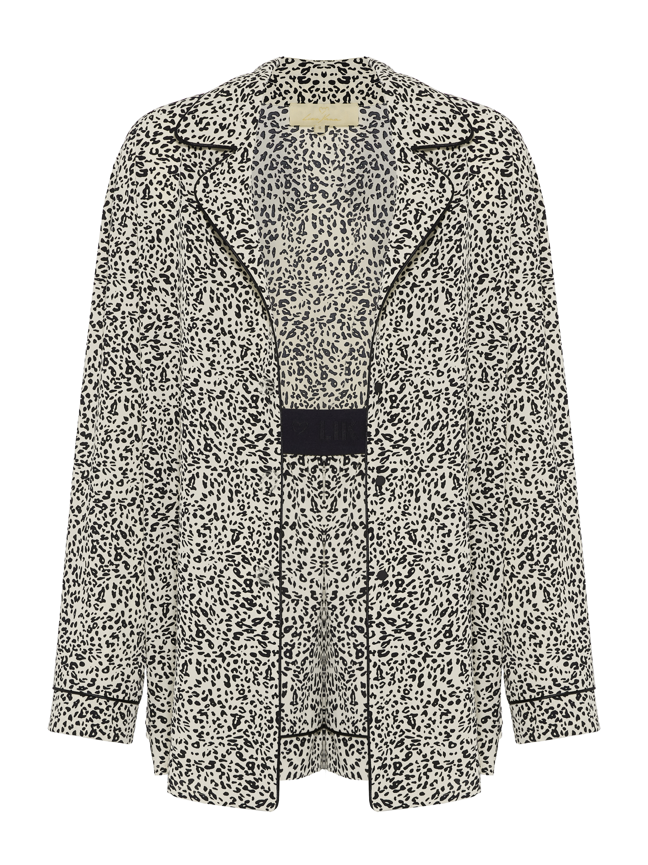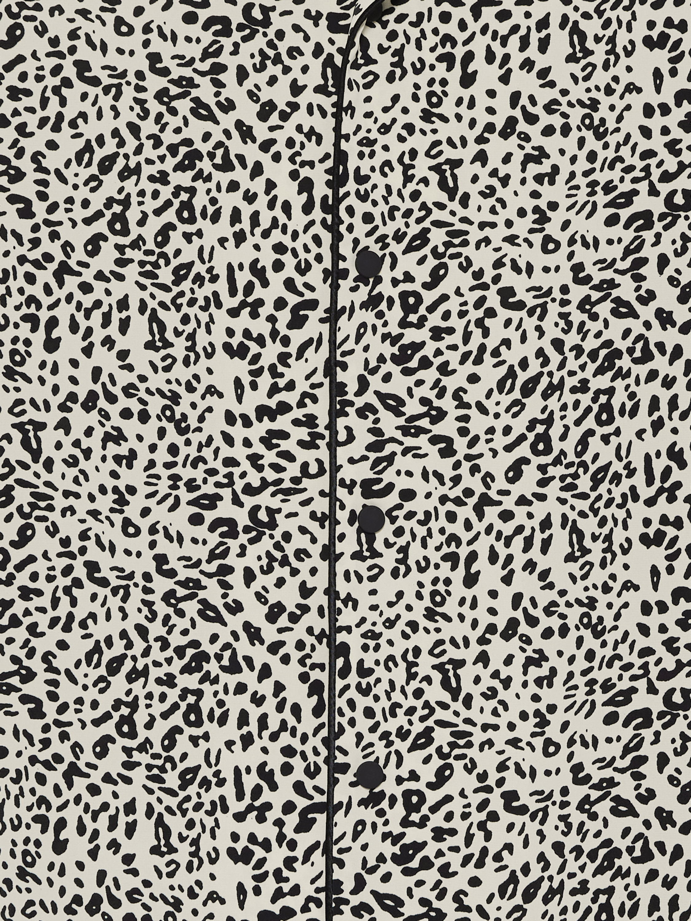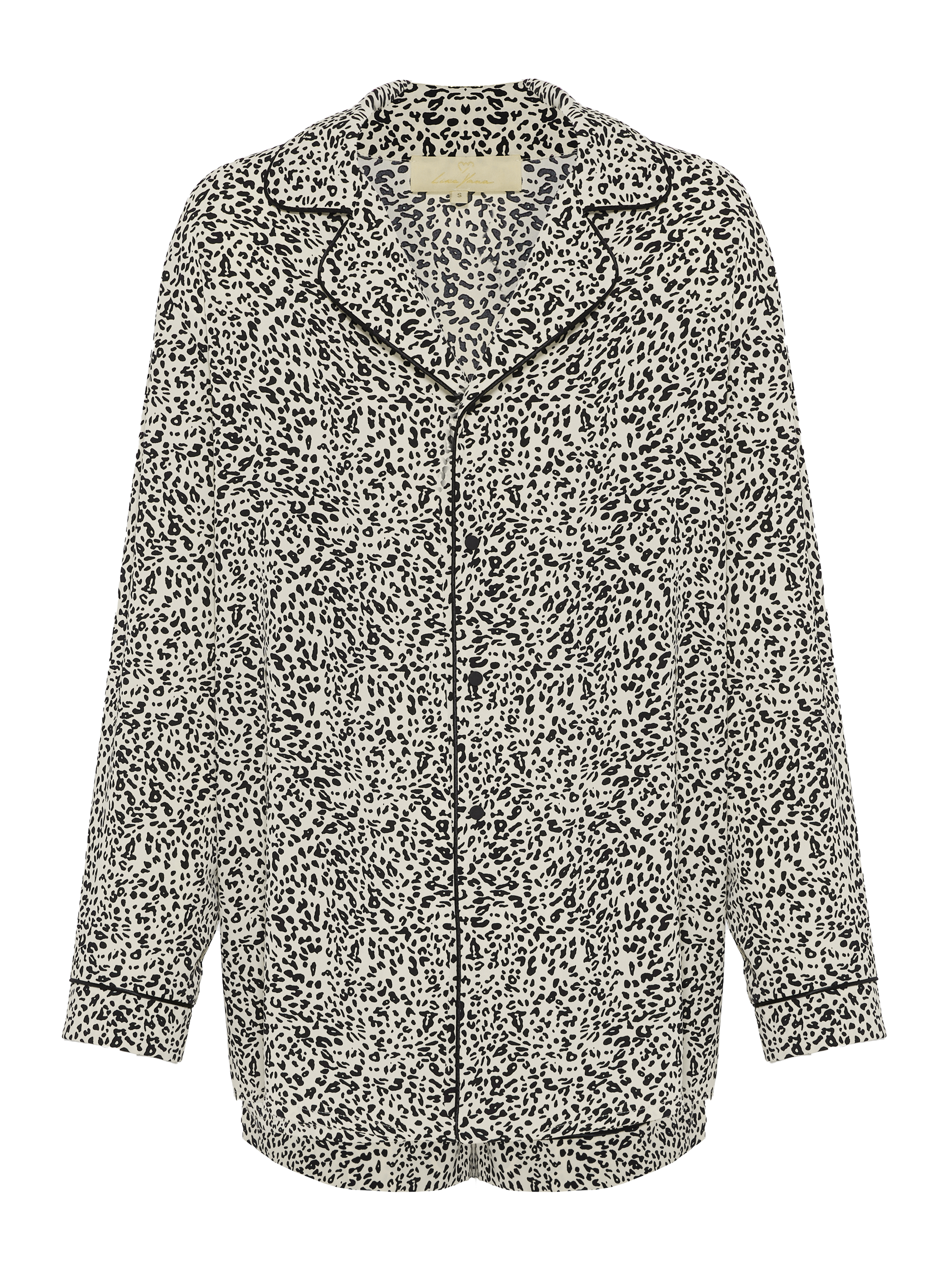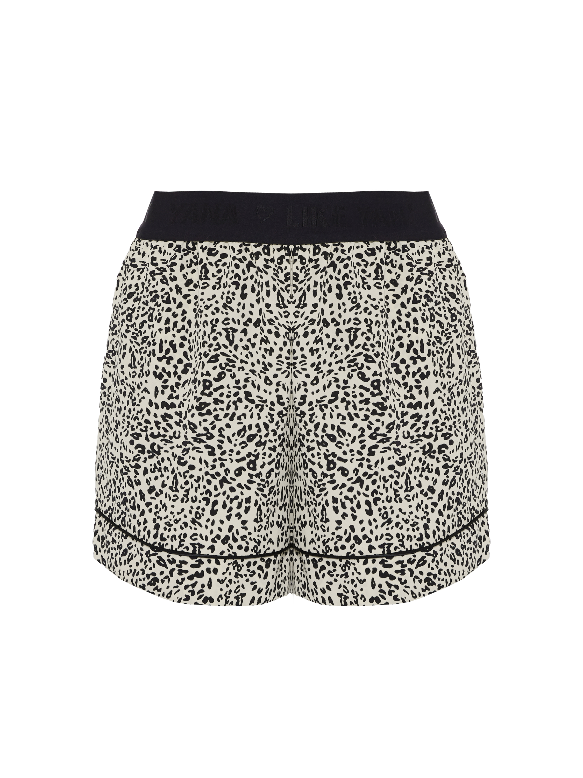 The beige pajamas are made of viscose with a leopard print. The set consists of a long-sleeved shirt with a belt and loose shorts with a wide black elastic waistband.