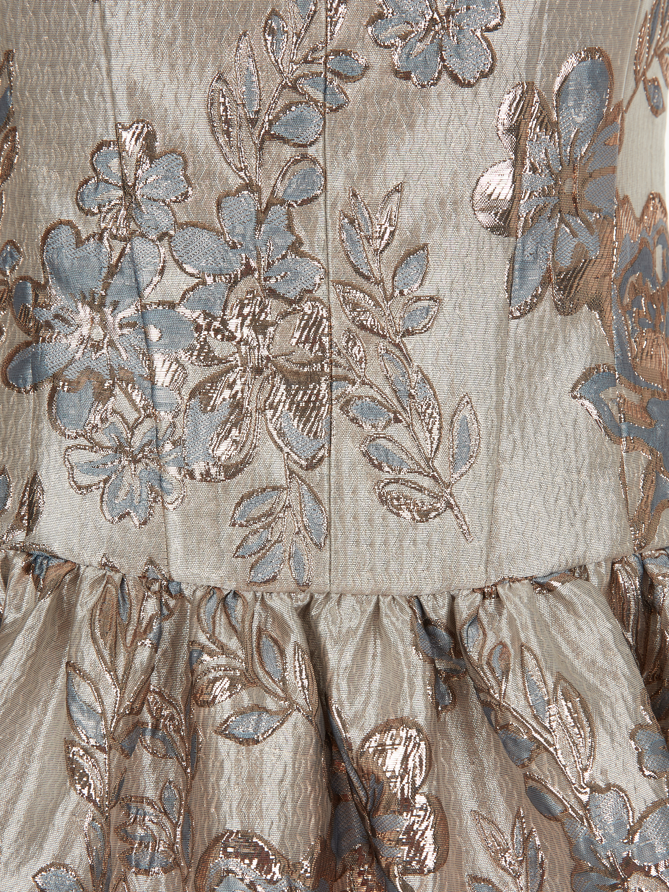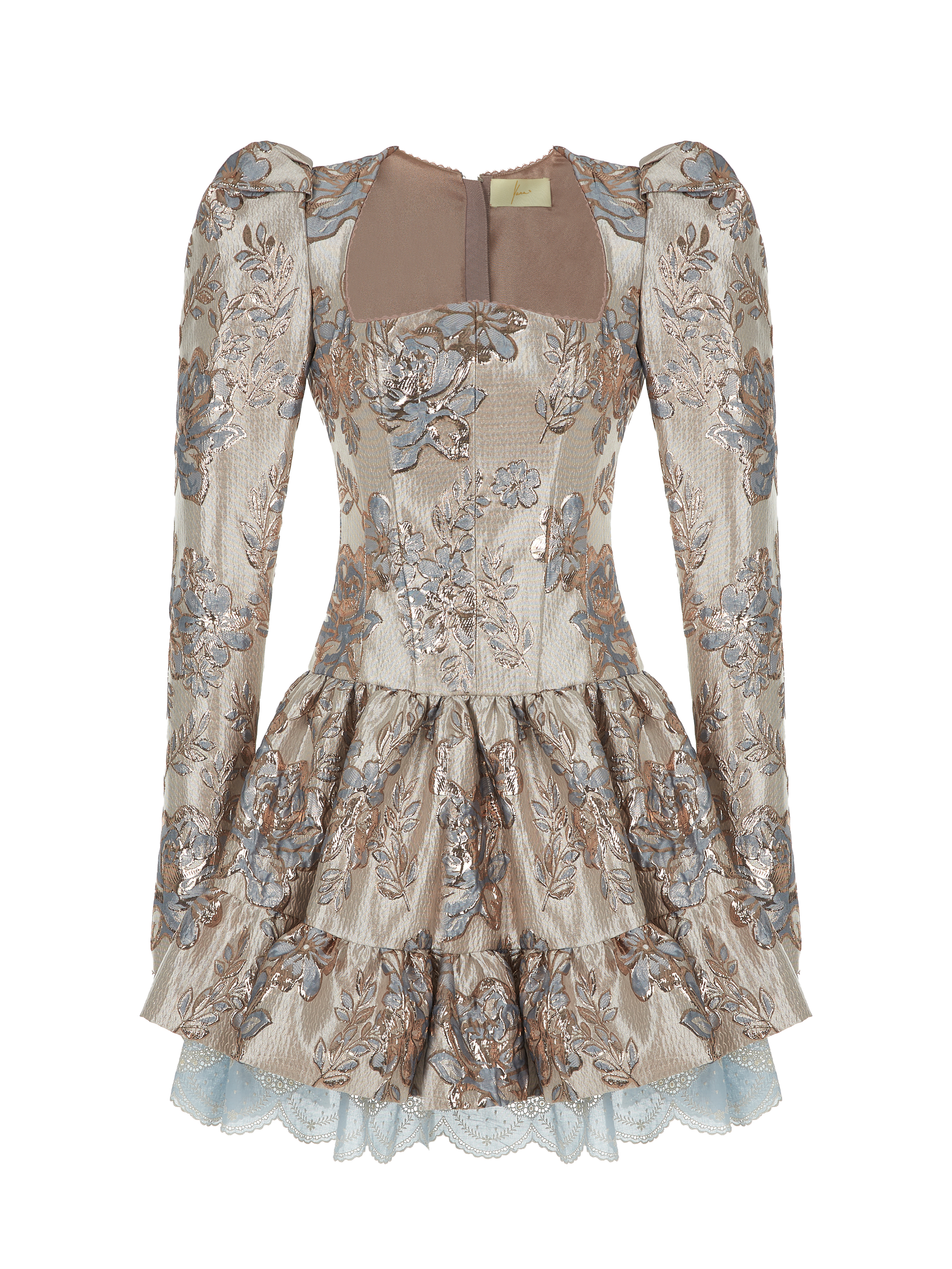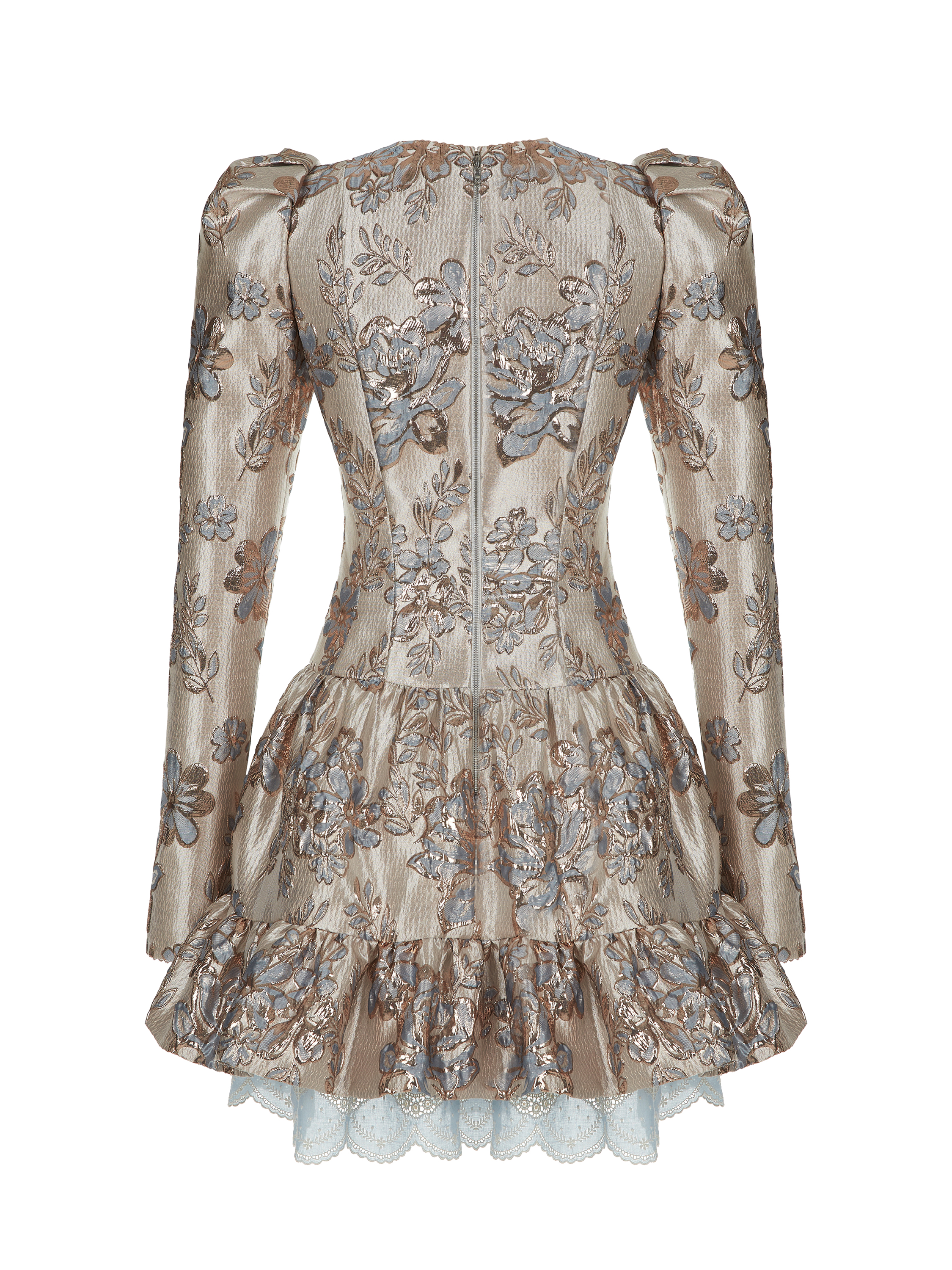 The mini dress is made of beige brocade with blue flowers. The model is complemented by a shaped neckline, long puff sleeves, a separate flounce at the hem and a petticoat made of blue broderie anglaise. Fastens with a zipper at the back.