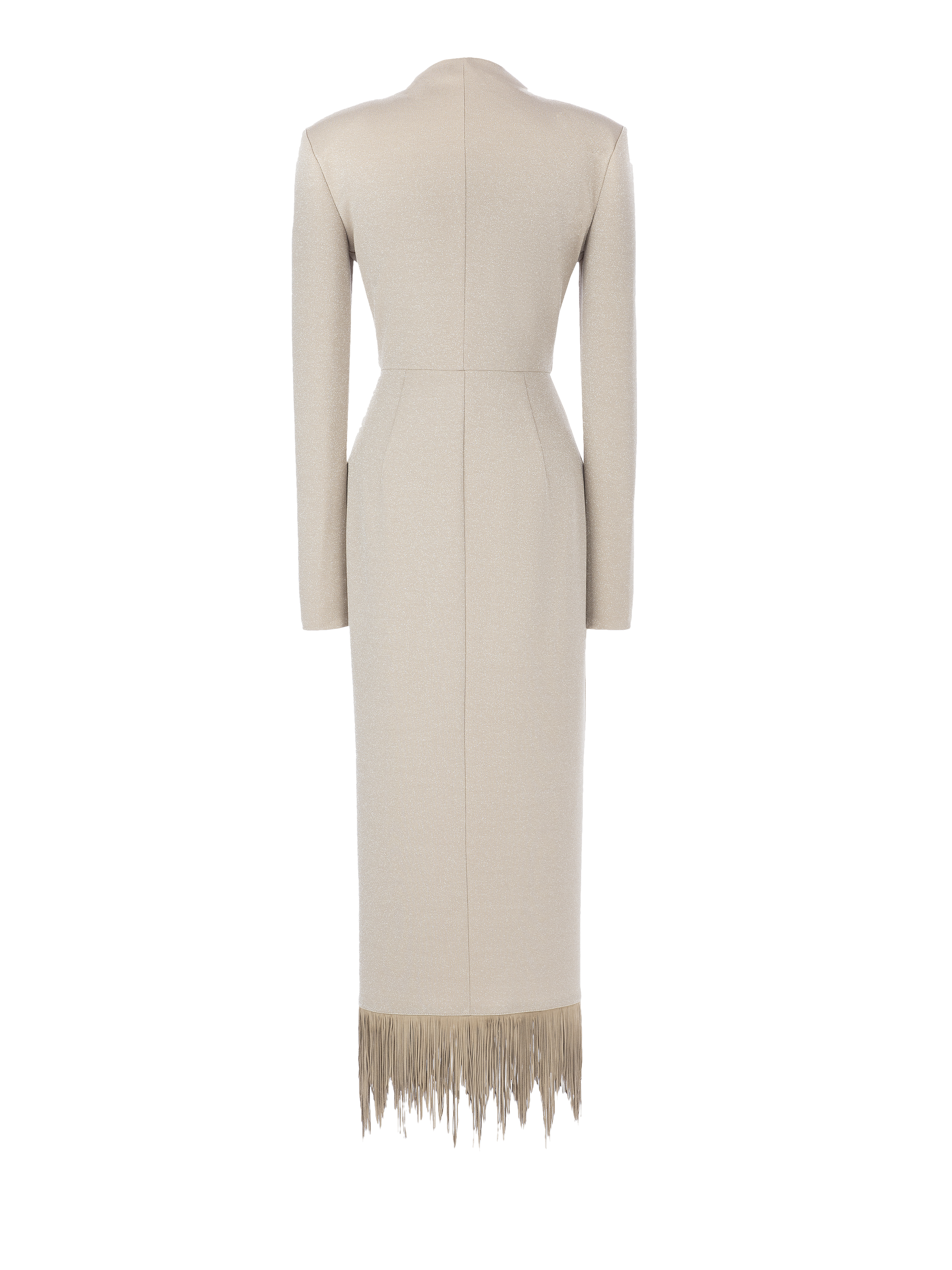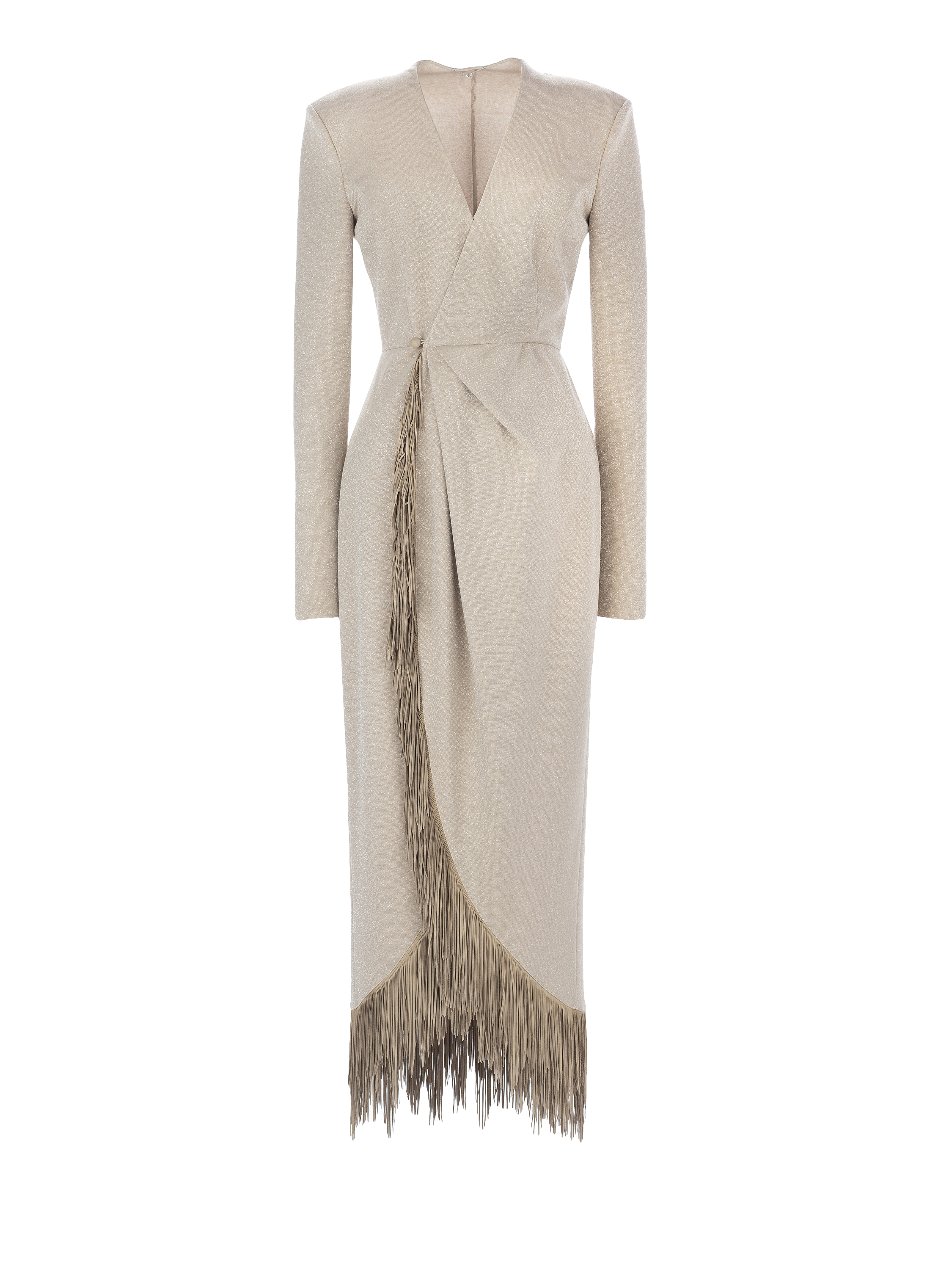 Wrap dress made of beige lurex jersey with suede fringe along the skirt.