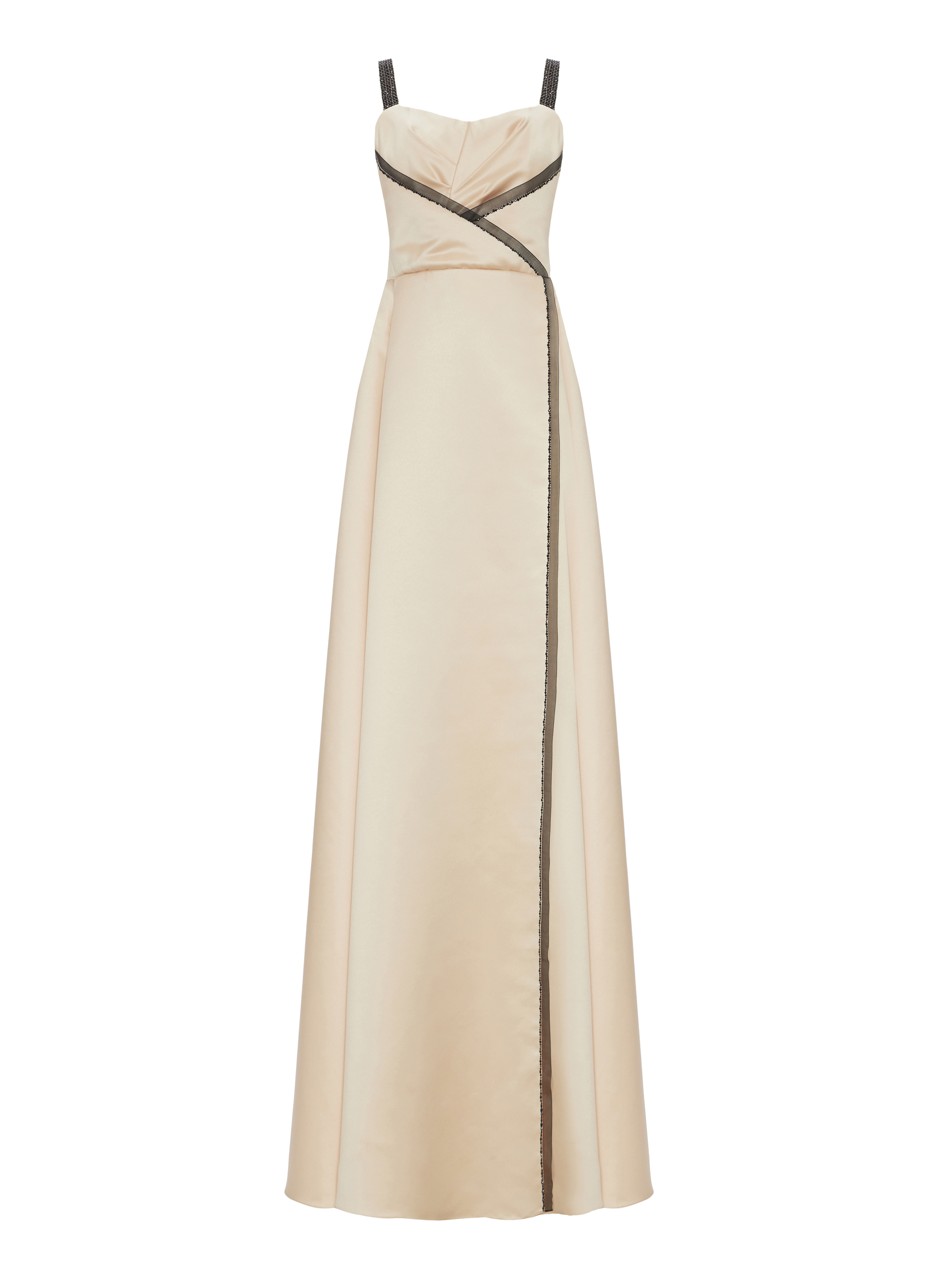 The beige maxi dress is made of natural silk. The contrasting semi-sheer black ribbon and straps are studded with sparkling Swarovski crystals. The corset bodice and back fastening with a concealed zipper.