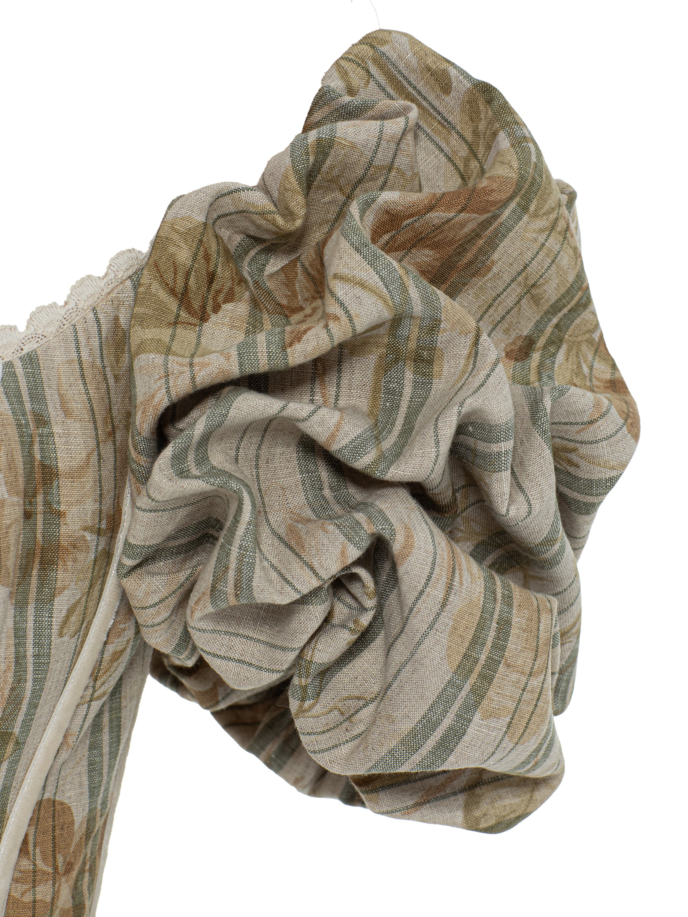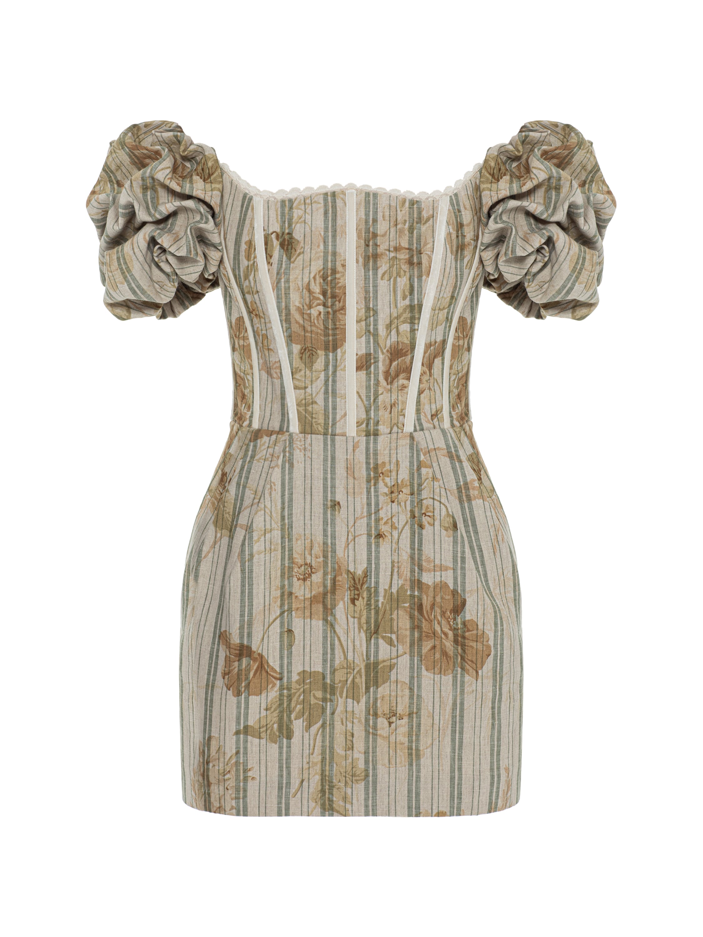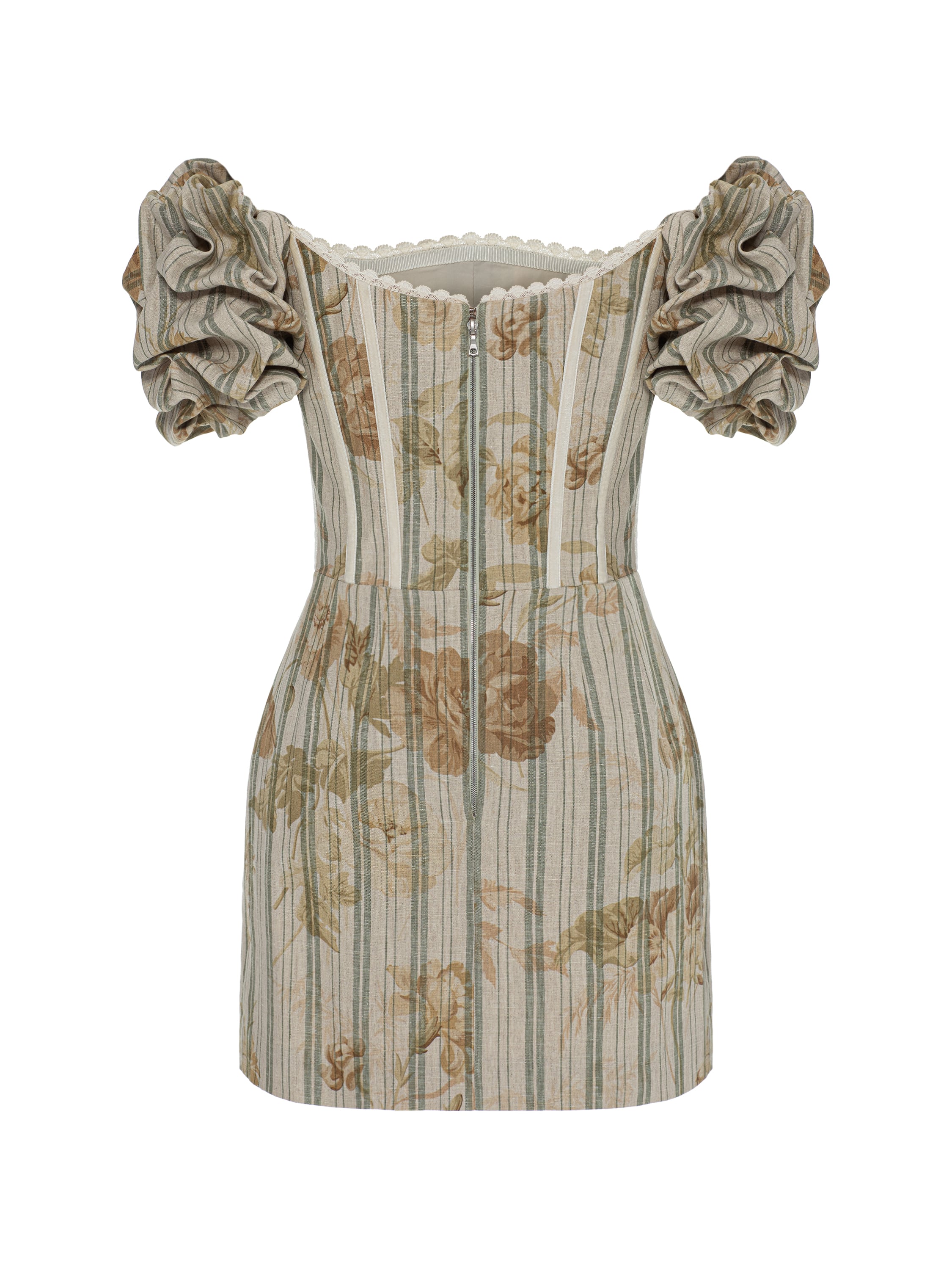 The corset mini dress with voluminous puff sleeves looks striking and instantly becomes the center of attention. The model is made of linen fabric with a floral print. The dress fastens with a zipper at the back.