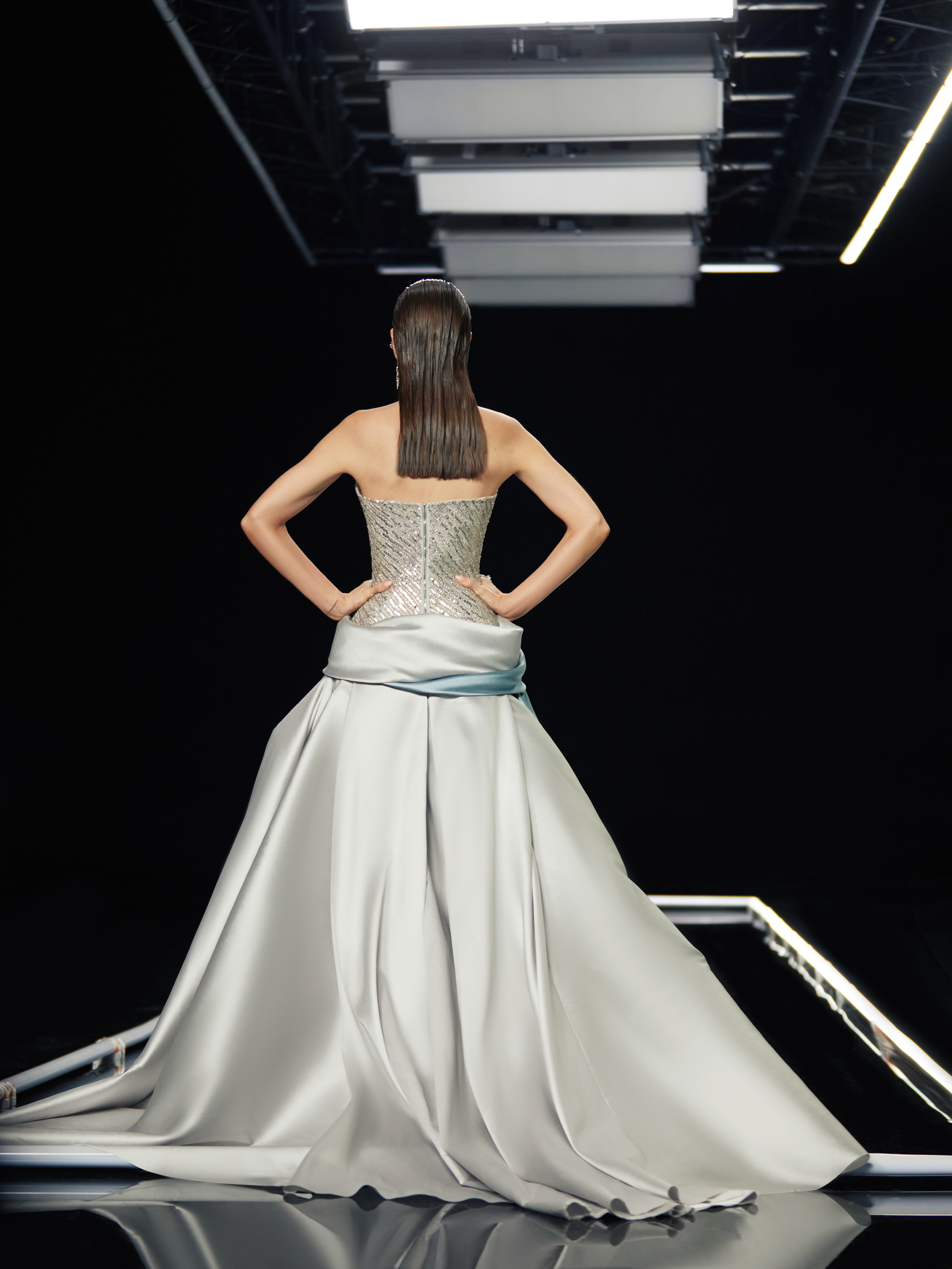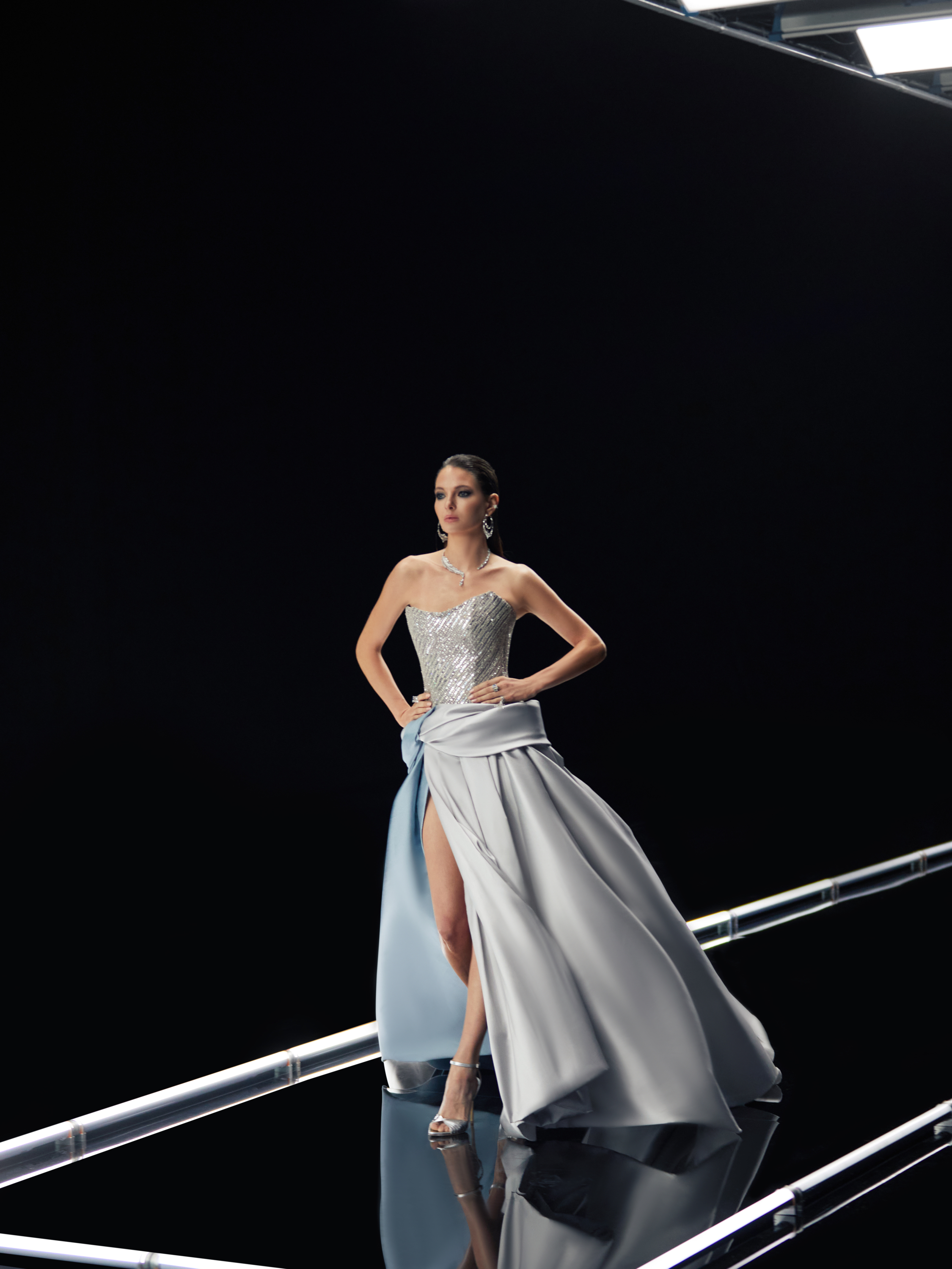 A maxi dress with a dramatic voluminous taffeta skirt looks understated and elegant in grey-blue tones. The corset bodice, decorated with silver sequins, draws attention to the collarbones. Smooth draping at the hips visually makes the waist slimmer and more refined. The dress fastens with a concealed zipper at the back.