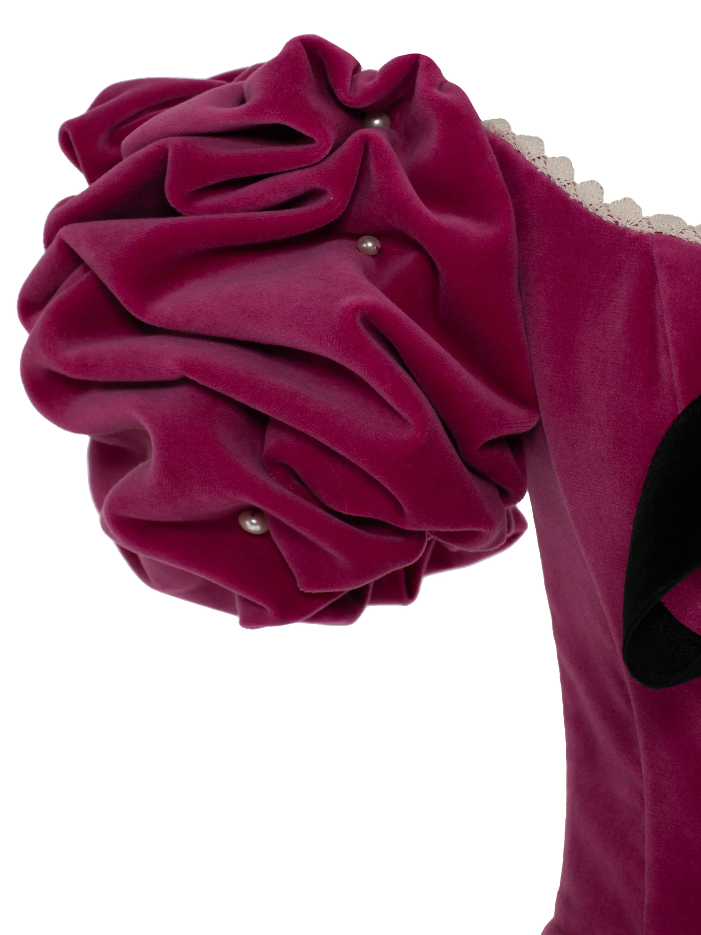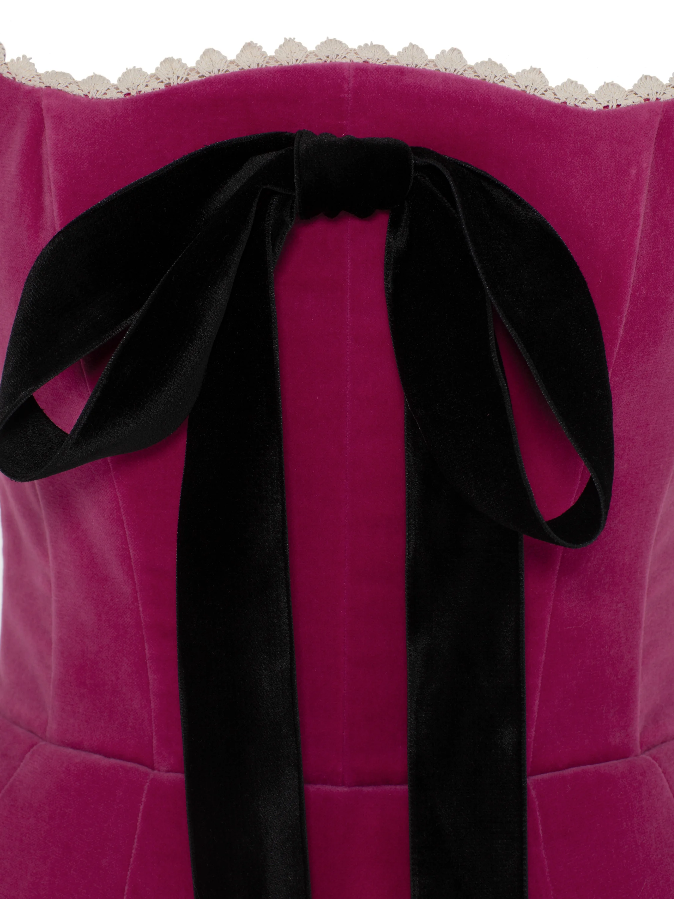 The corset mini dress with voluminous puff sleeves is made of pink velvet fabric. The piece is complemented by a contrasting black bow at the bust, pearl-bead embroidery on the sleeves and delicate lace trim along the edge. The dress fastens with a zipper at the back.