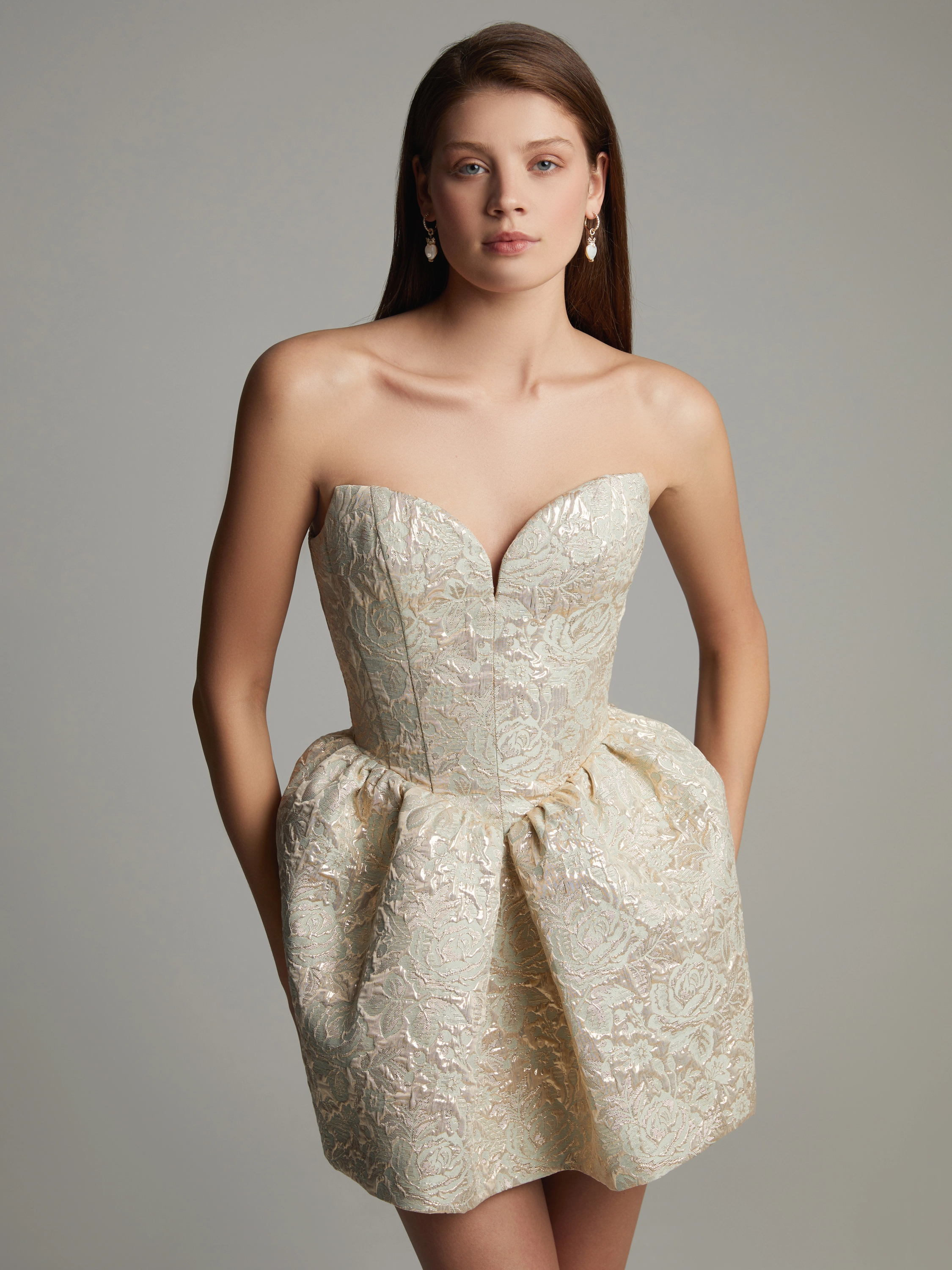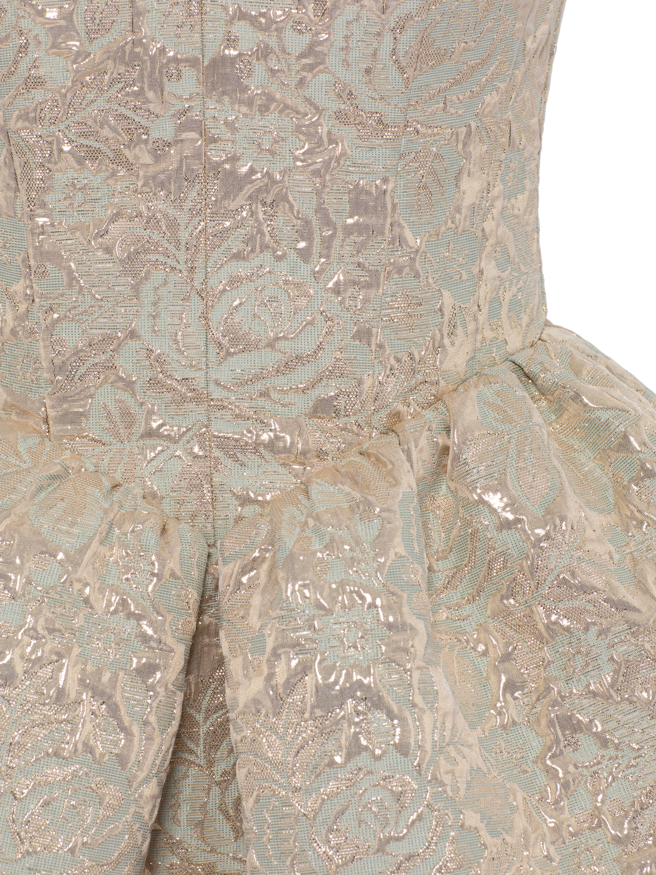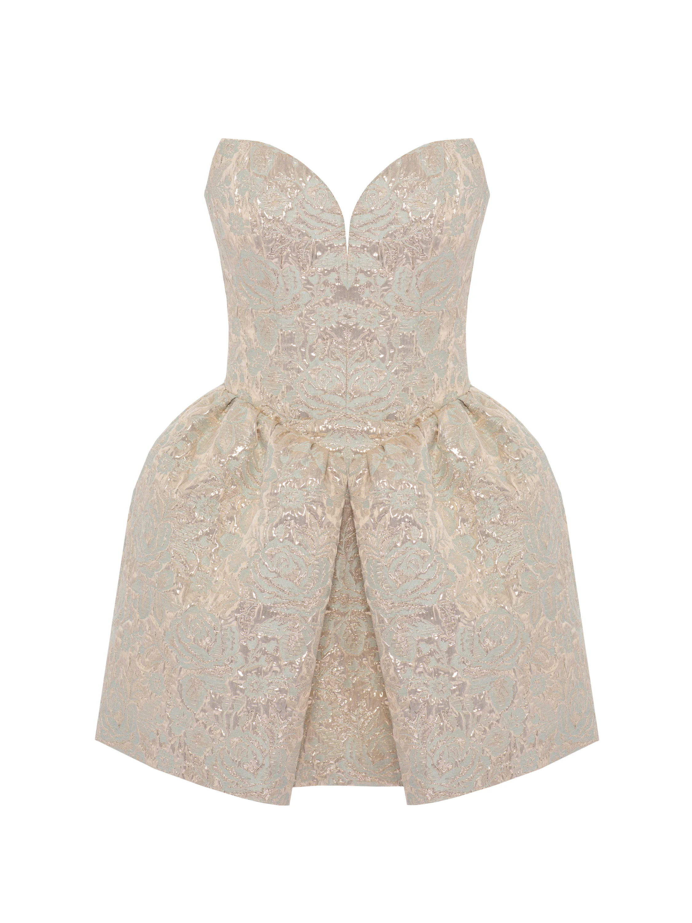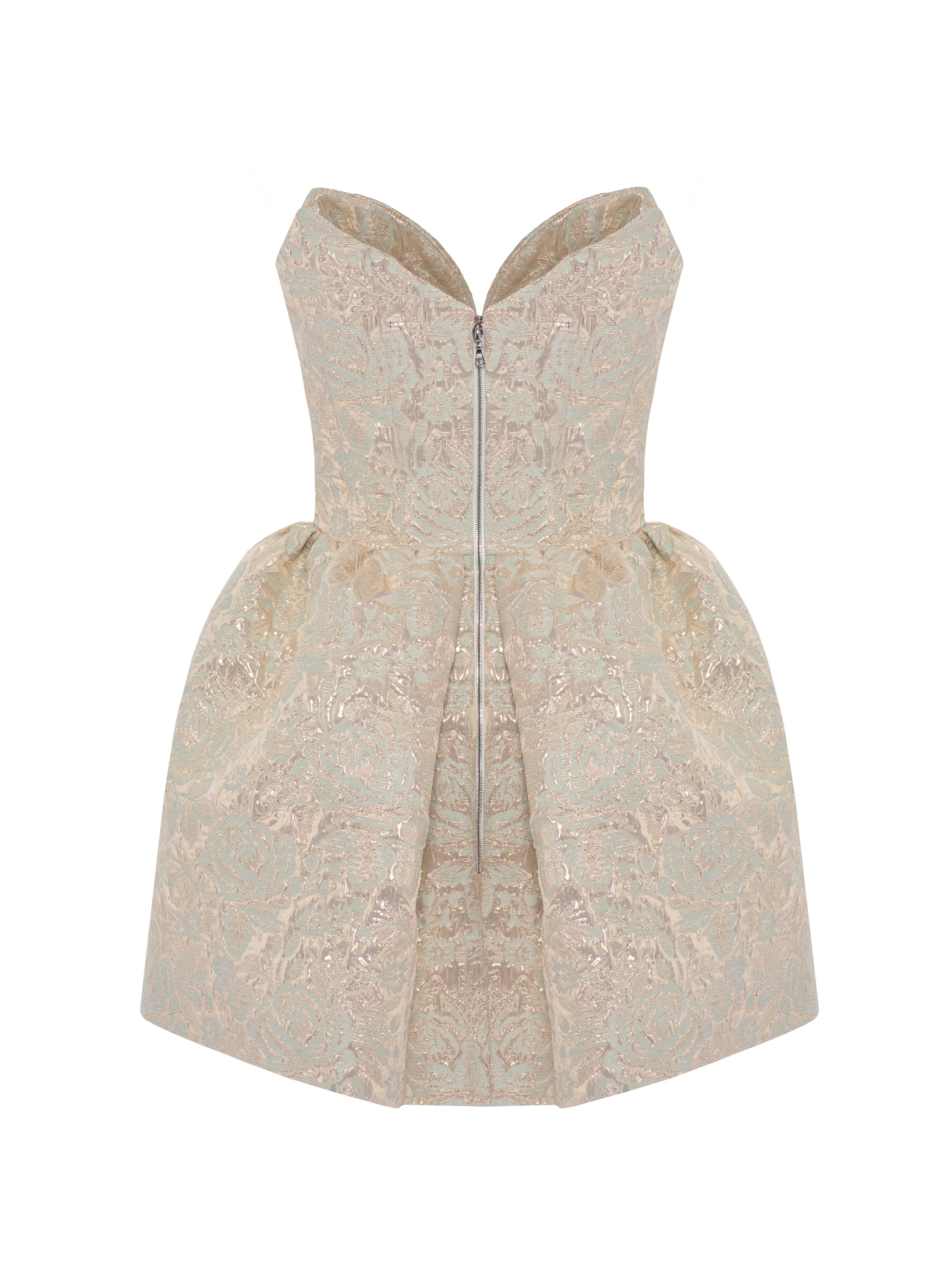 A beige brocade mini dress with a raised golden pattern is an elegant option for the evening. The model with an open heart-shaped corset bodice adds emphasis to the décolleté area. The waist is gracefully accentuated by making the skirt fuller with pleats.