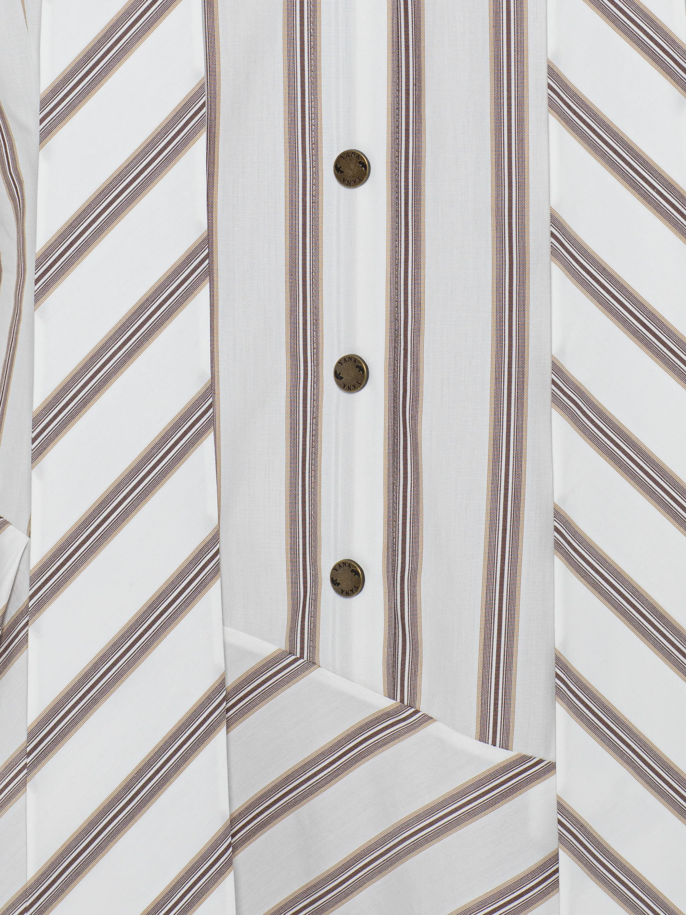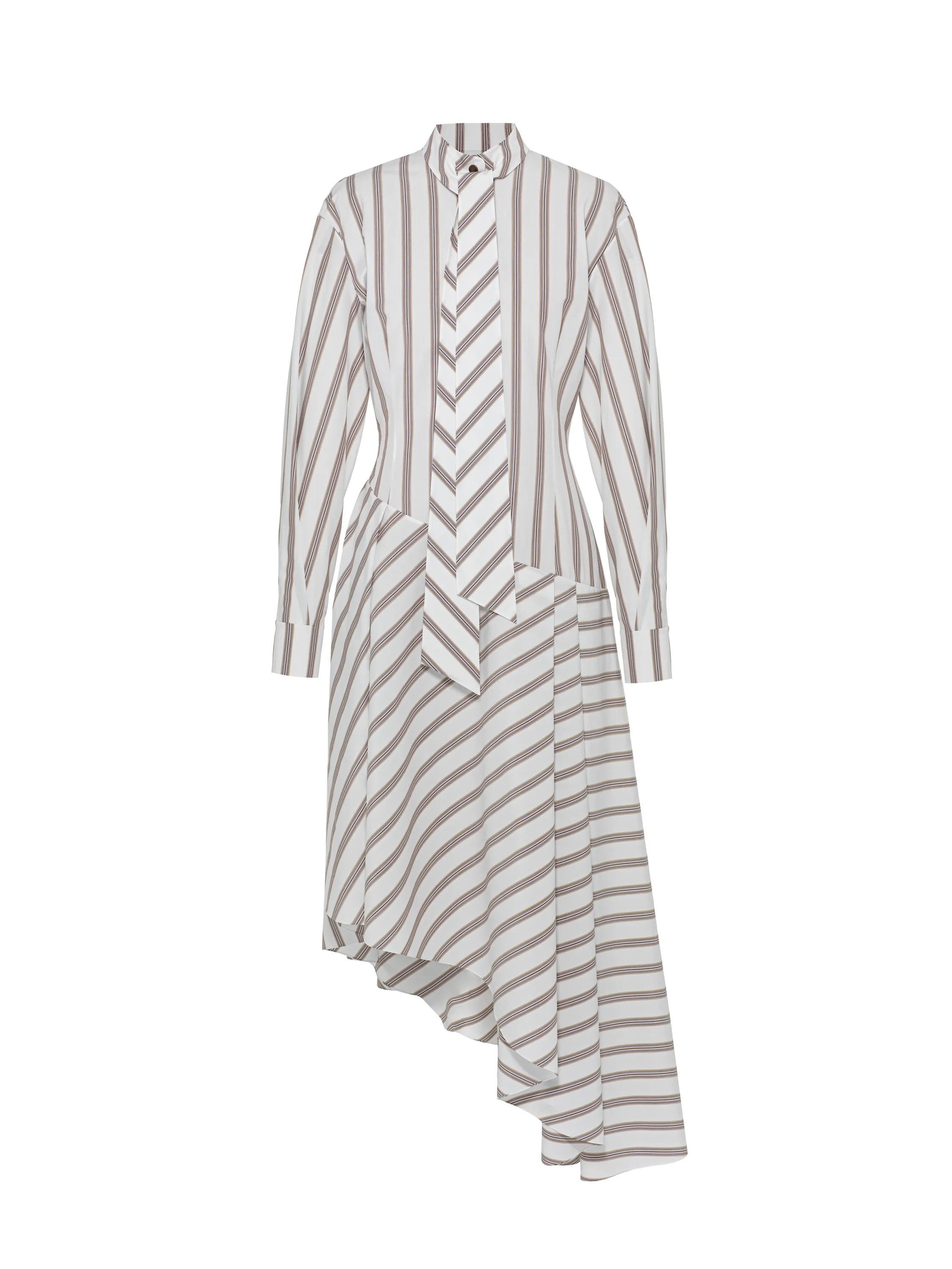 The white midi dress with an asymmetric skirt is made of soft, lightweight cotton with a brown stripe, pleasant to the touch. The stand-up collar with wide ties makes the understated design feminine and romantic. Complete the look with elegant stiletto pumps.
