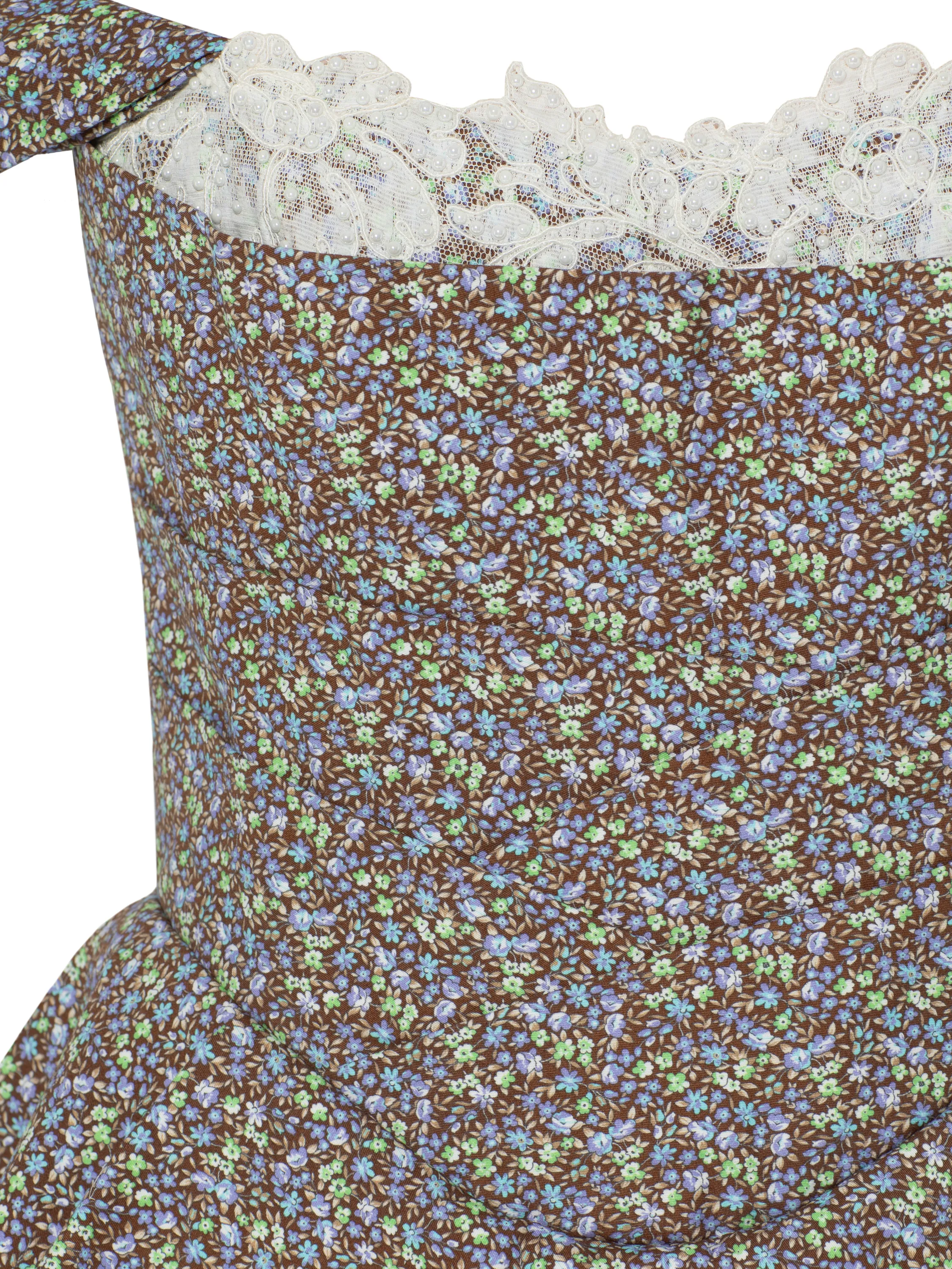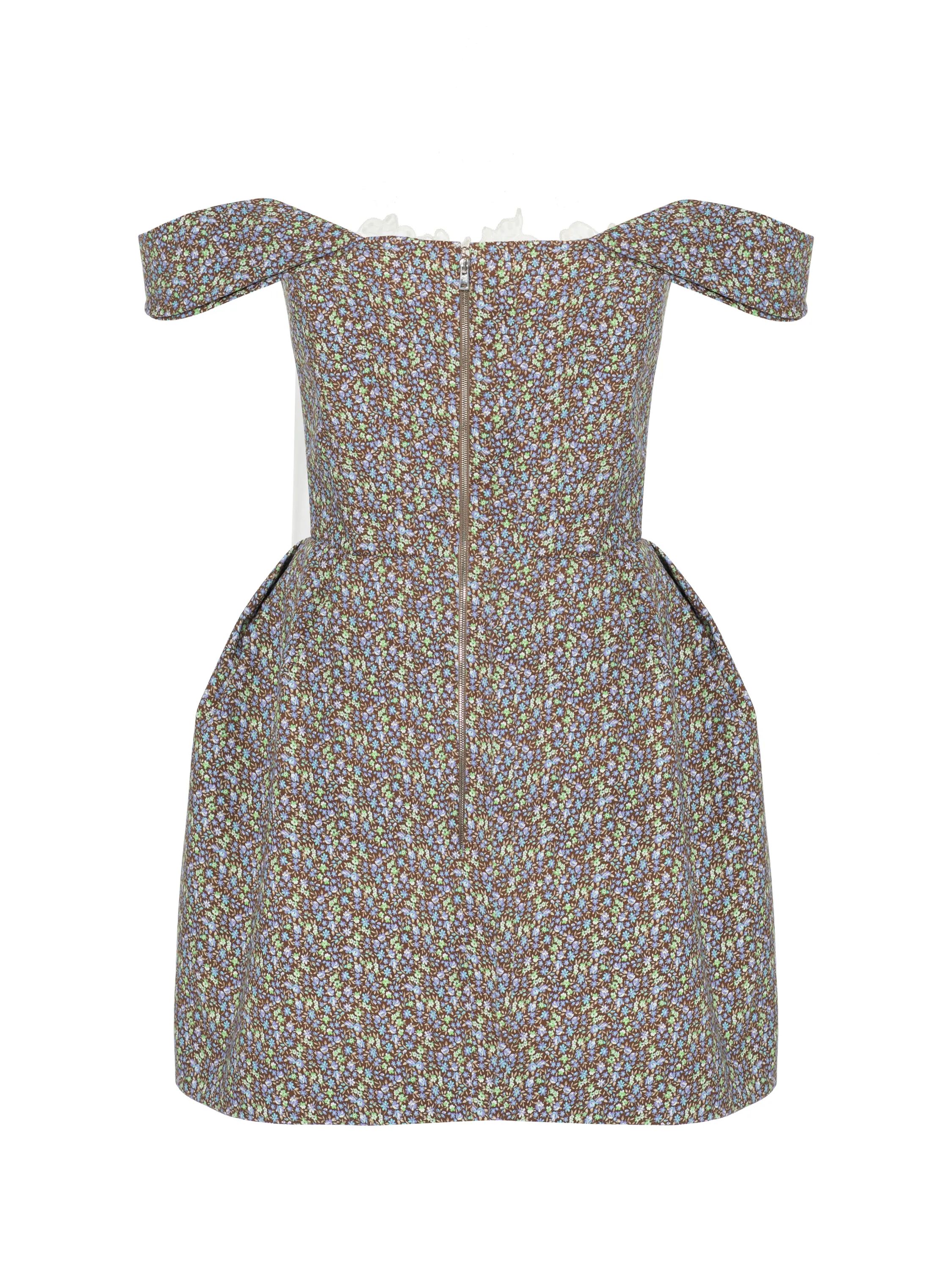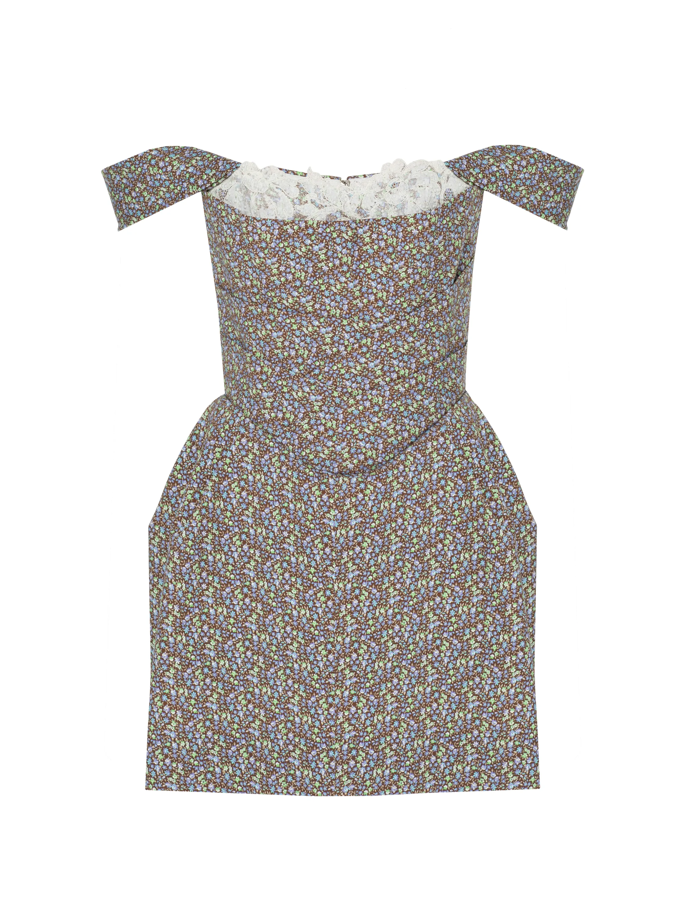 A minimalist mini dress with an open shoulder line is made of brown cotton fabric with a floral pattern. The top of the piece is highlighted by delicate white cord lace and a statement drape. Fastens with a zipper at the back.