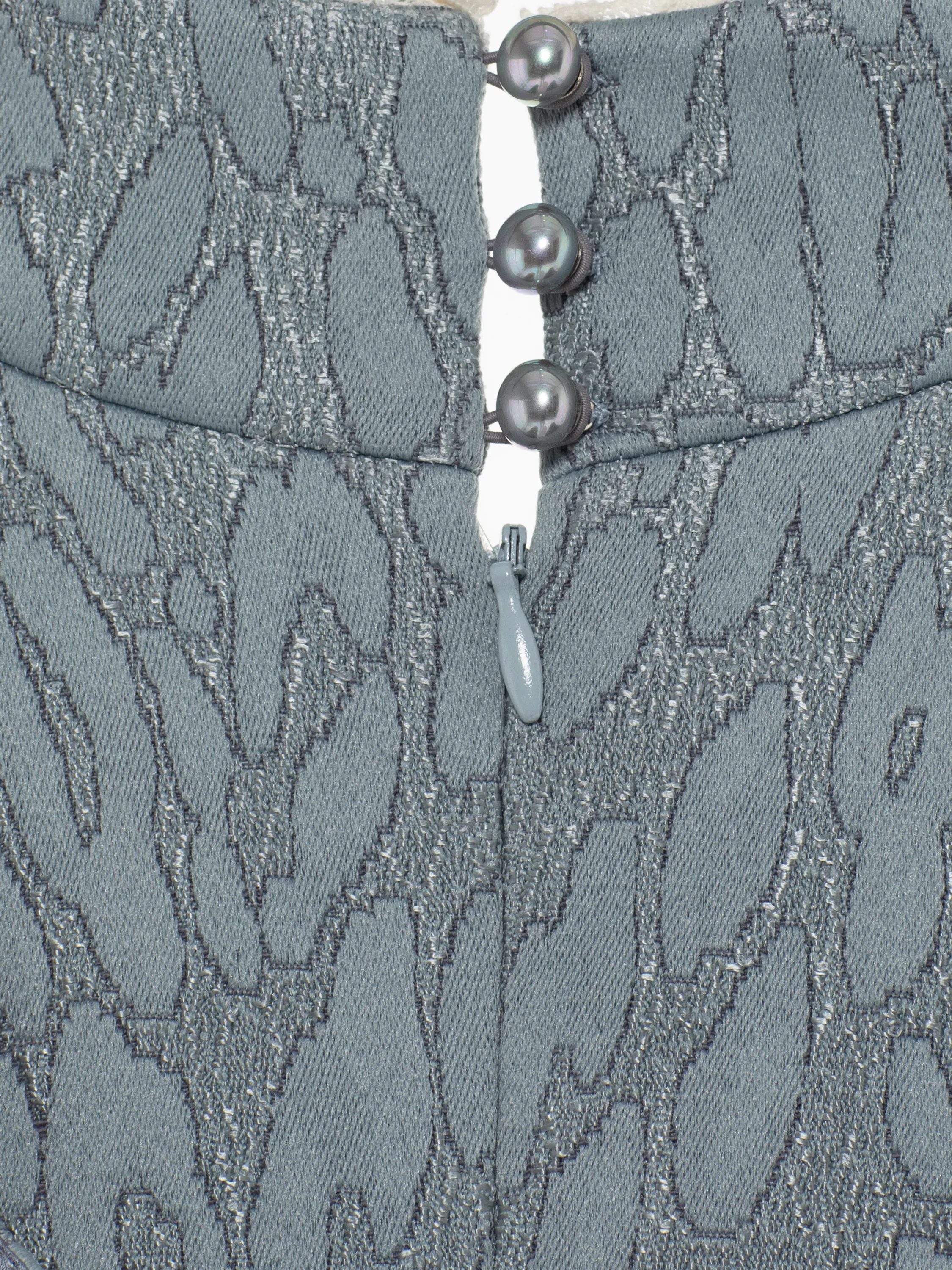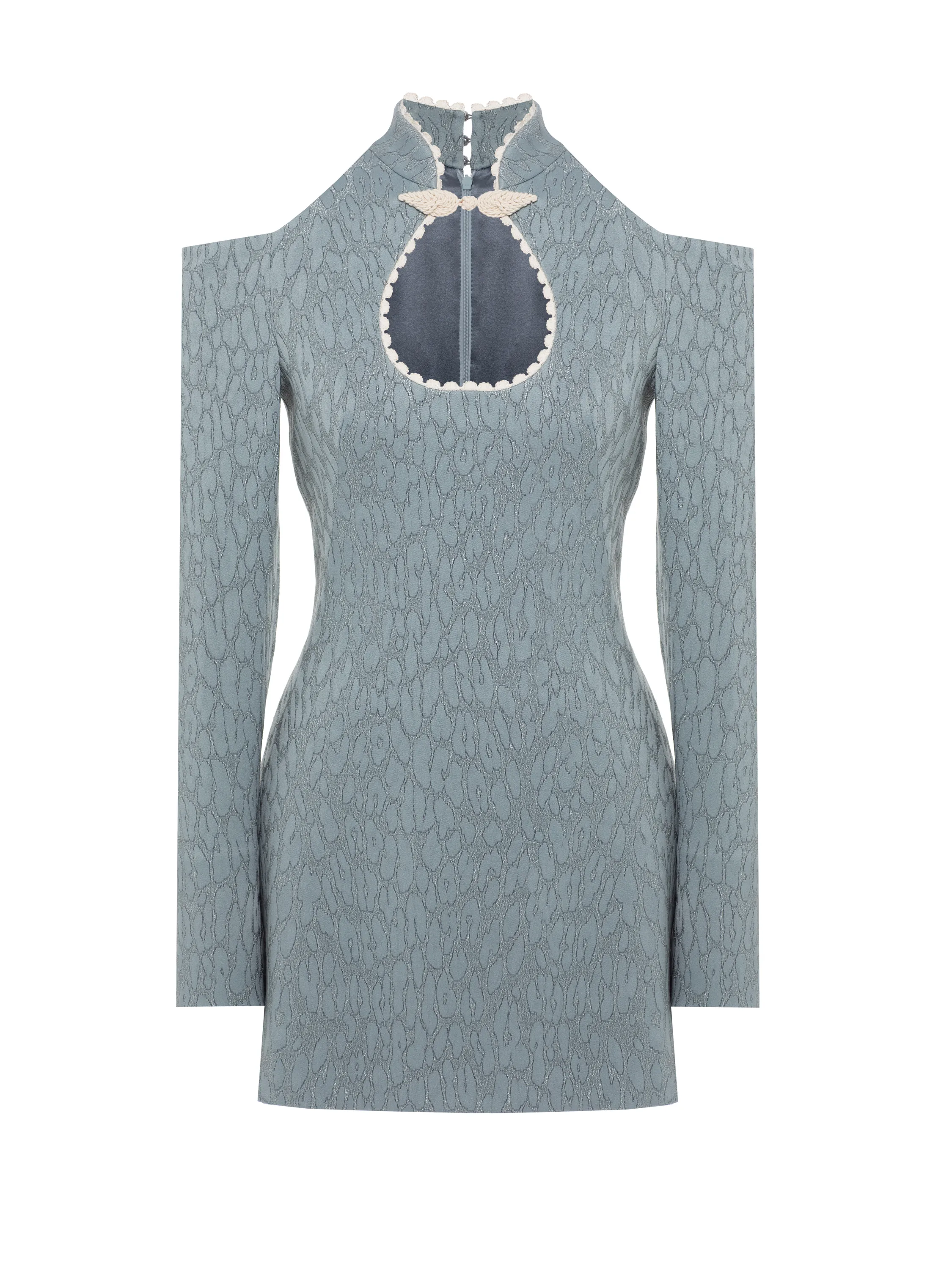 The grey mini dress in an oriental style is made of jacquard fabric with a leopard pattern. The model is complemented by a stand-up collar and long sleeves with cut-outs at the shoulders. The neckline is decorated with delicate white lace trim. The dress fastens with a back zipper.